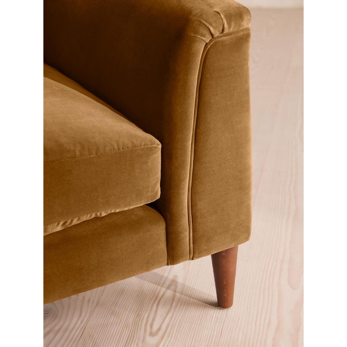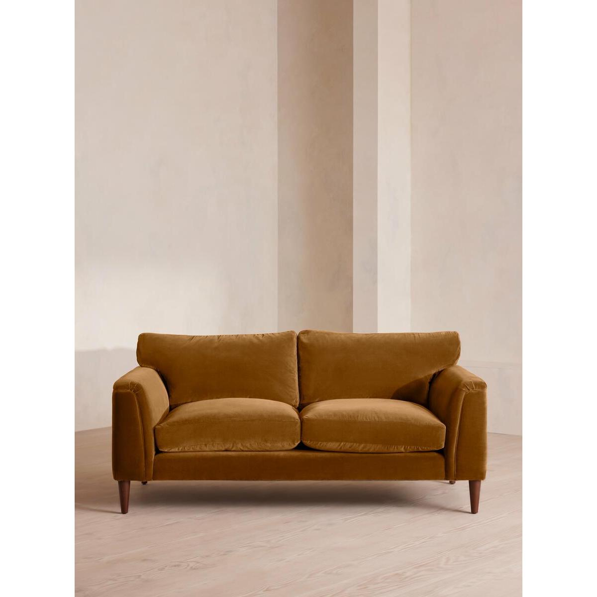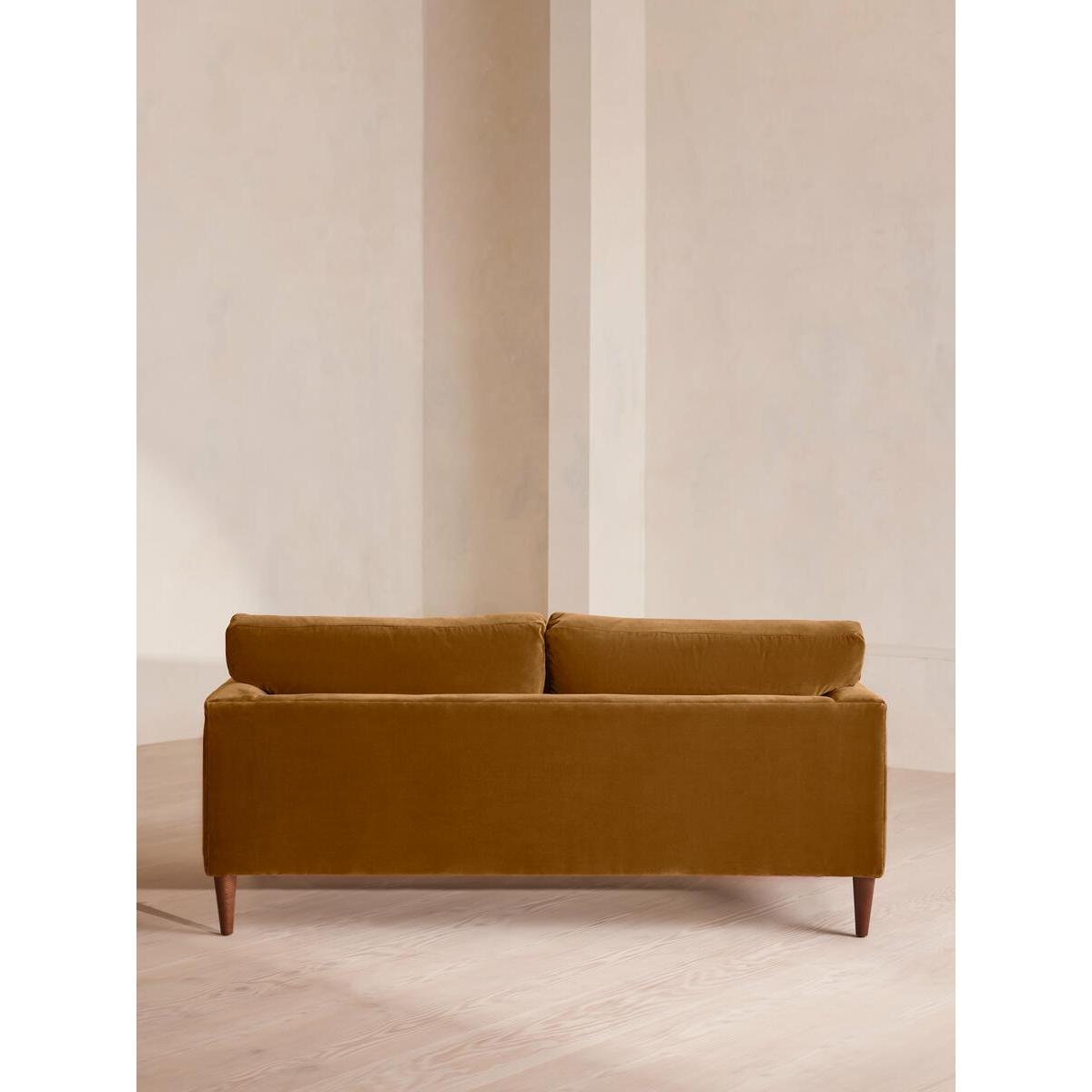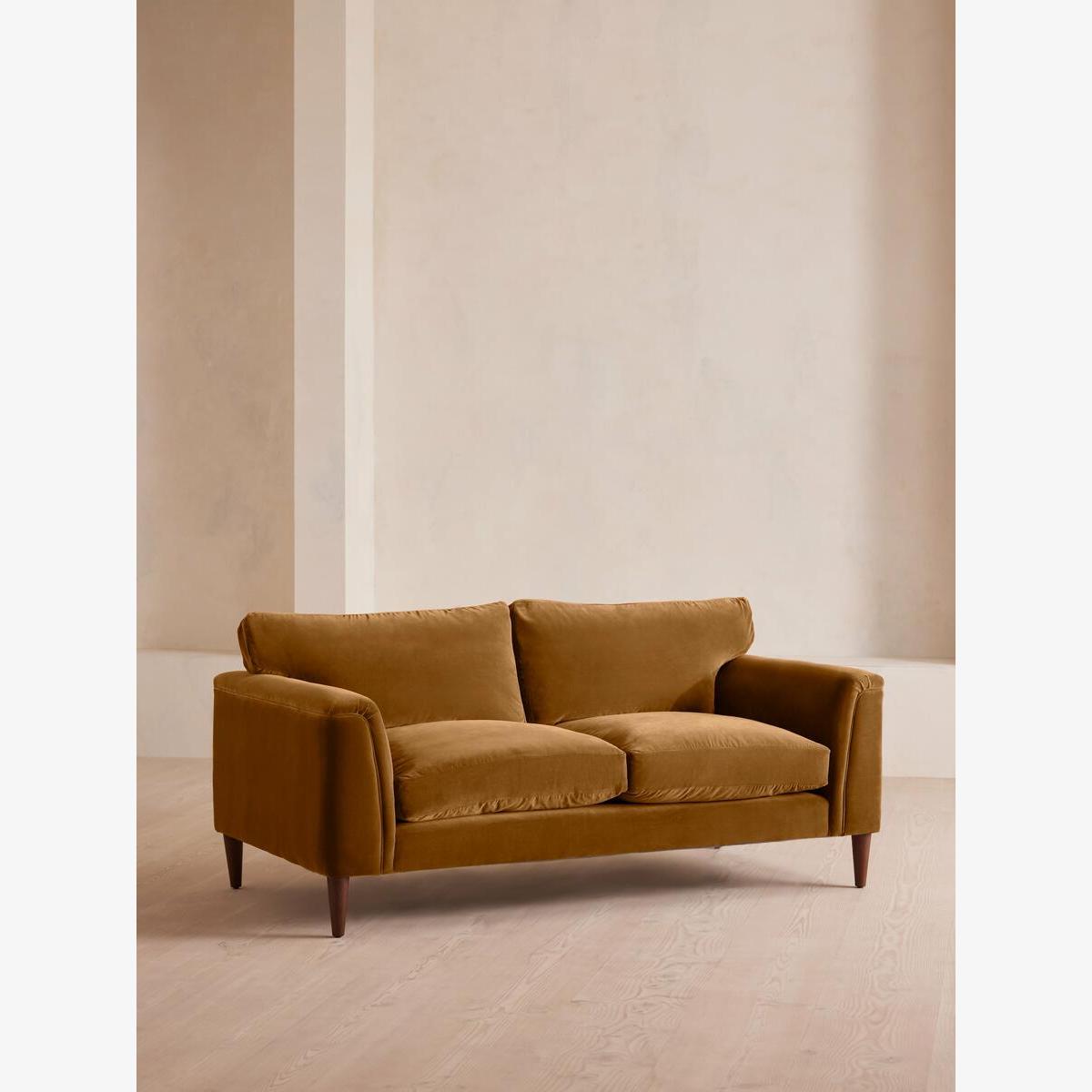 Our Reya sofa invites you to sink into its comfortable, cushioned curves for only relaxing moments in mind. The mid-century design takes inspiration from similar interiors seen throughout DUMBO House, with velvet upholstery and turned walnut legs that lift this sofa off the floor creating the illusion of more space. Pair with our Reya ottoman and loveseat for the full look. Two-seater sofa Upholstered in cotton velvet Available in other colours and fabrics Mid-century design Cushioned armrests Slender turned walnut legs Foam core feather-wrapped seat cushions Inspired by DUMBO House, Brooklyn