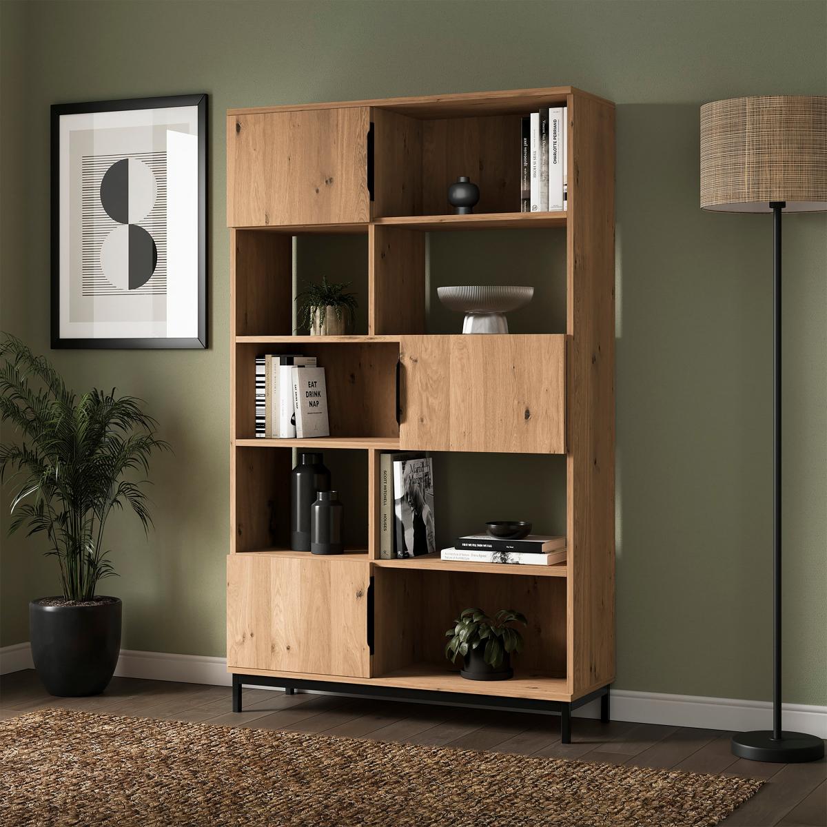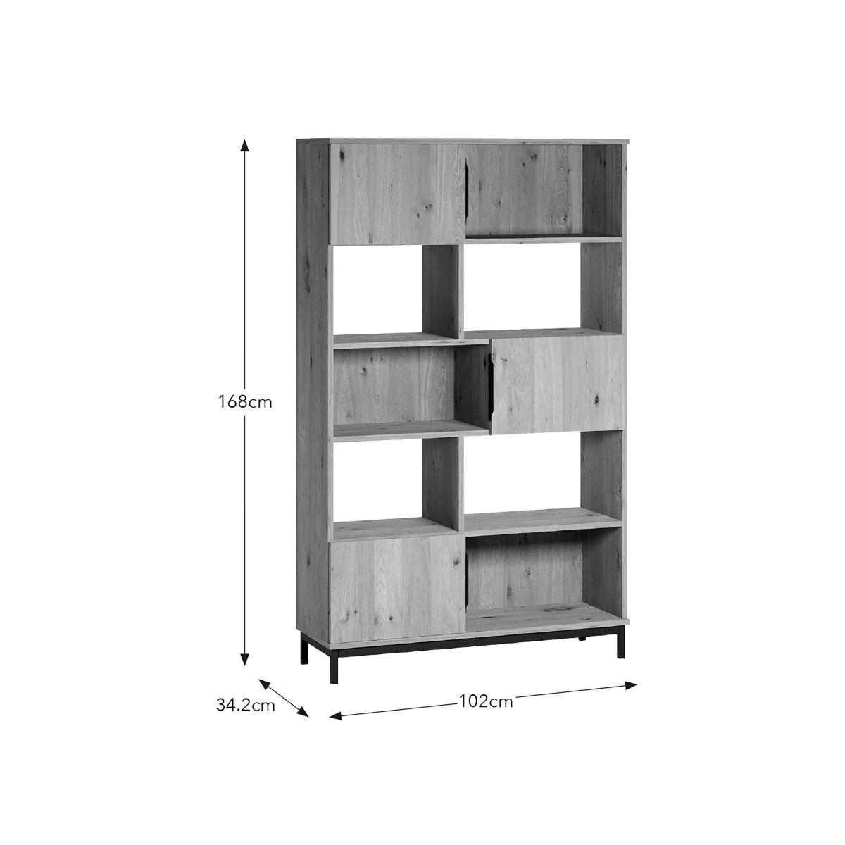 * Oak frame* Metal legs* Interchangeable handles This shelving unit offers ample storage space with a stylish design. The rustic oak effect finish provides a warm, natural look that complements various decor styles. This shelving unit is perfect for displaying books, decorative items, or other household essentials. Its sturdy construction ensures durability, while the open design allows for easy access and organisation.