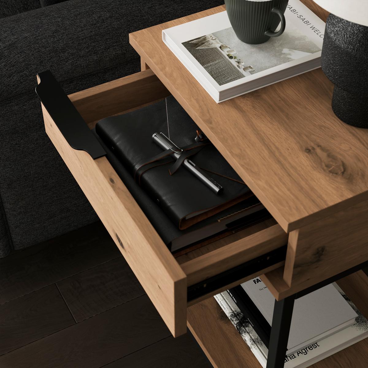 * Oak frame* Metal legs* Interchangeable handles This side table is both functional and aesthetically pleasing, making it a great choice for any home. Featuring an interchangeable handle position for left or right configuration, this side table can be customised to suit your needs. The rustic oak effect finish adds a touch of natural beauty to your decor, while the compact design makes it perfect for use as a bedside table or an accent table in your living room.