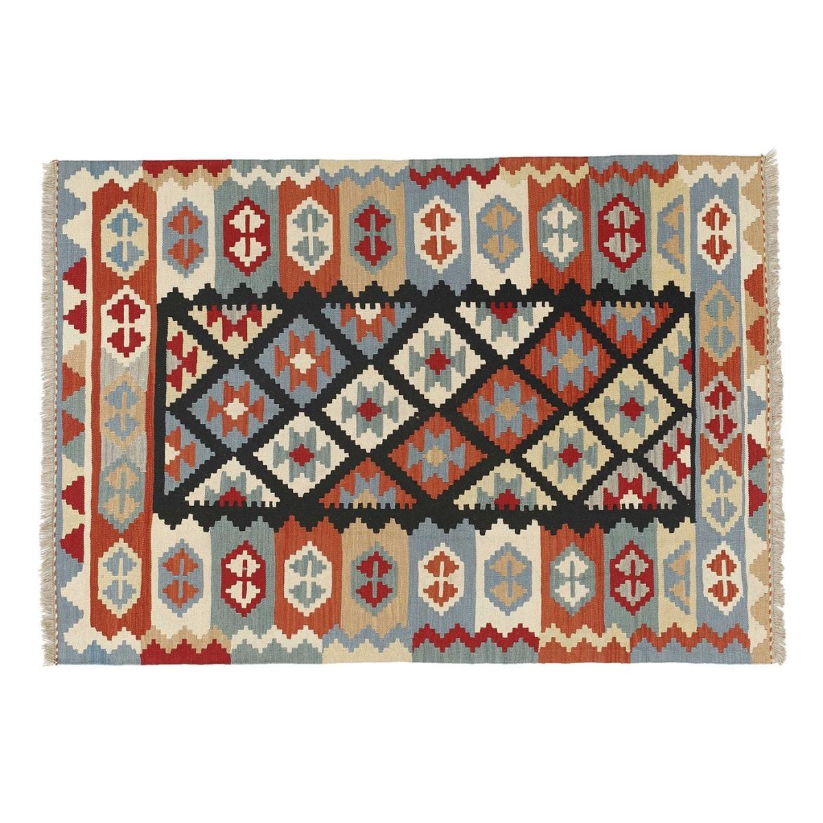I love this Afghan Kelim because of its vibrant colours and geometric pattern, which can easily add a touch of personality to both contemporary and bohemian interiors. Its size makes it versatile for use in living rooms, bedrooms, or even as a statement piece in a hall. Practical styling tips include layering it over neutral flooring to create depth, or pairing it with plain, understated furniture to let the rug's pattern stand out. For a more relaxed vibe, it works well with natural textures like wood and wicker, bringing warmth and visual interest without feeling overpowering. Its durable weave also makes it a practical choice for high-traffic areas or spaces where practicality is a priority.
