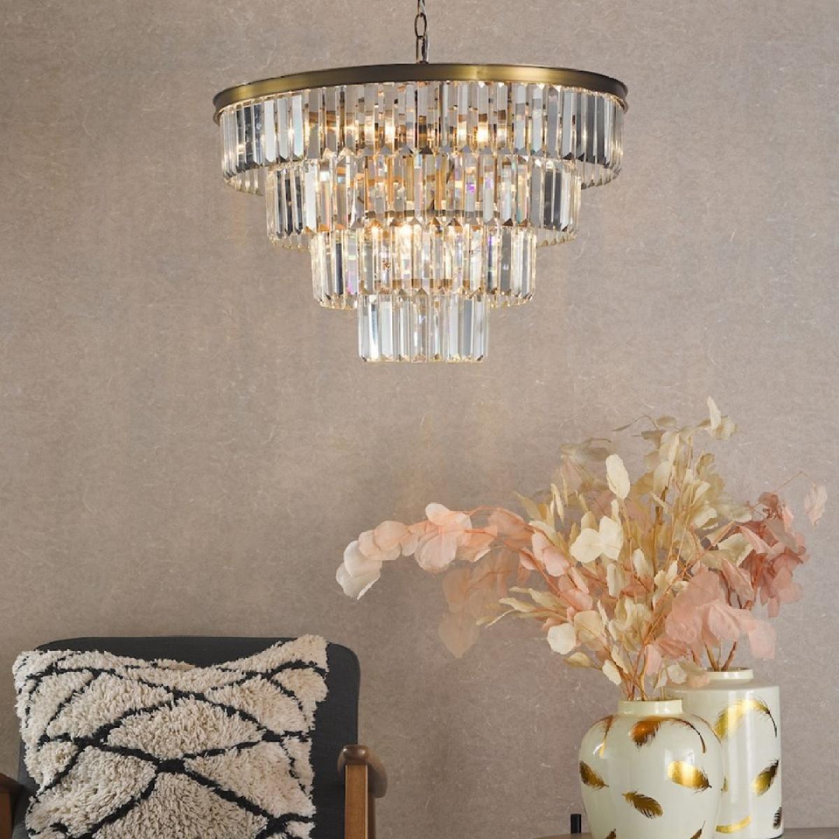 This chandelier is a real statement piece, thanks to its sleek brass finish and tiered crystal design. I’d recommend it for contemporary or glam interiors, particularly in dining rooms or above a large hallway table, where it can really be appreciated. It’s versatile enough to work well with colour schemes ranging from muted neutrals to rich jewel tones, adding a touch of sophistication. Practical styling tips include pairing it with minimalist furniture to highlight its sparkle, or adding warm LED bulbs to enhance the brass and crystal details. Keep surrounding decor simple to let the chandelier shine, and consider using dimmable lighting so you can adjust the ambience for different occasions.