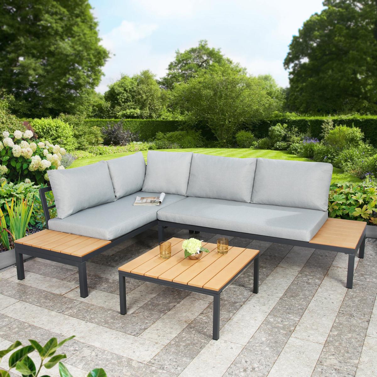 Transform your outdoor living space into a haven of relaxation and style with our exquisite 4-person garden corner sofa. Designed to elevate your patio or deck, this contemporary masterpiece seamlessly blends the durability of a black steel frame with the warmth and natural appeal of a wood platform. Whether you're hosting a lively gathering or seeking a tranquil escape, this outdoor corner sofa is the perfect centerpiece for your outdoor haven. Indulge in the ultimate comfort as you sink into the plush, generously padded cushions. Crafted with weather-resistant materials, these cushions ensure lasting enjoyment, even in the face of the elements. Their elegant grey hue complements the modern design, creating a sophisticated and inviting atmosphere. This platform corner sofa isn't just about style and comfort, it's also built to last. The sturdy steel frame and robust polywood platform are designed to withstand the rigors of outdoor use, ensuring years of enjoyment. The modular design allows for versatile configurations, so you can adapt the layout to suit your space and preferences.