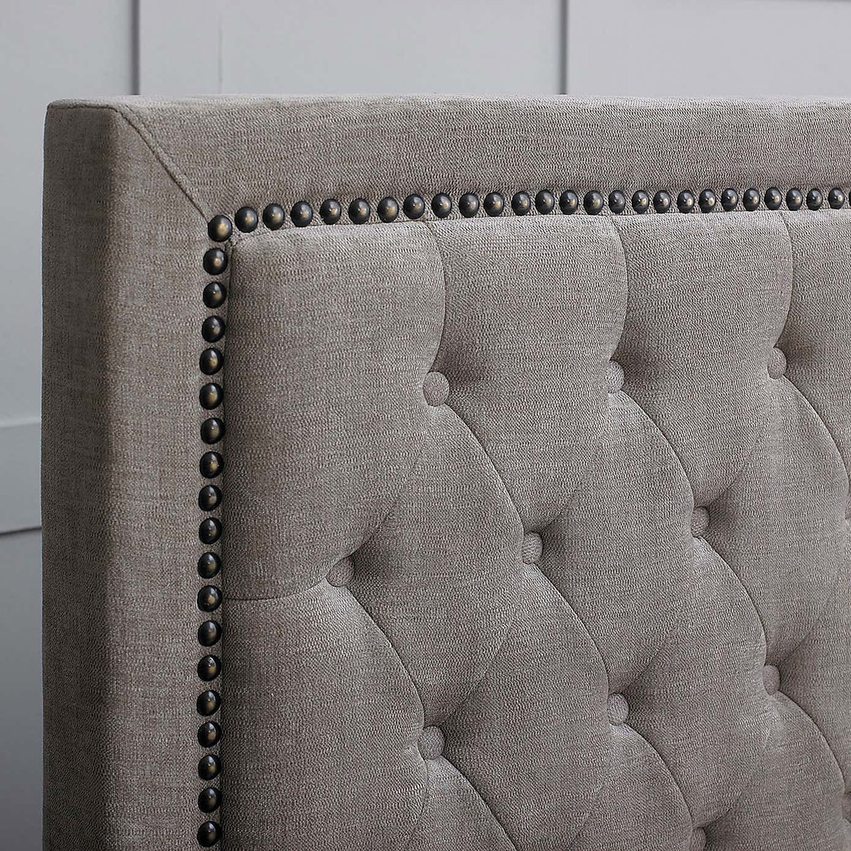 The Rhea Mink Bed Frame utilises several features to ensure that you’ll sleep both in comfort and in style. A large headboard featuring both classic button tufting and modern studded detailing will provide your bedroom with a sense of contemporary class, whilst a flat slatted base offers high levels of natural support whilst you sleep. A stunning Mink Velvet fabric upholstery works adds a real touch of elegance that will work amongst a wide variety of bedroom decors. Please note, unfortunately we cannot deliver this item to the Channel Islands.