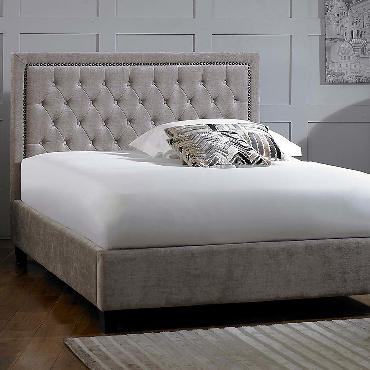 I love the Rhea mink velvet bed for its luxurious and inviting texture, which can instantly elevate a bedroom’s aesthetic. Its grey hue offers versatility, making it suitable for both contemporary and traditional interiors. It’s an excellent choice for creating a sophisticated and calming bedroom environment. For styling tips, pair it with soft, neutral linens and add layered cushions in complementary tones or subtle metallics for a touch of glamour. To keep the velvet looking its best, consider using a protective spray, and opt for beds with simple, clean-lined bedside tables and minimalist lighting to highlight the bed’s elegant headboard. It works well in spaces that aim for a refined, tranquil vibe or a modern aesthetic with a touch of opulence.