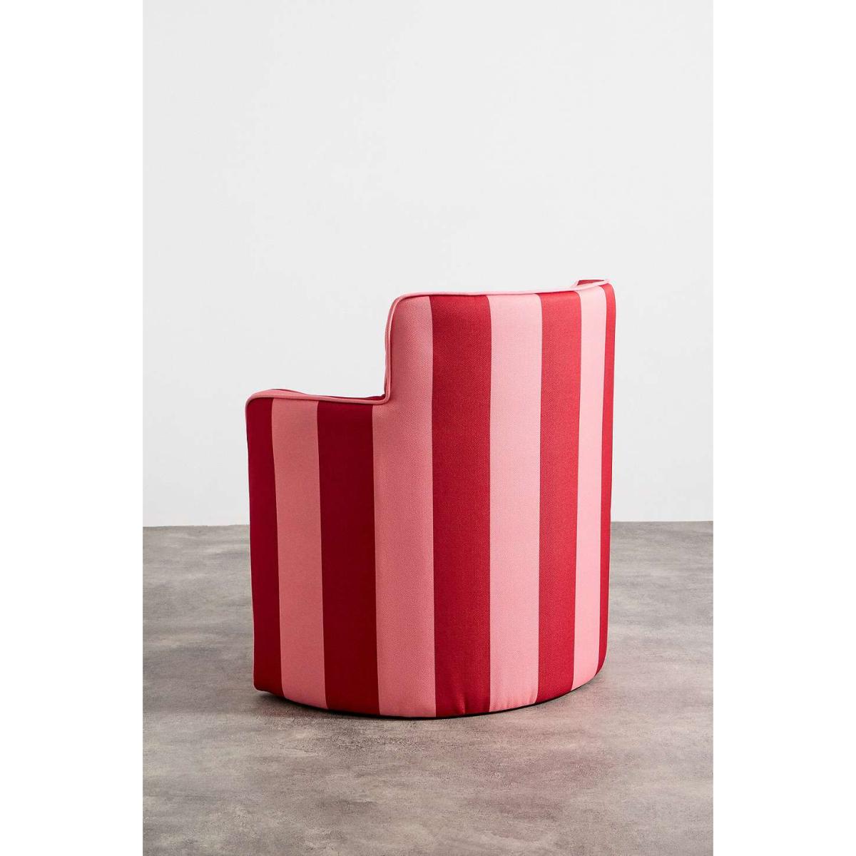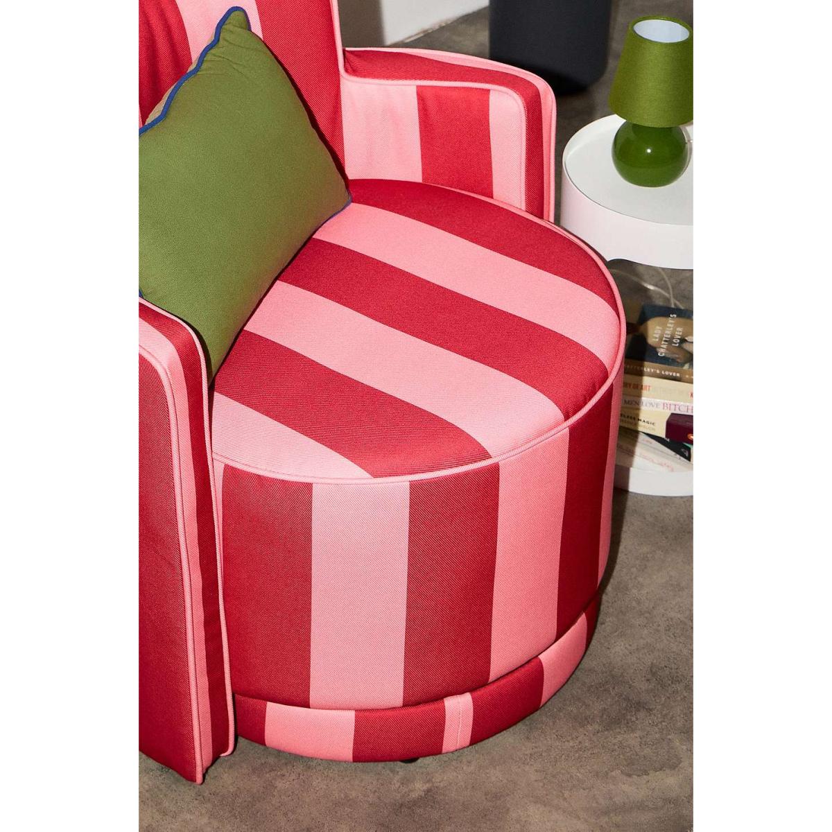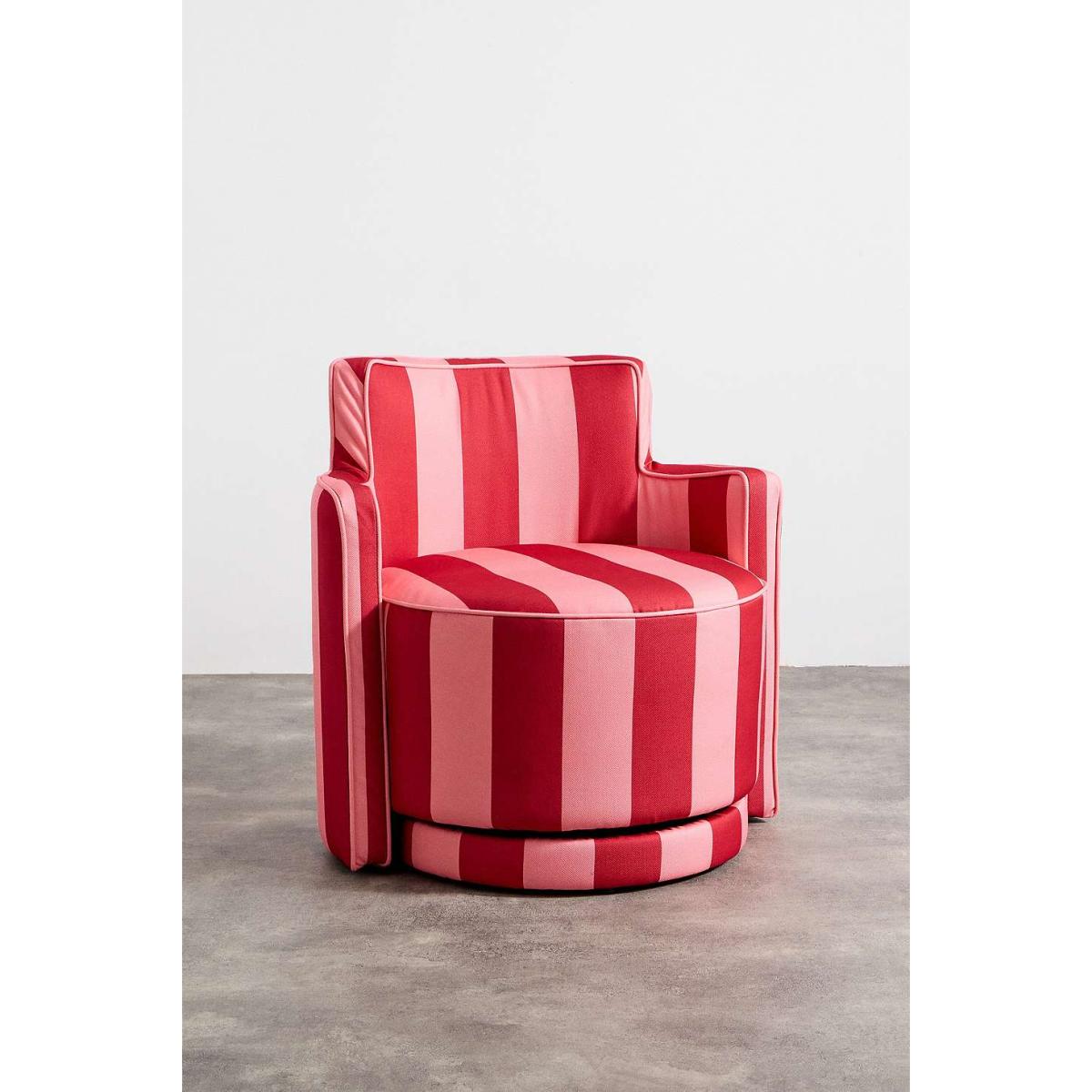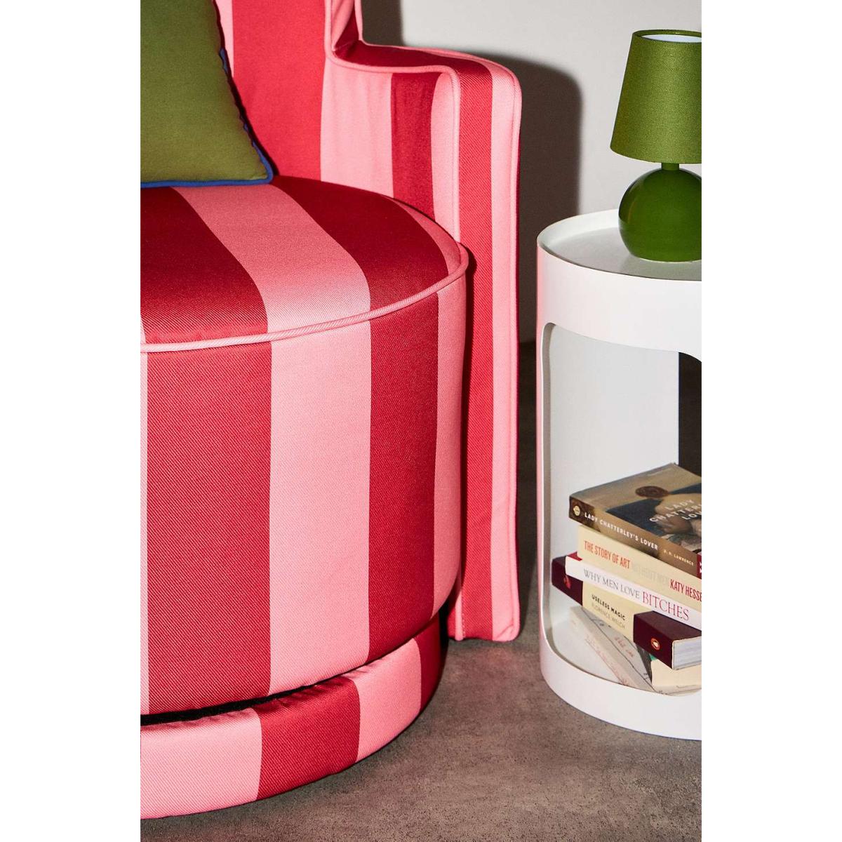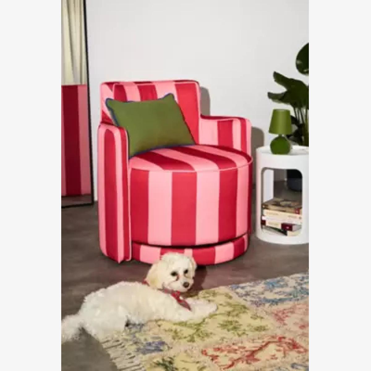 Elevate your living space with this contemporary striped swivel chair. Upholstered armchair complete with a striped fabrication, a circular structure with a cushioned seat and backrest, wrap-around silhouette and armrests. Finished with a swivel base to adjust and rotate to the right spot. *Online return only. This item cannot be returned instore. Please note furniture items currently cannot be shipped to Northern Ireland or The Republic of Ireland. Delivery of large furniture items may take 1-2 weeks and are therefore not eligible for Next Day Delivery.* **Content + Care** \- Upholstered indoor swivel chair with eucalyptus wood frame and iron base \- Spot clean **Size** \- Dimensions: L: 76.2cm x W: 70cm x H: 87.8cm \- Leg height/Clearance: 2.5cm \- Seat height: 44.9cm \- Weight: 55 lbs \- Shipping package dimensions: L: 77.5cm x W: 71.2cm x H: 88.9cm \- Shipping package weight: 60.5 lbs