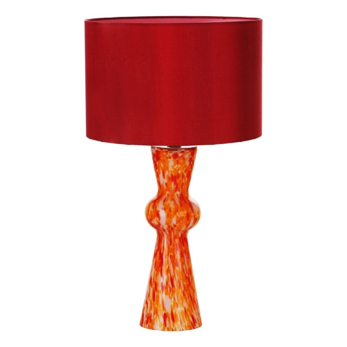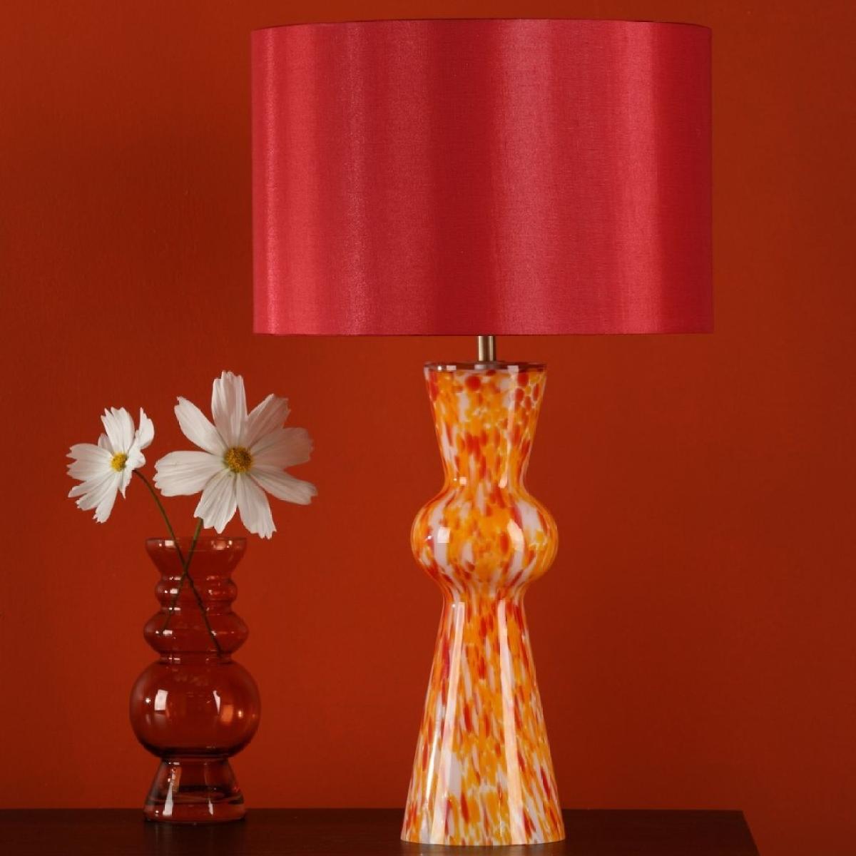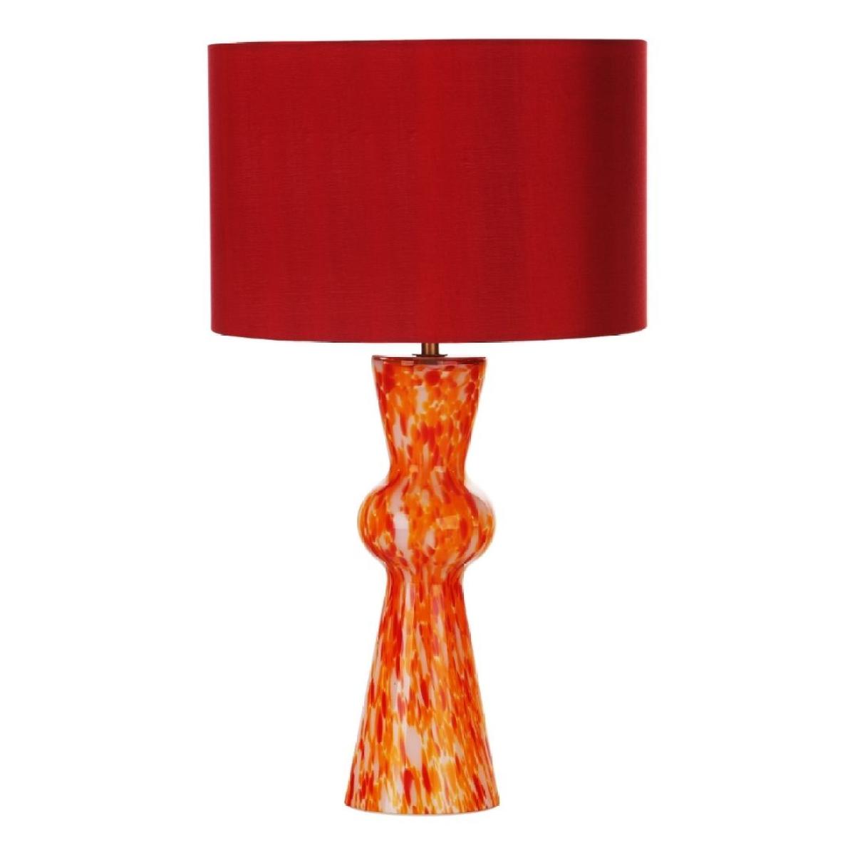 Rheneas table lamp with hand-blown, orange confetti glass base and red drum shade. A dazzling fusion of mid-century charm and contemporary flair, this lamp features a distinctive bow-tie design, reminiscent of mid-century aesthetics, that adds a touch of vintage elegance to any space. The hand-blown red confetti glass, adorned with glass chips in shades of white, orange and pink, creates a mesmerising visual display that captivates the eye. Paired with a red cotton mix shade featuring a pink lining, the Rheneas lamp casts a warm and inviting glow, infusing your room with vibrant energy and personality. Whether placed on a bedside table, desk or console, the Rheneas Table Lamp is sure to be a stunning centerpiece that elevates your interior decor to new heights. Rheneas table lamp with hand-blown, orange confetti glass base and red drum shade. A dazzling fusion of mid-century charm and contemporary flair, this lamp features a distinctive bow-tie design, reminiscent of mid-century aesthetics, that adds a touch of vintage elegance to any space. The hand-blown red confetti glass, adorned with glass chips in shades of white, orange and pink, creates a mesmerising visual display that captivates the eye. Paired with a red cotton mix shade featuring a pink lining, the Rheneas lamp casts a warm and inviting glow, infusing your room with vibrant energy and personality. Whether placed on a bedside table, desk or console, the Rheneas Table Lamp is sure to be a stunning centerpiece that elevates your interior decor to new heights.