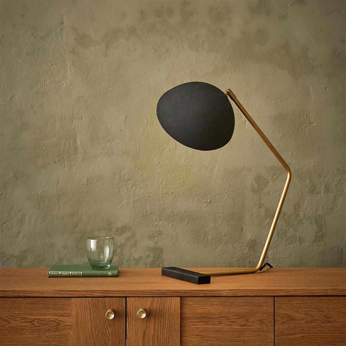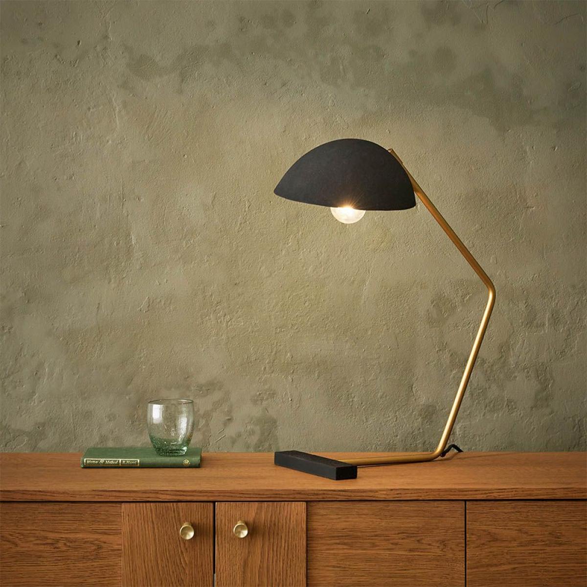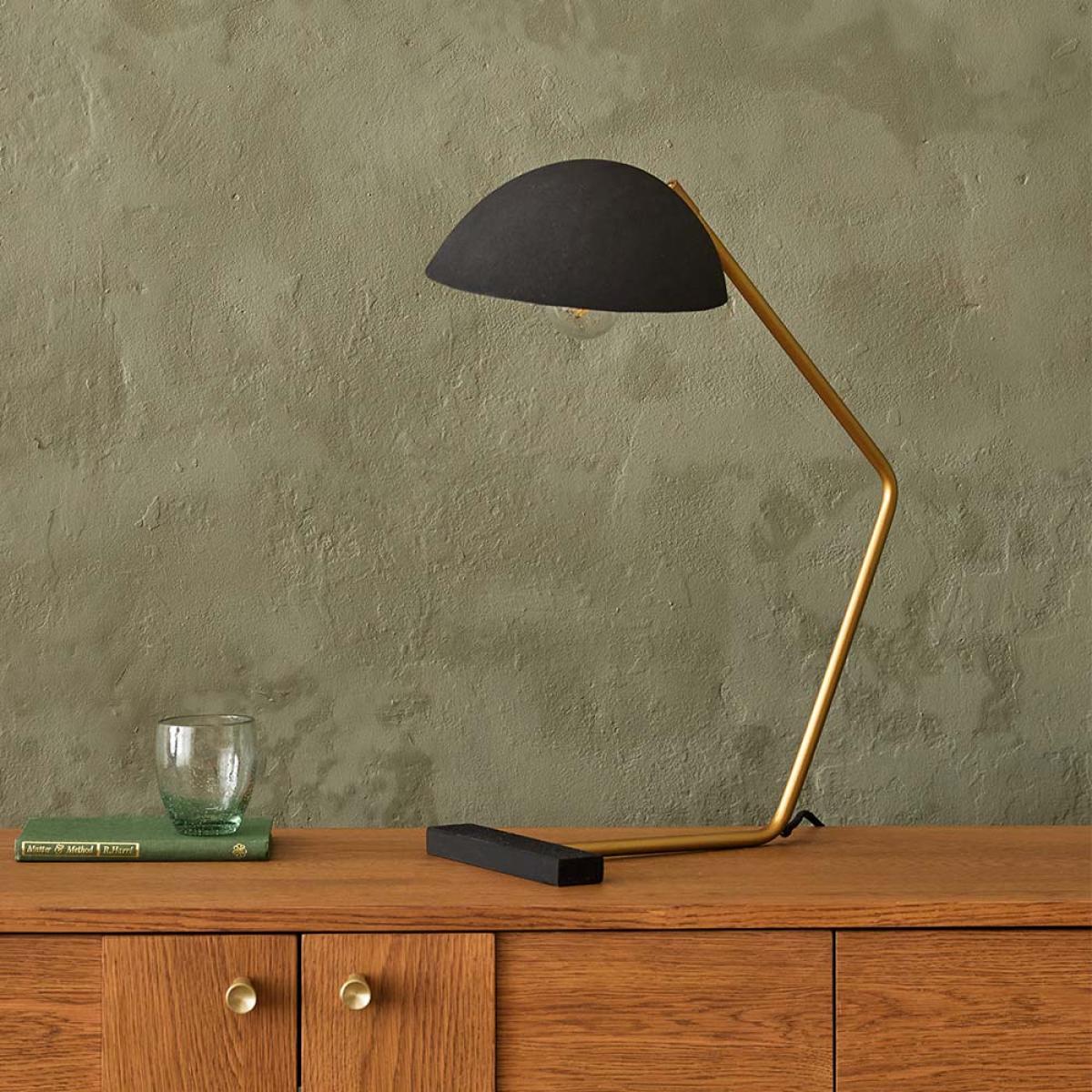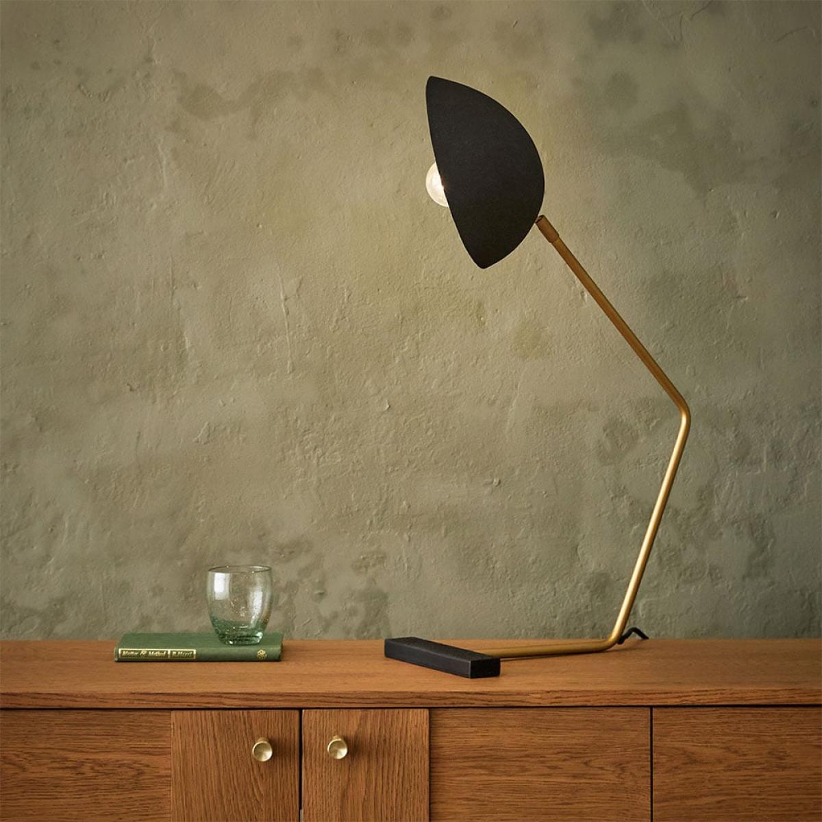 I’m a fan of the Rhett lamp for its clean, slightly industrial lines and muted brass detail - it slots straight into contemporary, Scandi or pared-back mid-century schemes. The adjustable half-dome shade gives just the right focused glow for a desk or bedside table without taking up much visual space. For styling, perch it on a light oak sideboard or minimalist writing desk alongside a neat stack of hardback books and a small ceramic pot plant to balance warmth and texture. Its slender profile means you can pair it with a wall mirror or framed print behind without the surface feeling crowded.