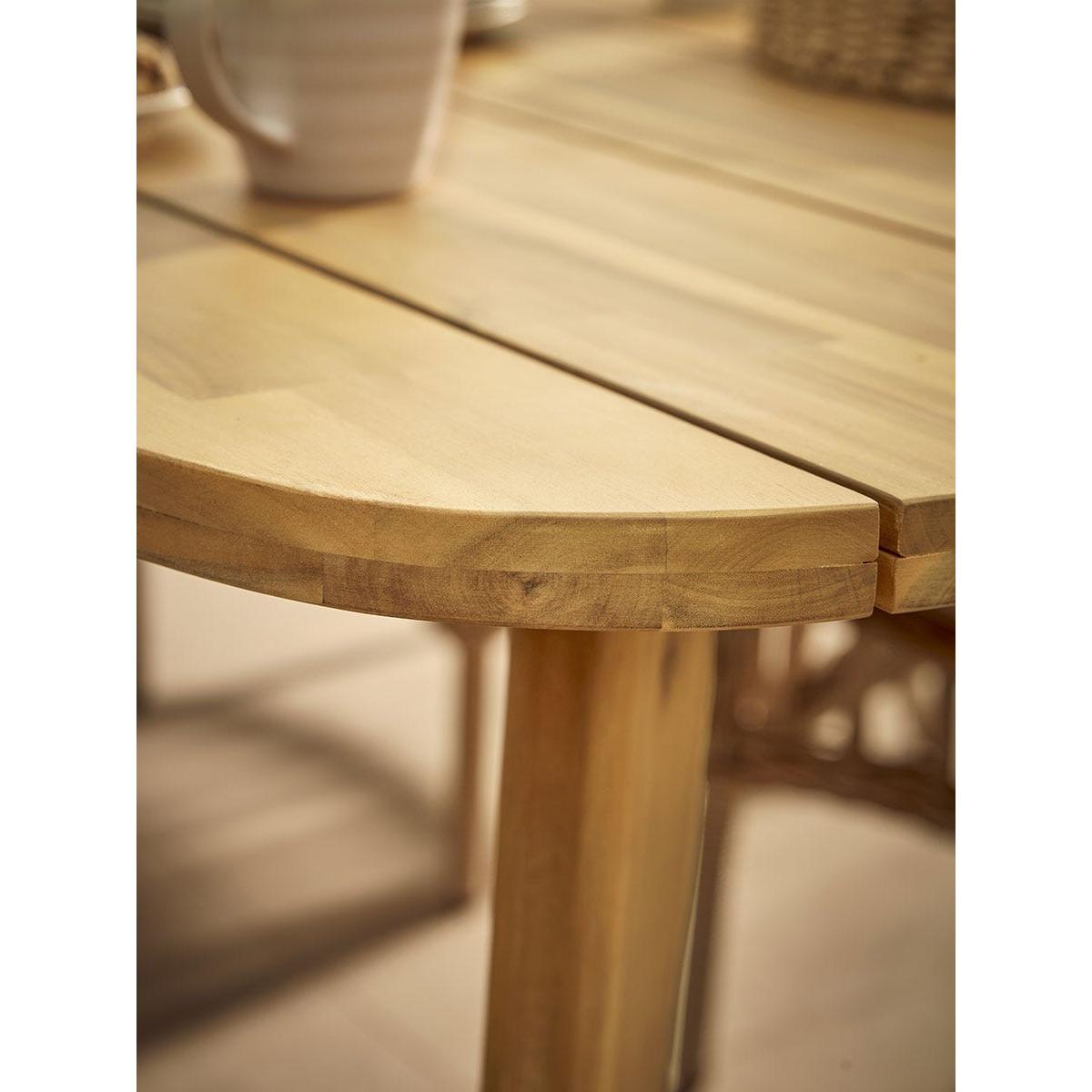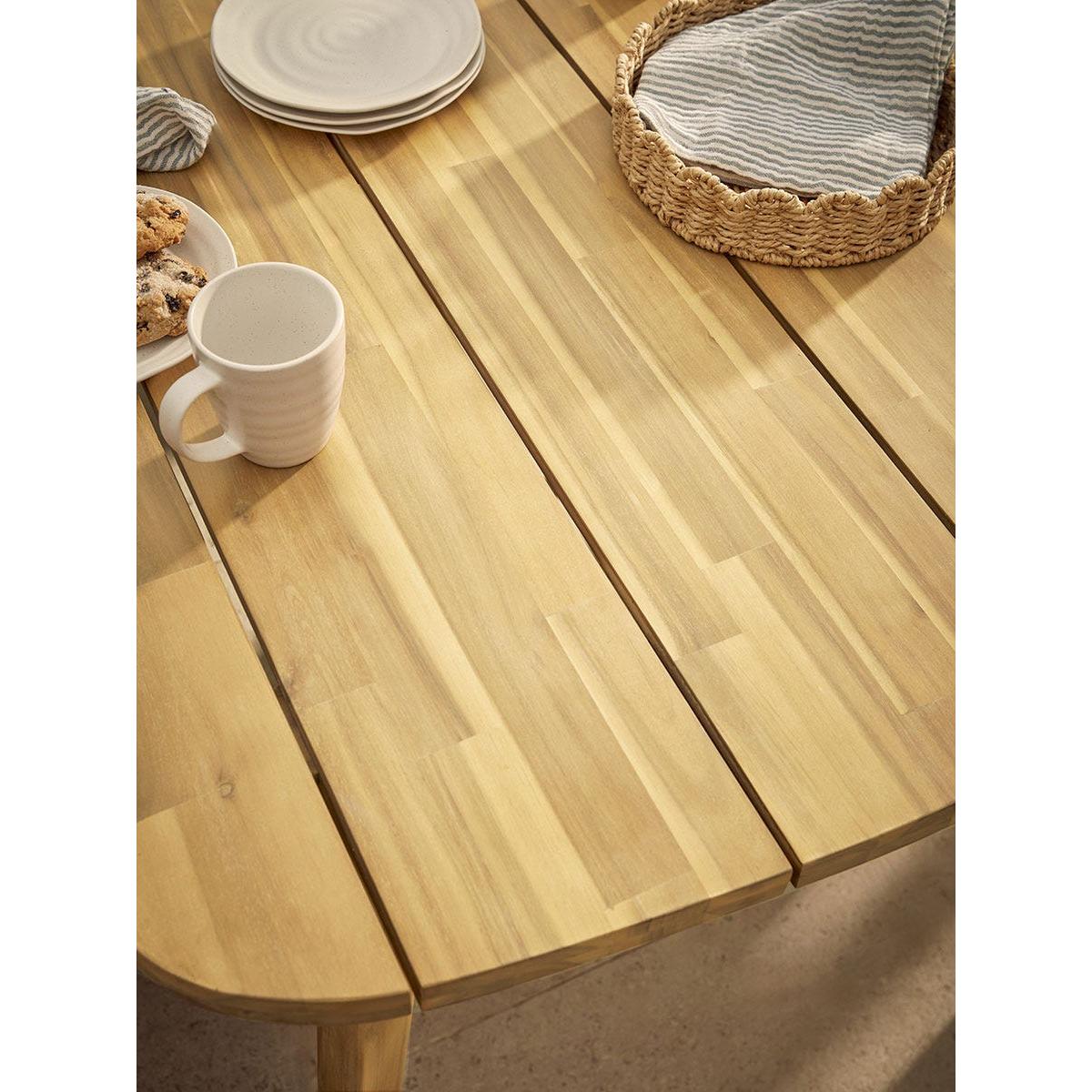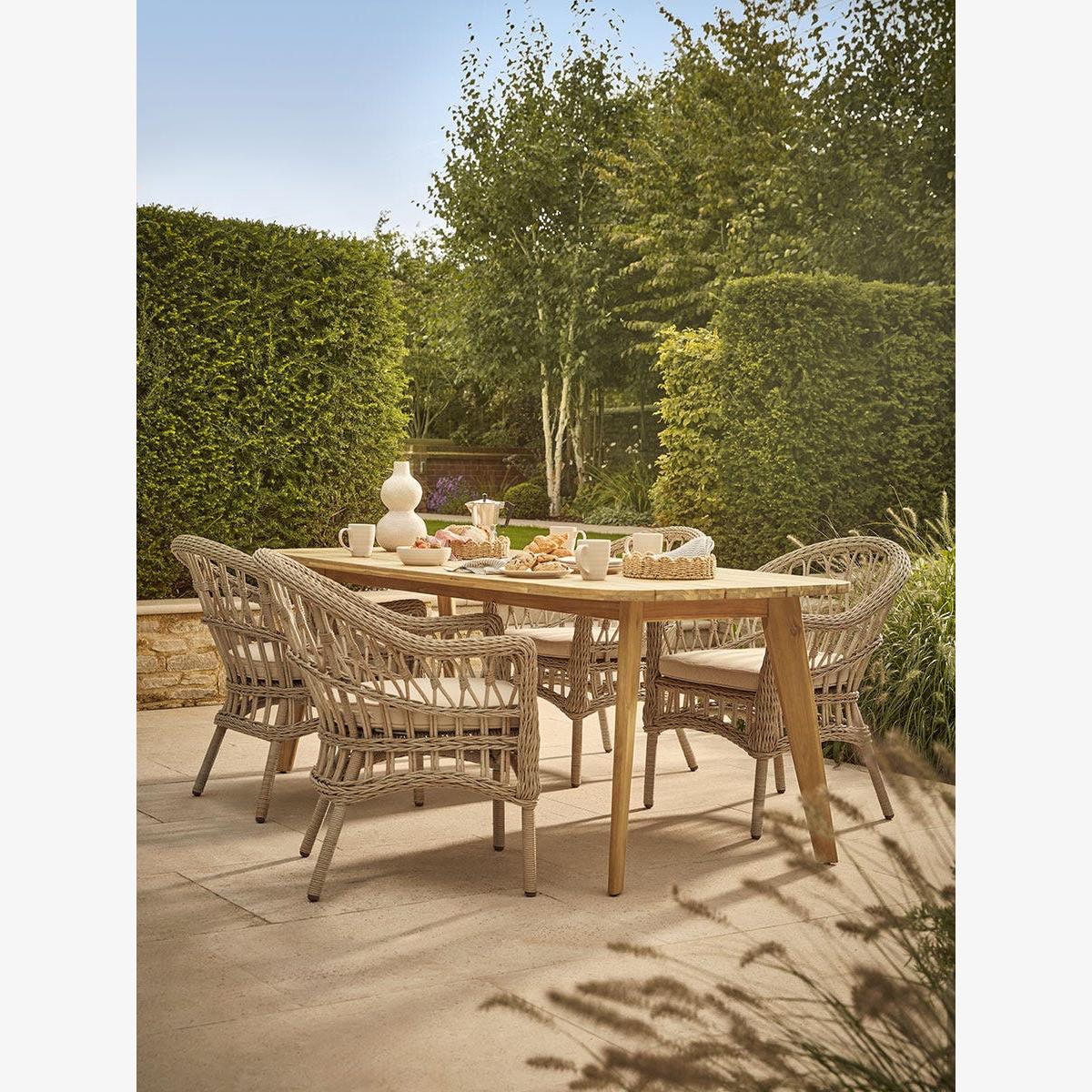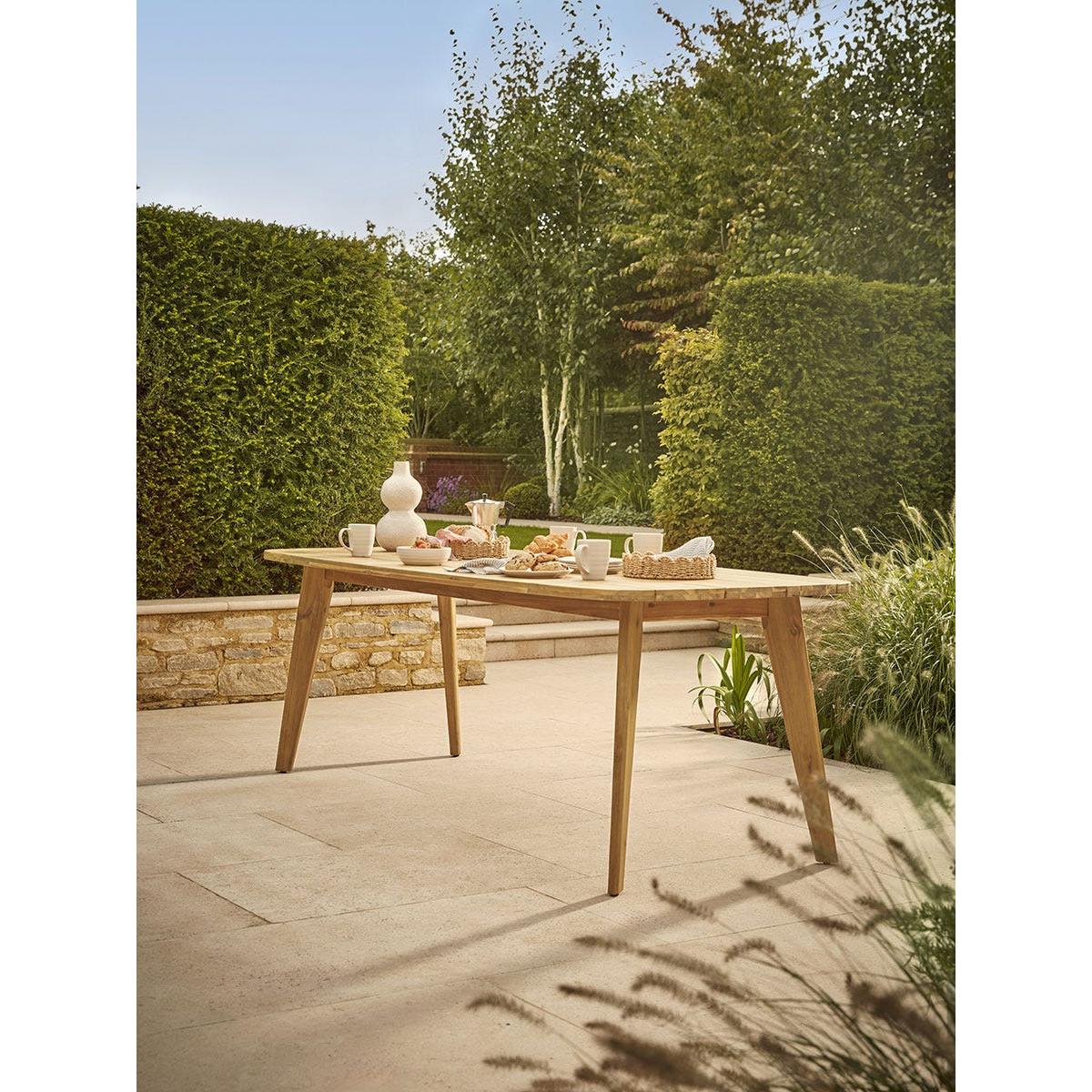 I love the Rhodes table for its versatile design that seamlessly blends outdoor practicality with a stylish touch. Its natural wood finish makes it perfect for a range of garden styles, from rustic to contemporary. It works particularly well in relaxed, casual settings - think family gatherings or outdoor brunches - where it adds warmth and charm. To style it effectively, consider pairing with woven or rattan chairs for a cohesive look, and add oversized lanterns or simple centrepieces to enhance the outdoor feel. Its sturdy construction also encourages it to be a natural focal point in any garden setting, making it a great investment piece that balances functionality with aesthetic appeal.