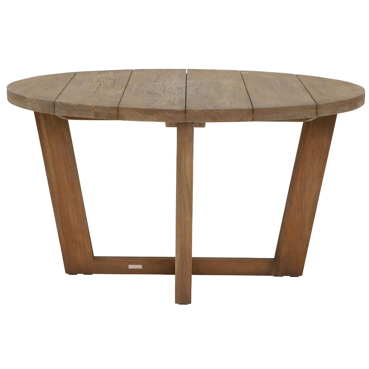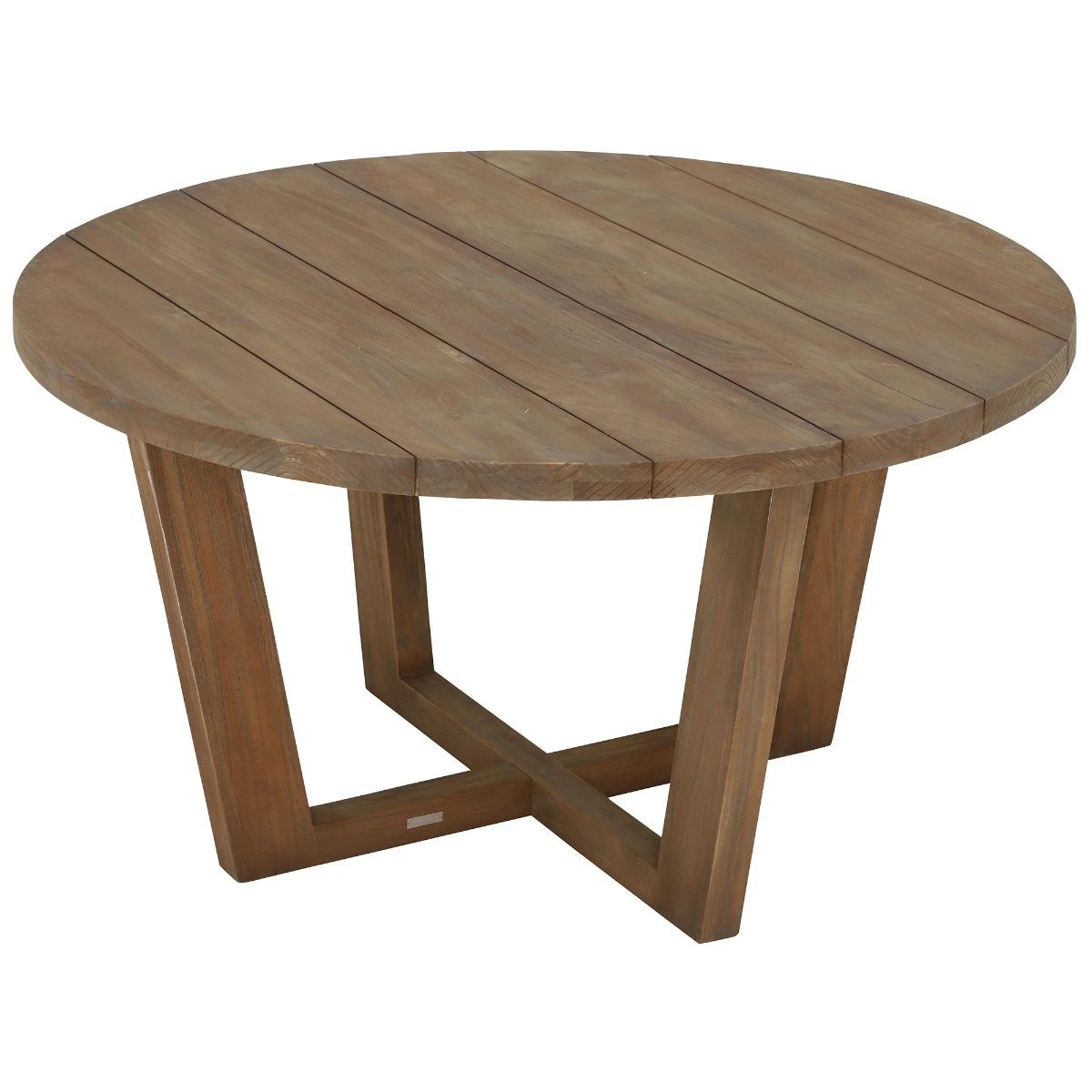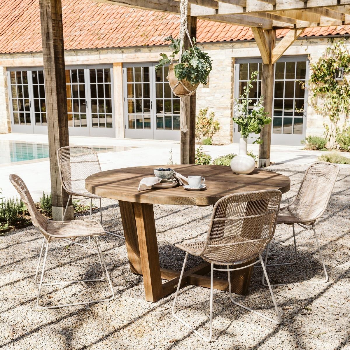 Design. A piece that was made to look perfect in a wide range of outdoor spaces, the Rhodes Round Garden Dining Table has a rustic feel that will transform your garden into a summer haven. Angular legs support a sturdy planked surface for you to wine and dine all summer long.