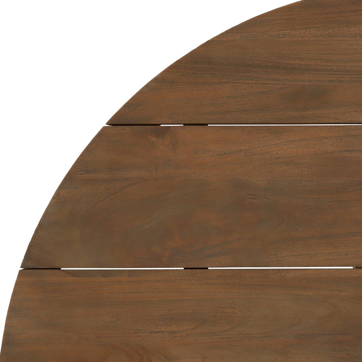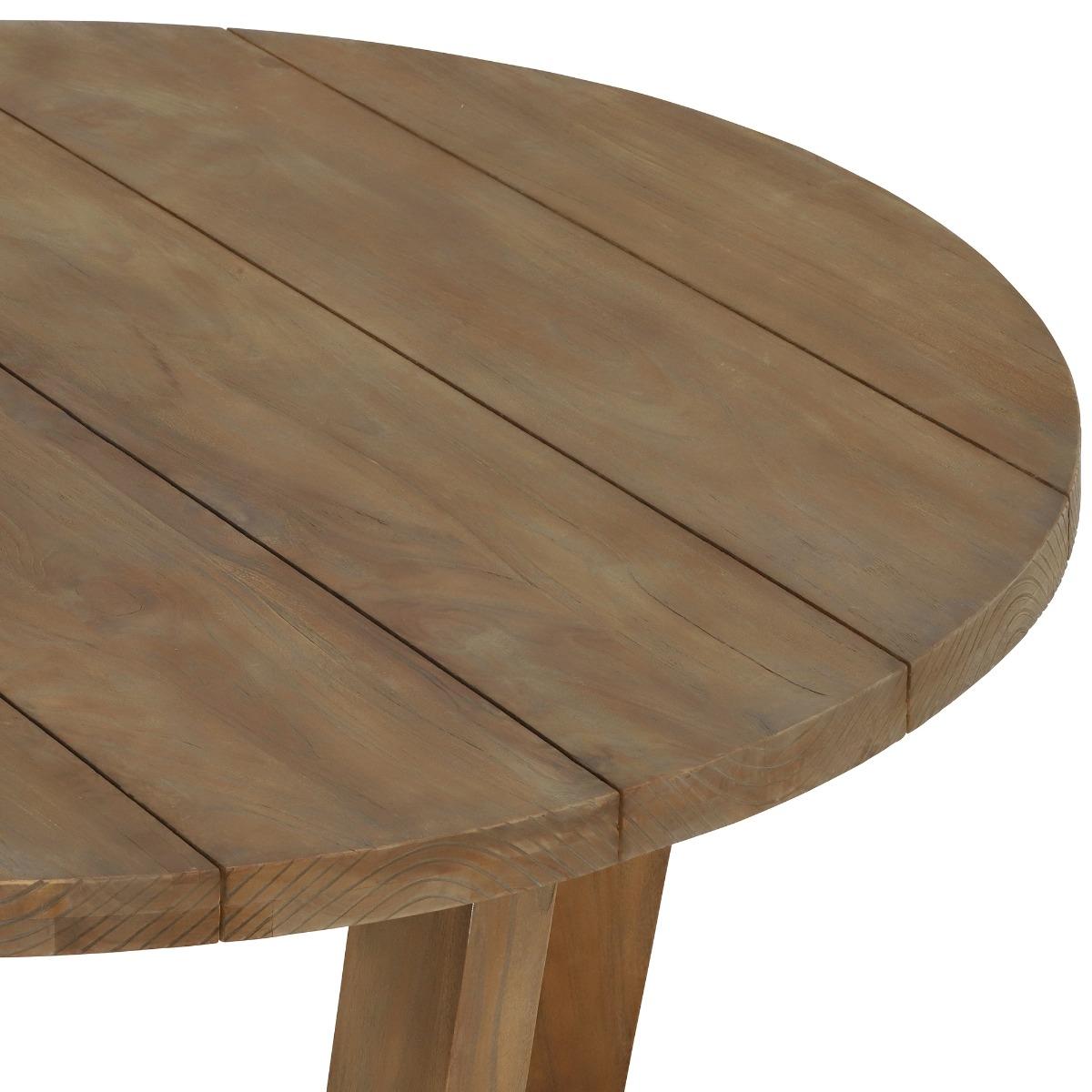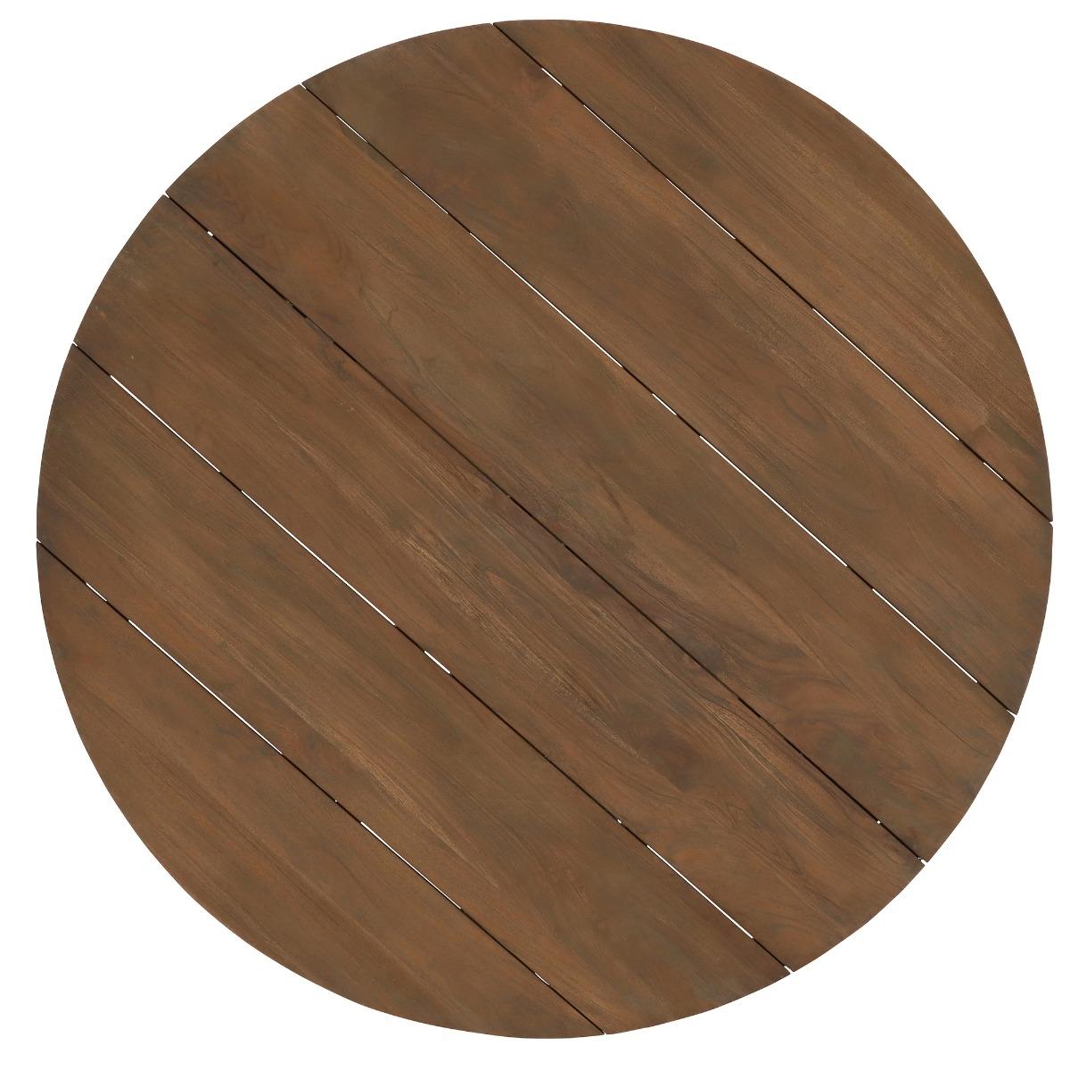 Design. A piece that was made to look perfect in a wide range of outdoor spaces, the Rhodes Round Garden Dining Table has a rustic feel that will transform your garden into a summer haven. Angular legs support a sturdy planked surface for you to wine and dine all summer long.