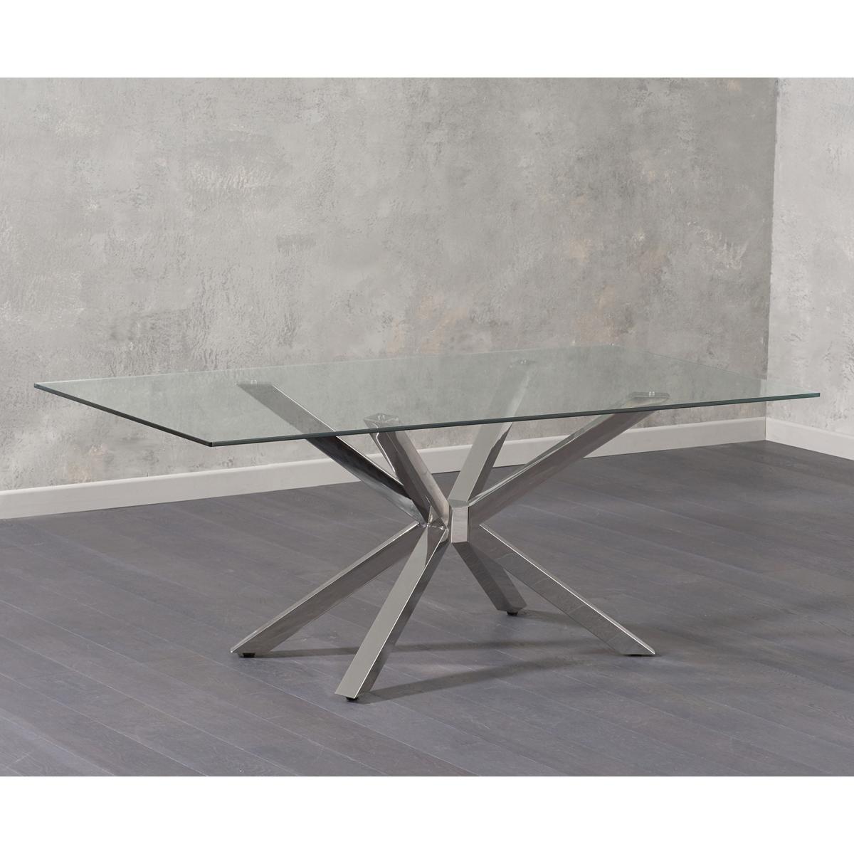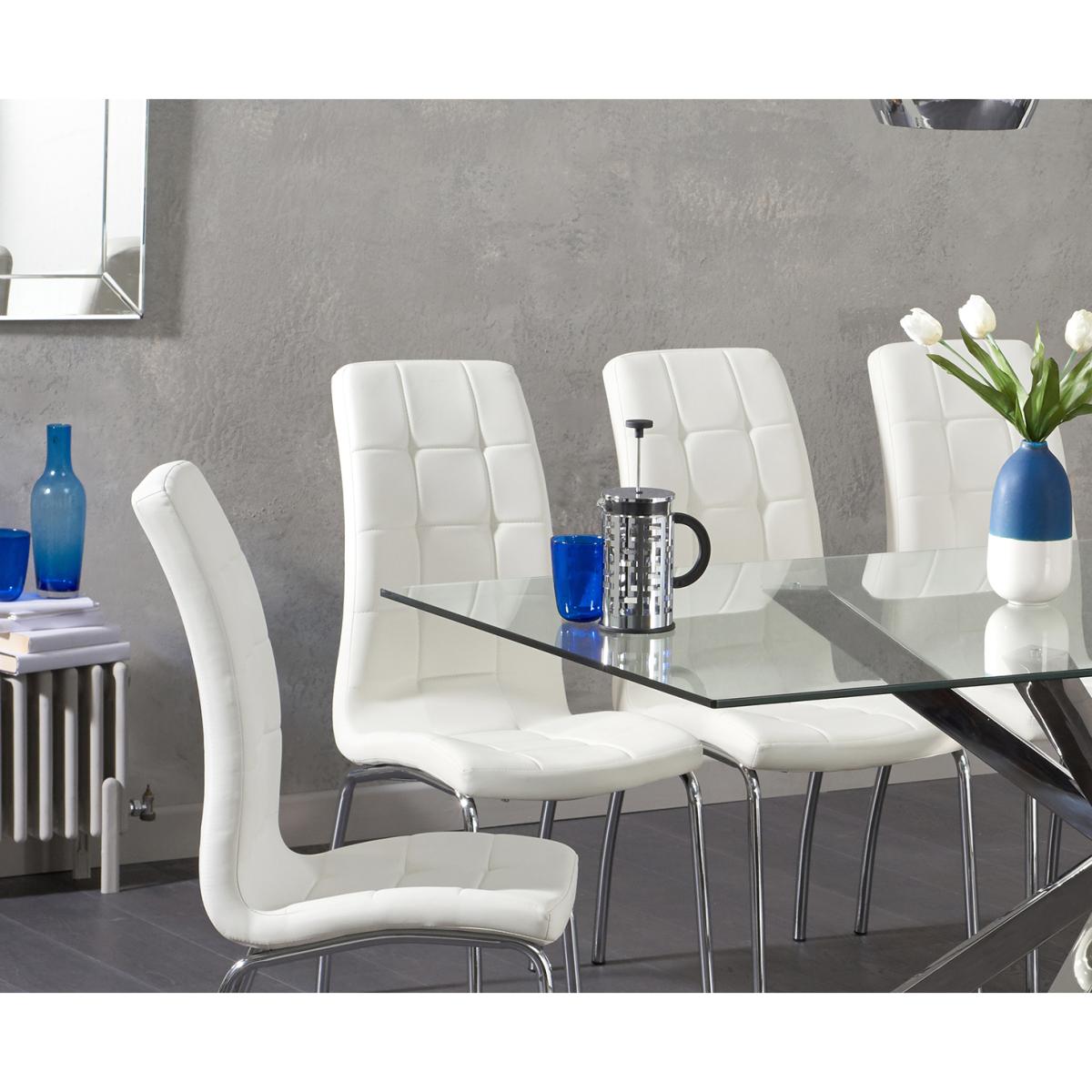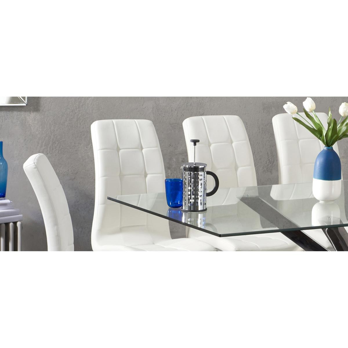 Transform the look of your dining space with the Rhone 200cm Glass Dining Table with Calgary Chairs. This contemporary glass dining set seats up to 10 people and comes with faux leather chairs in a choice of colours. The Rhone 200cm Glass Dining Table is a sleek and stylish piece of furniture that boasts chrome legs that cross in the middle for an elegant and striking look. These support a tabletop that offers fantastic durability thanks to being made from 12mm-thick tempered glass. Our Calgary Chairs complement the table well thanks to their sleek, contemporary look that comprises faux leather upholstery and chrome legs. Foam padding provides long-lasting comfort. Choose from white, grey, black, cream, brown or red.