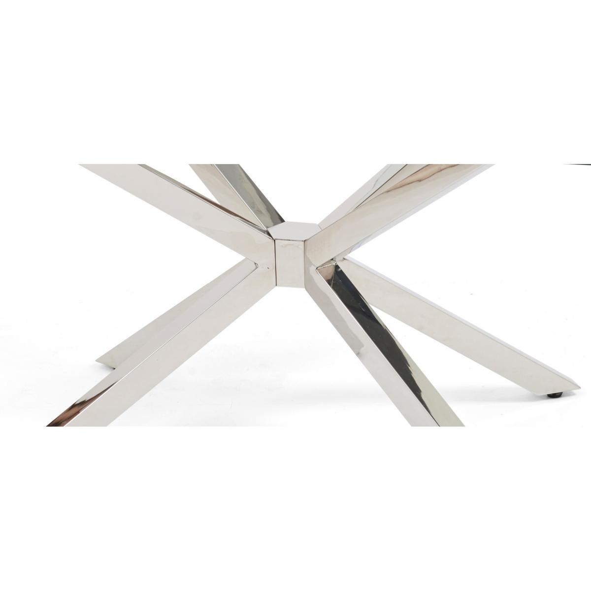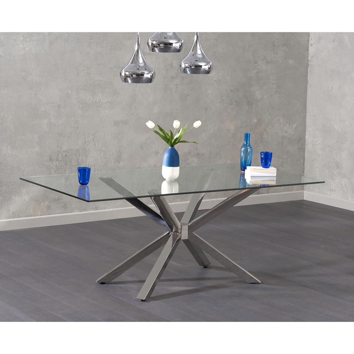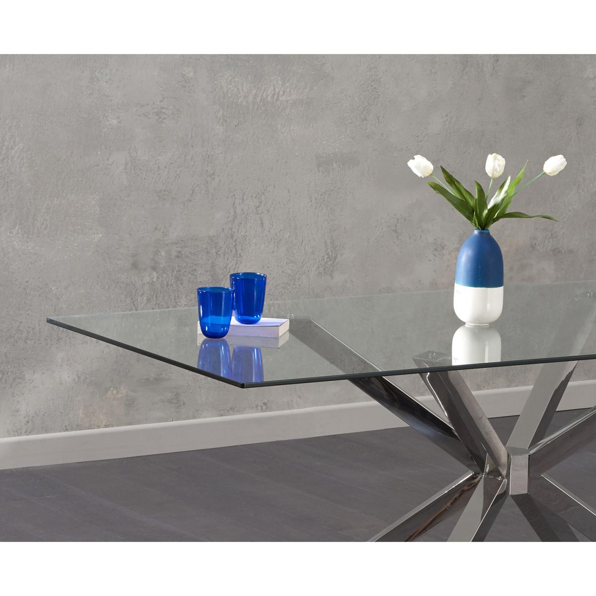 Transform the look of your dining space with the Rhone 200cm Glass Dining Table with Calgary Chairs. This contemporary glass dining set seats up to 10 people and comes with faux leather chairs in a choice of colours. The Rhone 200cm Glass Dining Table is a sleek and stylish piece of furniture that boasts chrome legs that cross in the middle for an elegant and striking look. These support a tabletop that offers fantastic durability thanks to being made from 12mm-thick tempered glass. Our Calgary Chairs complement the table well thanks to their sleek, contemporary look that comprises faux leather upholstery and chrome legs. Foam padding provides long-lasting comfort. Choose from white, grey, black, cream, brown or red.