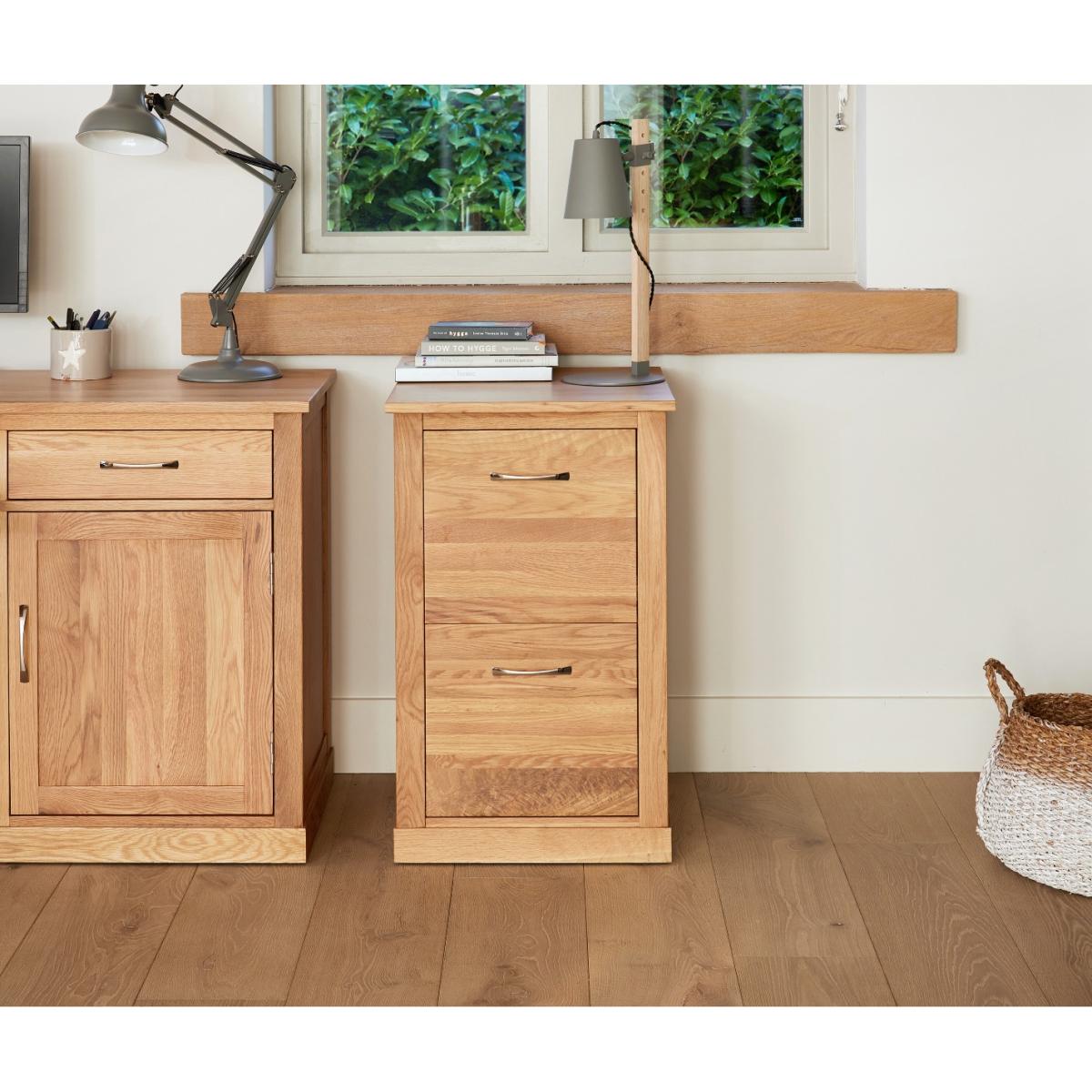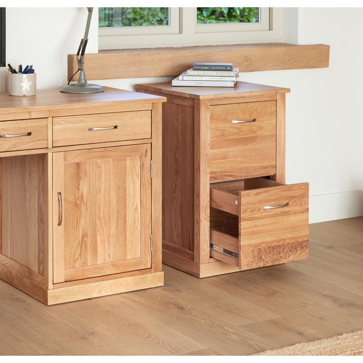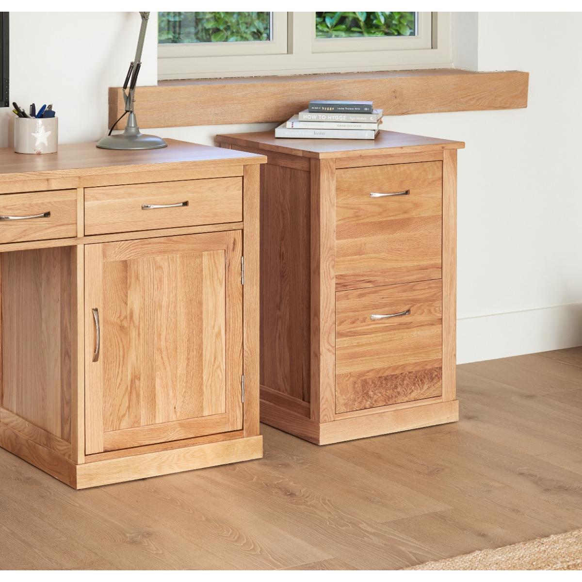 The Rhone Solid Oak 2 Drawer Filing Cabinet combines modern functionality and superb craftsmanship to produce a simply stunning piece of office furniture. At 80cm in height, the solidly constructed filing cabinet accommodates all of your important paperwork in discreet style. The cabinet has been meticulously crafted from the finest solid oak and is complete with a clear lacquered finish that protects the piece from general wear tear and brings a slight sheen to the wood, enhancing the oak grain and accentuating its natural beauty. The Rhone Solid Oak 2 Drawer Filing Cabinet features two generous suspension drawers that hold foolscap suspension files on steel rails. The drawers are complete with chic brushed metal handles to add a finishing touch to the minimalistic, contemporary filing cabinet. At the same height as the desks in the Rhone range, the filing cabinet is ideal as an additional modular piece.