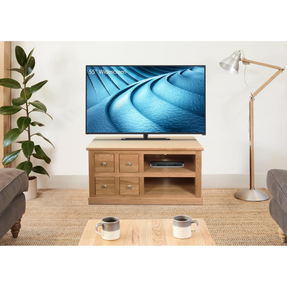 A beautiful blend of rustic style and contemporary design, the Rhone Solid Oak 4 Drawer Television Cabinet accommodates most large televisions and consoles. Designed to complement any home, the robust television unit features plenty of storage for your living room accessories. Carefully crafted from solid oak, the sturdy television cabinet is complete with a satin lacquer finish that protects the wood and adds a subtle sheen to the oak, highlighting the grain beautifully. The Rhone Solid Oak 4 Drawer Television Cabinet features. Two open shelves with convenient holes to the rear for cables and four drawers. The shelves to accommodate DVD players, games consoles or digital boxes and the drawers are ideal for storing CDs, DVDs and Blu Ray discs. The drawers are complete with brushed metal handles, adding the perfect finishing touch to the contemporary television cabinet.