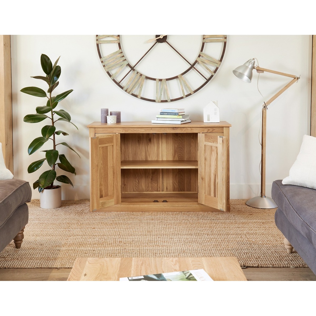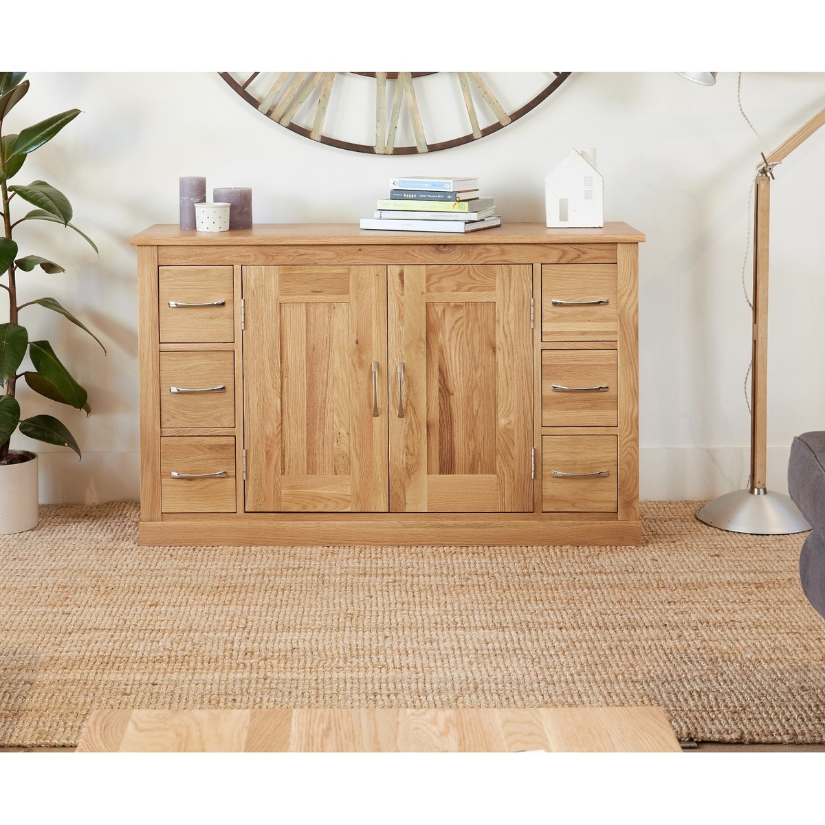 Impressively durable and unmistakably stylish, the Rhone Solid Oak 6 Drawer Sideboard is the perfect combination of practicality and contemporary design. Complementing any home, the modern sideboard makes a bold impression when placed in your living space or dining room. Crafted to perfection from carefully selected solid oak, the Rhone sideboard is built to last and designed to impress. This exceptional sideboard has been finished in a clear lacquer that protects the piece and imparts a gentle sheen to the wood, emphasising the beautiful grain of the oak superbly. The Rhone Solid Oak Sideboard features six drawers with dovetail jointing ideal for storing CDs and a large two door cupboard with a generous adjustable 3-position shelf that can also be removed should you require the full cupboard space. The cupboard doors and drawers are complete with stylish two-tone brushed metal handles to add a contemporary finishing touch to the sideboard. As practical and versatile as it is visually stunning, the Rhone Solid Oak 6 Drawer Sideboard is simply beautiful as a standalone item and complements other pieces from the Rhone oak range wonderfully. Measurements: L:123cmW:39cmH:75cmMaterials:. Solid OakAssembly:. Fully Assembled