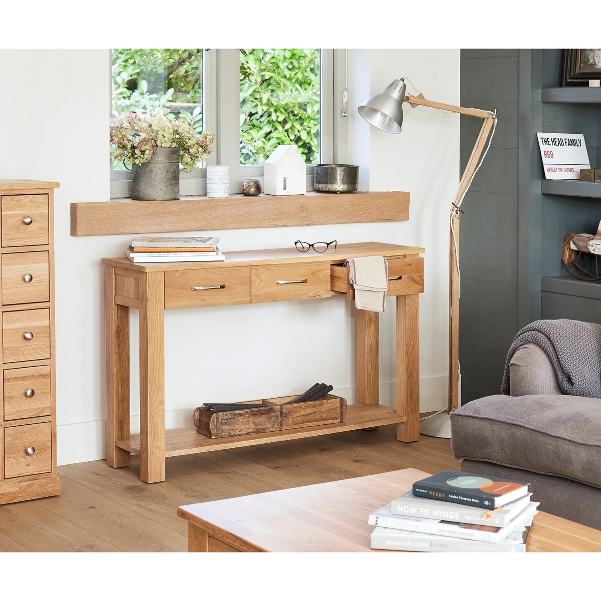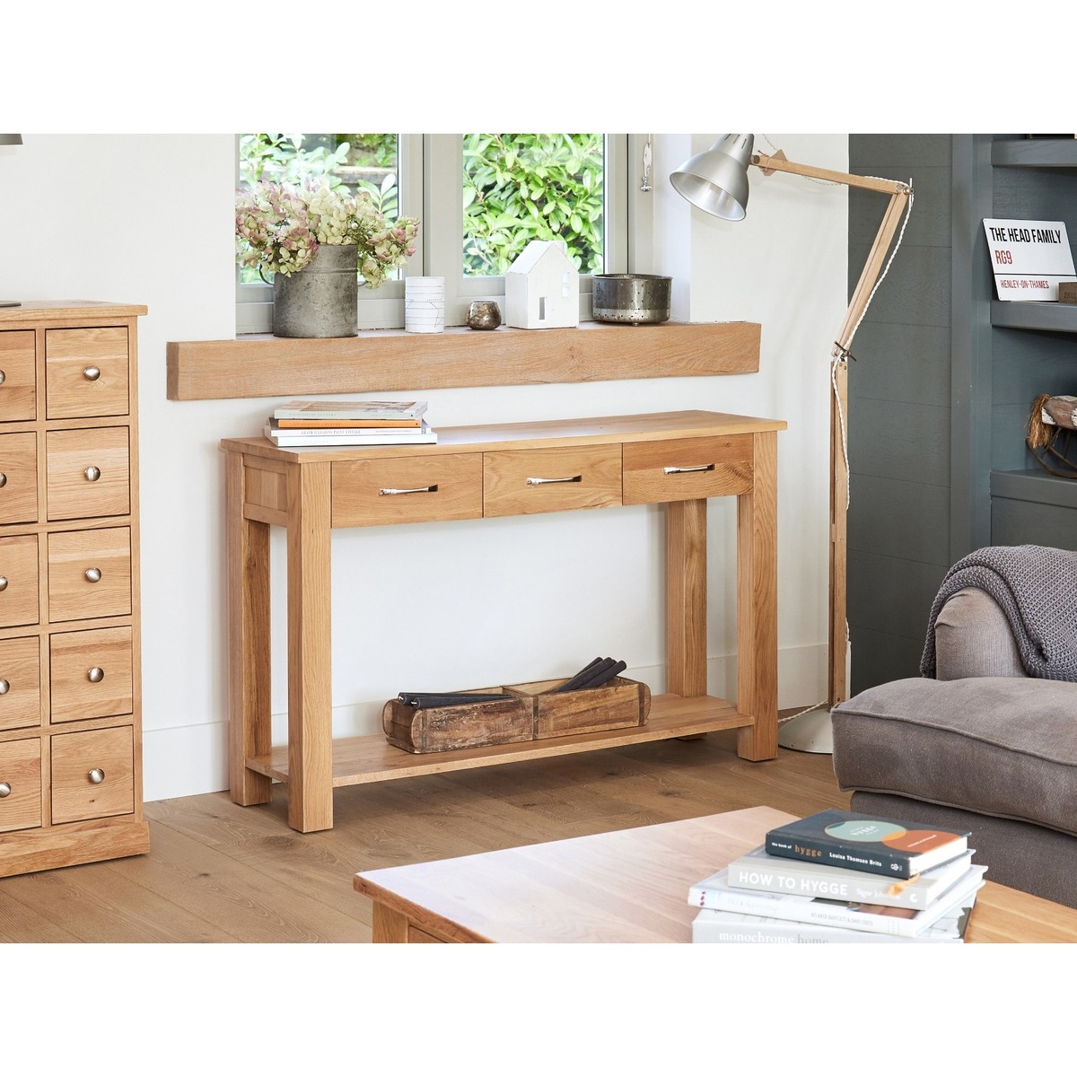 The Rhone Solid Oak Console Table is a perfectly contemporary fusion of style, practicality and incredibly strong build. Chic and minimalist, the Rhone console table can also be used as a dressing table and has been designed to complement and enhance any home. Stunningly crafted from naturally robust solid oak, the 120cm console table is a practical, durable addition to your hallway or living area. The table has been finished with a clear satin lacquer finish that offers protection against daily wear and tear and brings a subtle shine to the wood, highlighting the oak grain beautifully. The Rhone Solid Oak Console Table features a convenient fixed lower shelf for additional storage and three generous drawers with dovetail joints. The drawers are complete with chic brushed metal handles to complete the contemporary style of the console table.