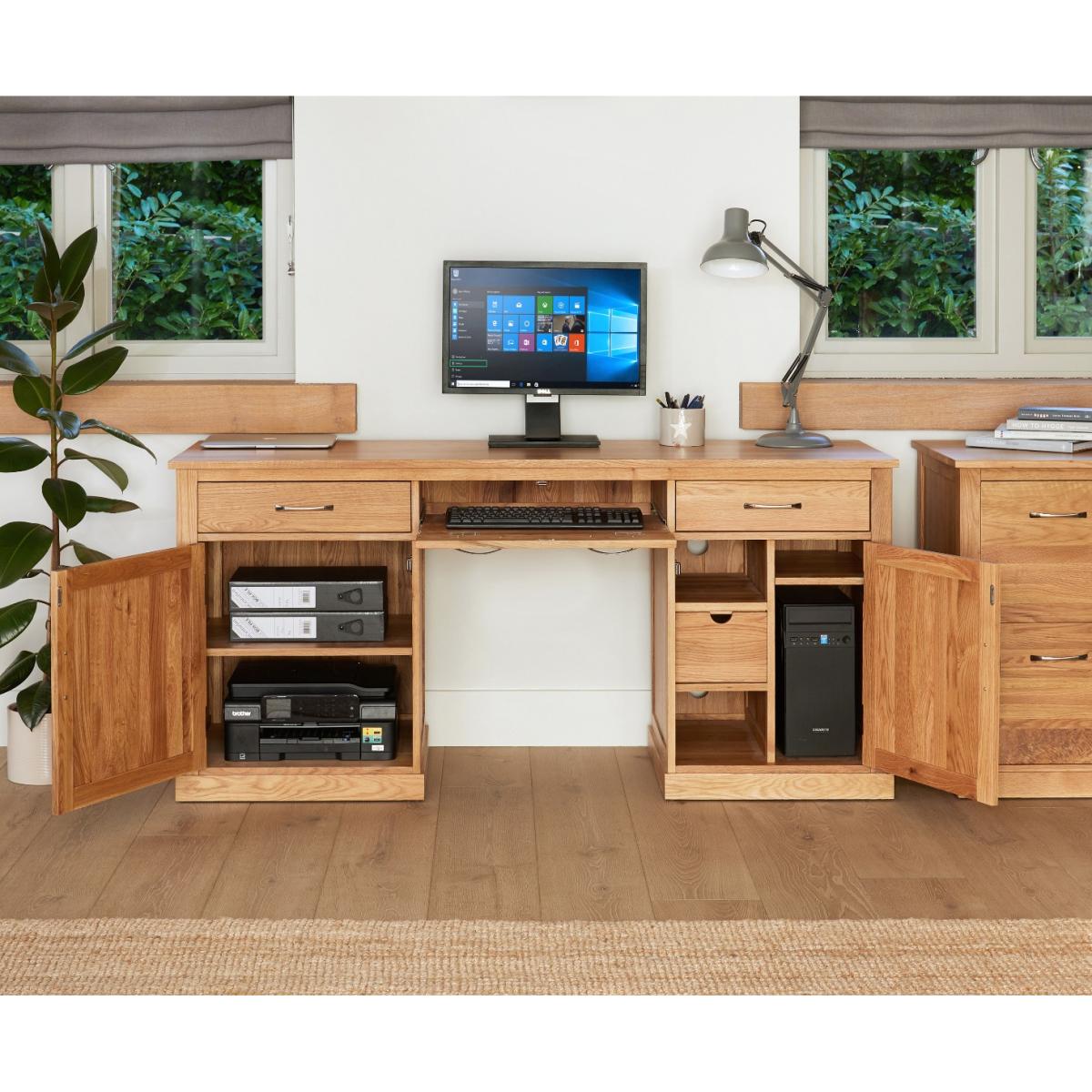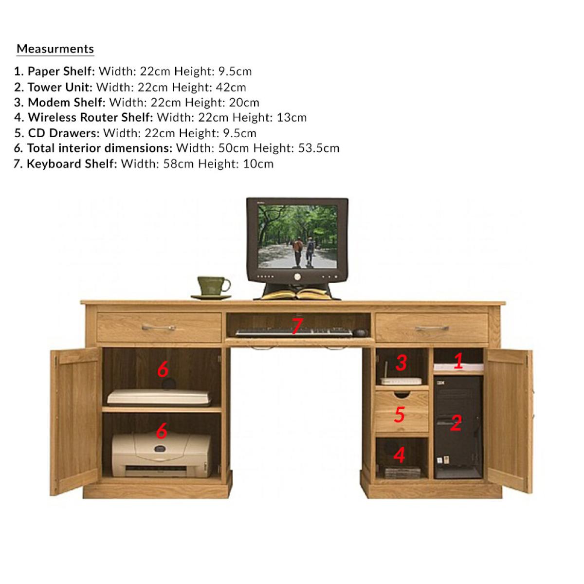 Perfectly practical and unashamedly stylish, the Rhone Solid Oak Large Hidden Office Twin Pedestal Desk is a wonderfully functional addition to your home office. Featuring a variety of storage spaces for your office equipment, the minimalist design of the desk means it complements the décor in any home. Crafted from solid oak, the hidden office desk is durable, robust and built to the last. The desk has been finished in a clear protective lacquer that adds to the overall resilience of the piece and brings a subtle sheen to the oak, highlighting the grain beautifully. The Rhone Solid Oak Large Hidden Office Twin Pedestal Desk features two cupboards, a pull-out central keyboard drawer and two spacious stationery drawers. The right hand cupboard features a space to accommodate your computer’s tower unit with a removable upper shelf to store A4 paper, a drawer for your software and two open shelf spaces for your modems or wireless router. Featuring a removable central shelf, the left side cupboard has been designed to accommodate a printer and scanner.