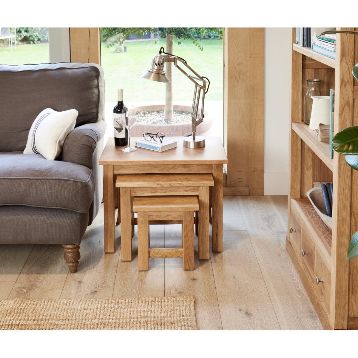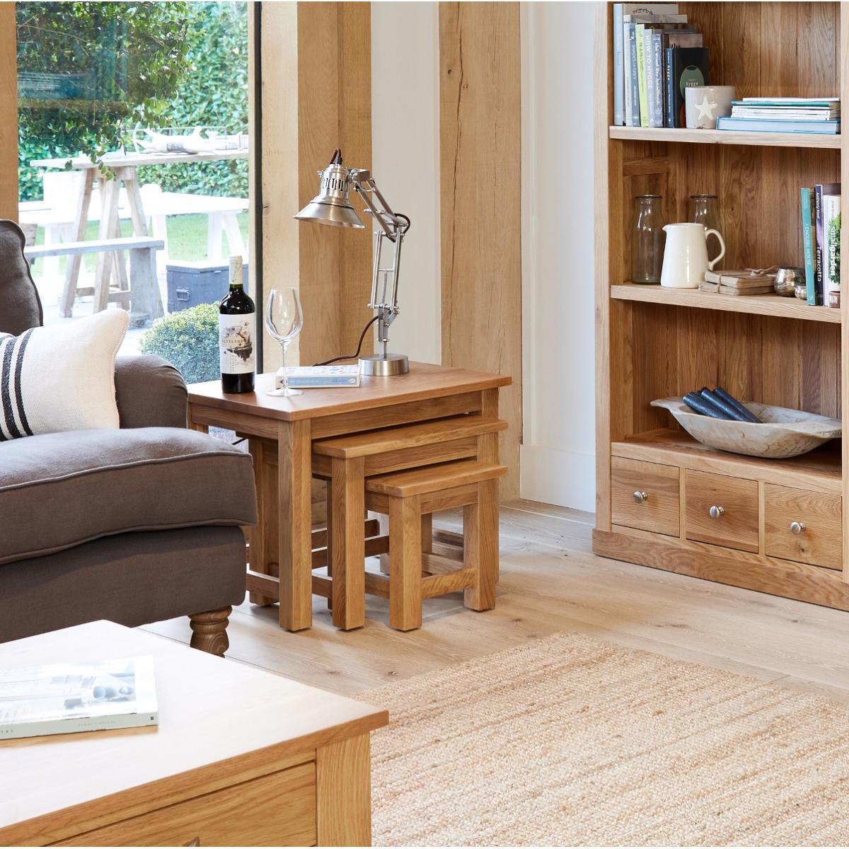 A trio of versatile compact tables, the Rhone Solid Oak Nest of Tables is a beautiful, practical addition to any home. Ideal for use as lamp tables, end tables, bedside tables and small coffee tables, the Nest of Tables are beautifully crafted and designed to complement any room. Fashioned from carefully selected solid oak, each table features a smooth, durable surface supported by thick solid oak legs and lower crosspieces. The tables are complete with a clear lacquered finish that protects the wood and adds a gentle sheen to the wood, highlighting the oak grain beautifully. Contemporary in design and robust in construction, the Rhone Solid Oak Nest of Tables are perfect for a multitude of uses in the home. When not in use, the tables fit perfectly within one another, saving on space and making storage as convenient as possible.