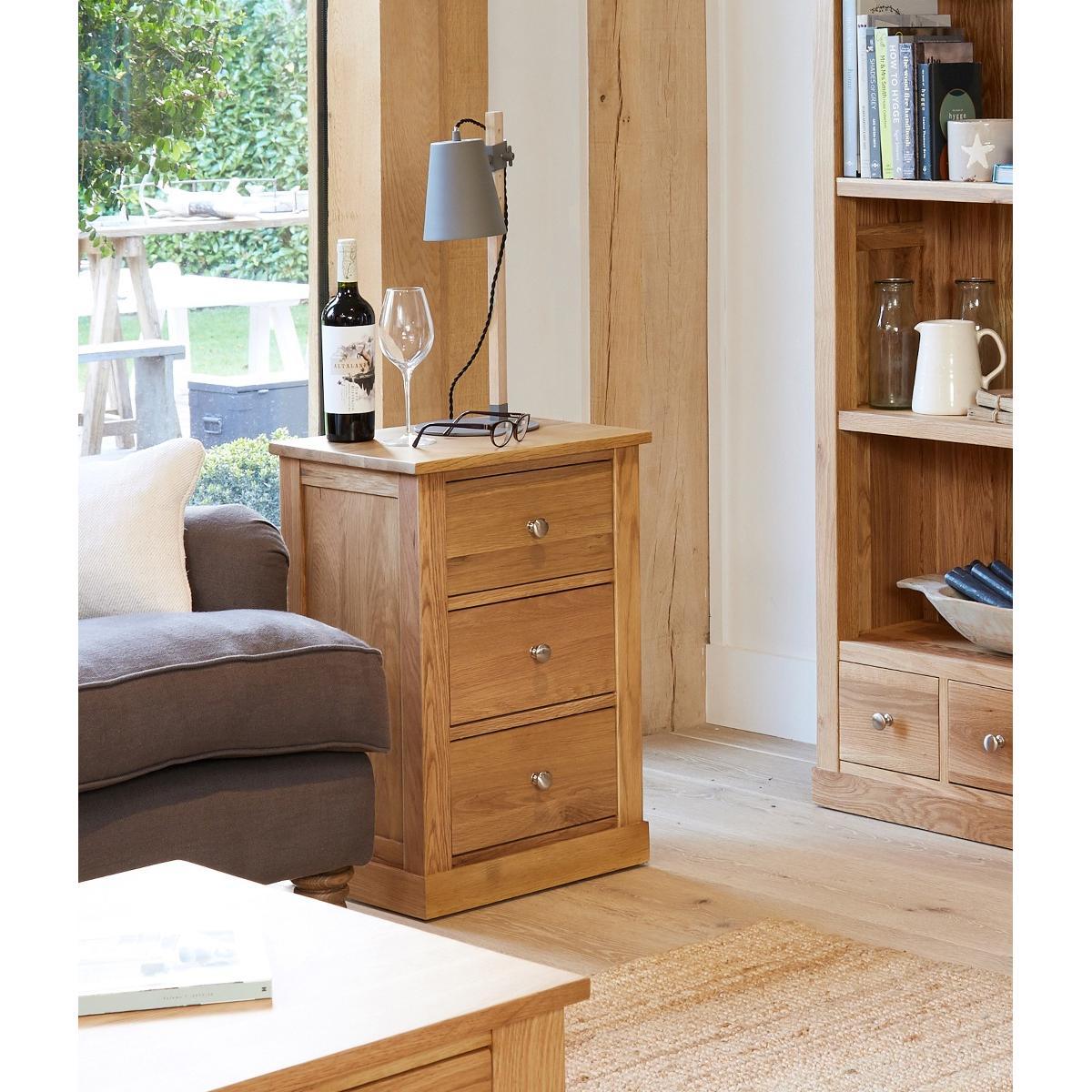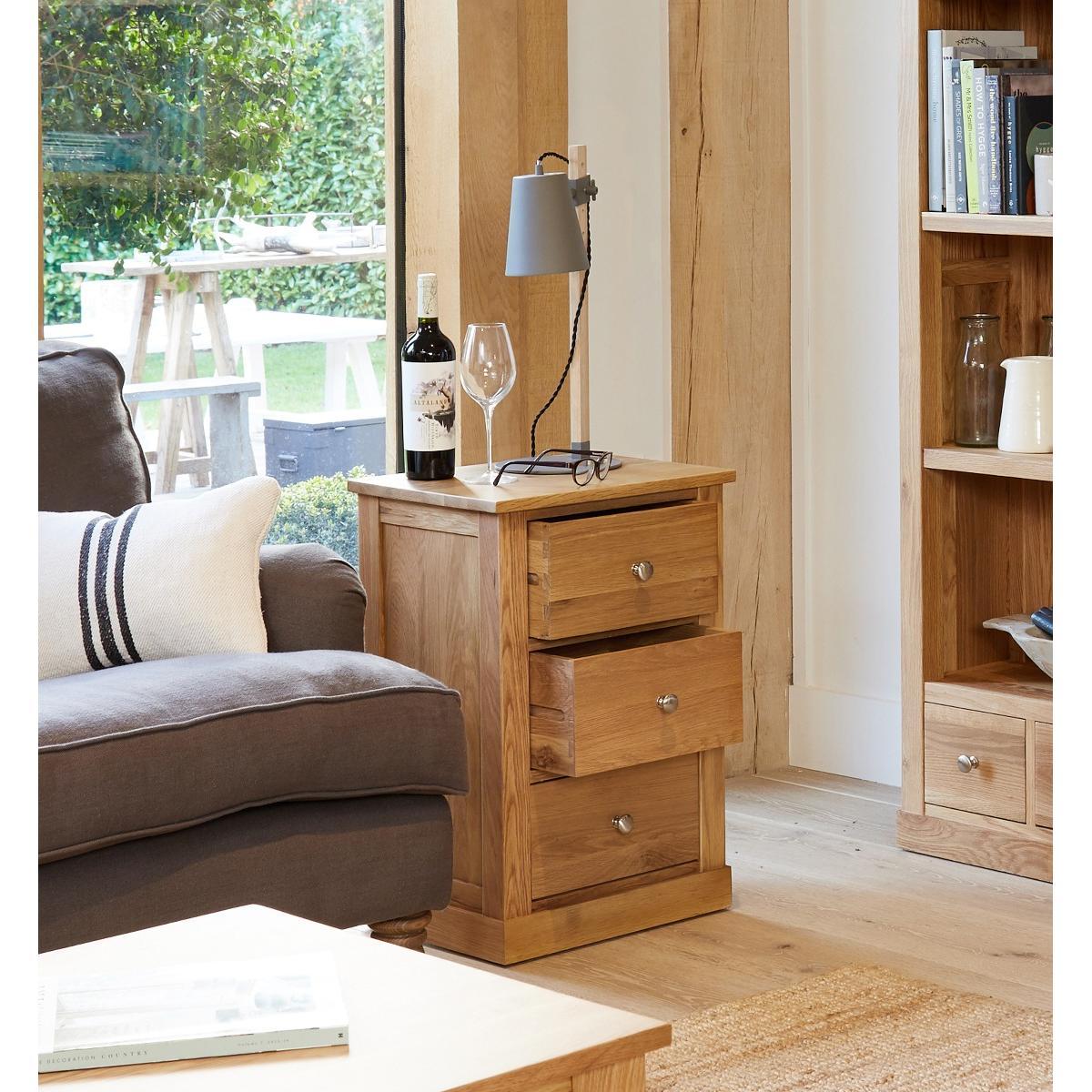 Beautifully designed and robust in construction, the Rhone Solid Oak Three Drawer Side Table is a wonderful addition to any home. Stunningly contemporary in design, the side table is also ideal as a lamp table and is perfectly placed in your living area or bedroom. Carefully crafted from naturally durable solid oak, the contemporary side table is strong and reliable, making it as resilient as it is visually splendid. The table is finished in a clear lacquer that protects the piece from daily wear and tear and adds a gentle sheen to the oak, enhancing the natural beauty of the grain. The Rhone Solid Oak Three Drawer Side Table features three spacious drawers complete with safety ‘drawer stops’ to prevent the drawers from pulling out completely. The drawers are finished with stylish two-tone stainless steel handles, enhancing the contemporary style of the side table. Beautiful as a standalone item, the Rhone Solid Oak Three Drawer Side Table is also a stunning complement to other pieces in the Rhone Solid Oak range.