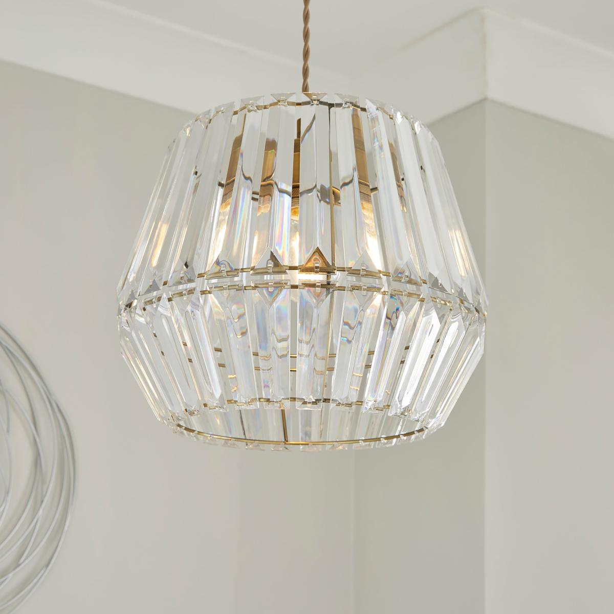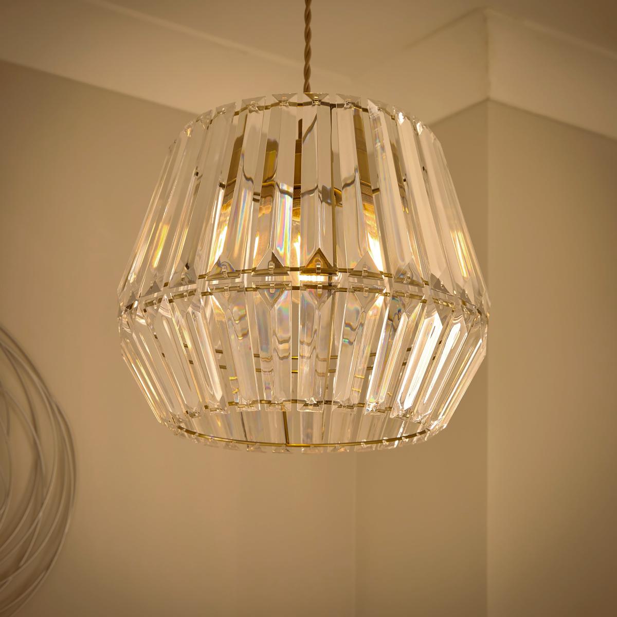 * Crystal-Effect Shade* Unique, Eye-Catching Shape* Made from Durable Metal & Acrylic* Easy Fit - No Electrician Required Eye-catching in design, the Rhyl Easy Fit Pendant Shade offers a glamorous yet quick style change. Made from metal and acrylic with an alluring crystal-effect shade, this piece is easy to assemble and does not require an electrician.