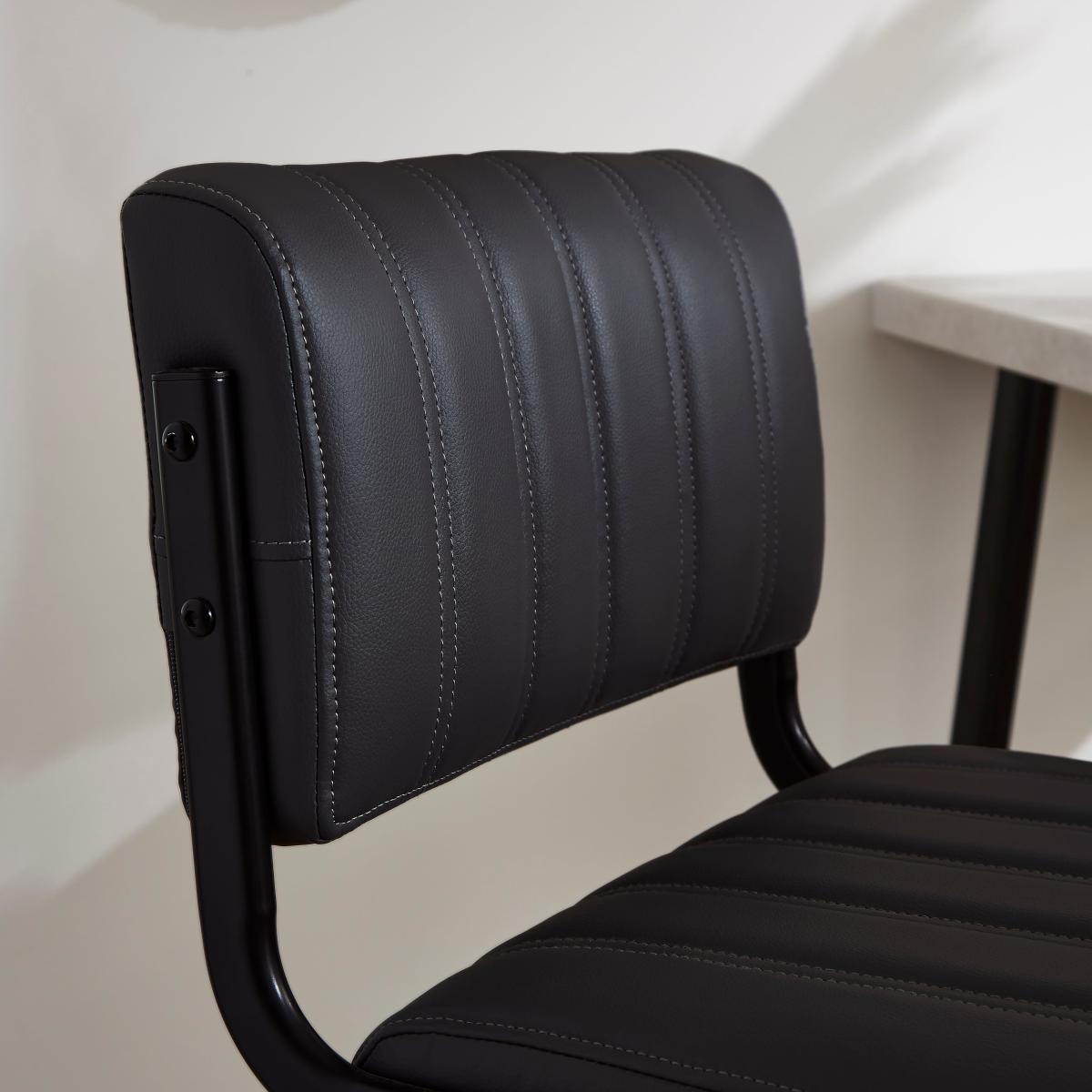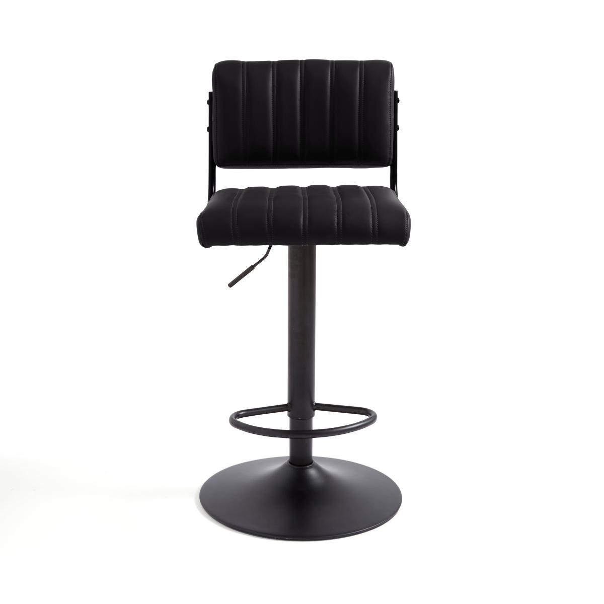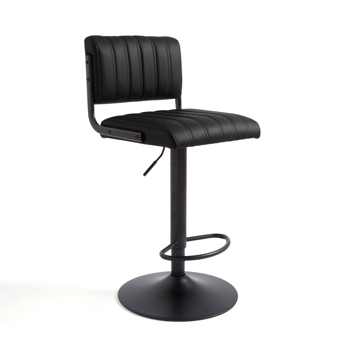 I particularly like this adjustable leather bar stool for its clean lines and sturdy metal base, which make it a versatile choice in both modern and industrial-inspired kitchens. The black leather upholstery adds a subtle touch of sophistication, while the height-adjust feature ensures it suits breakfast bars or higher counters alike. To style it, pair with a light timber bar table or a polished concrete counter, and introduce soft-textured cushions in muted tones to break up the dark finish. A slimline footstool in a complementary metal or a cluster of dried grasses in a simple vase will balance the look nicely.