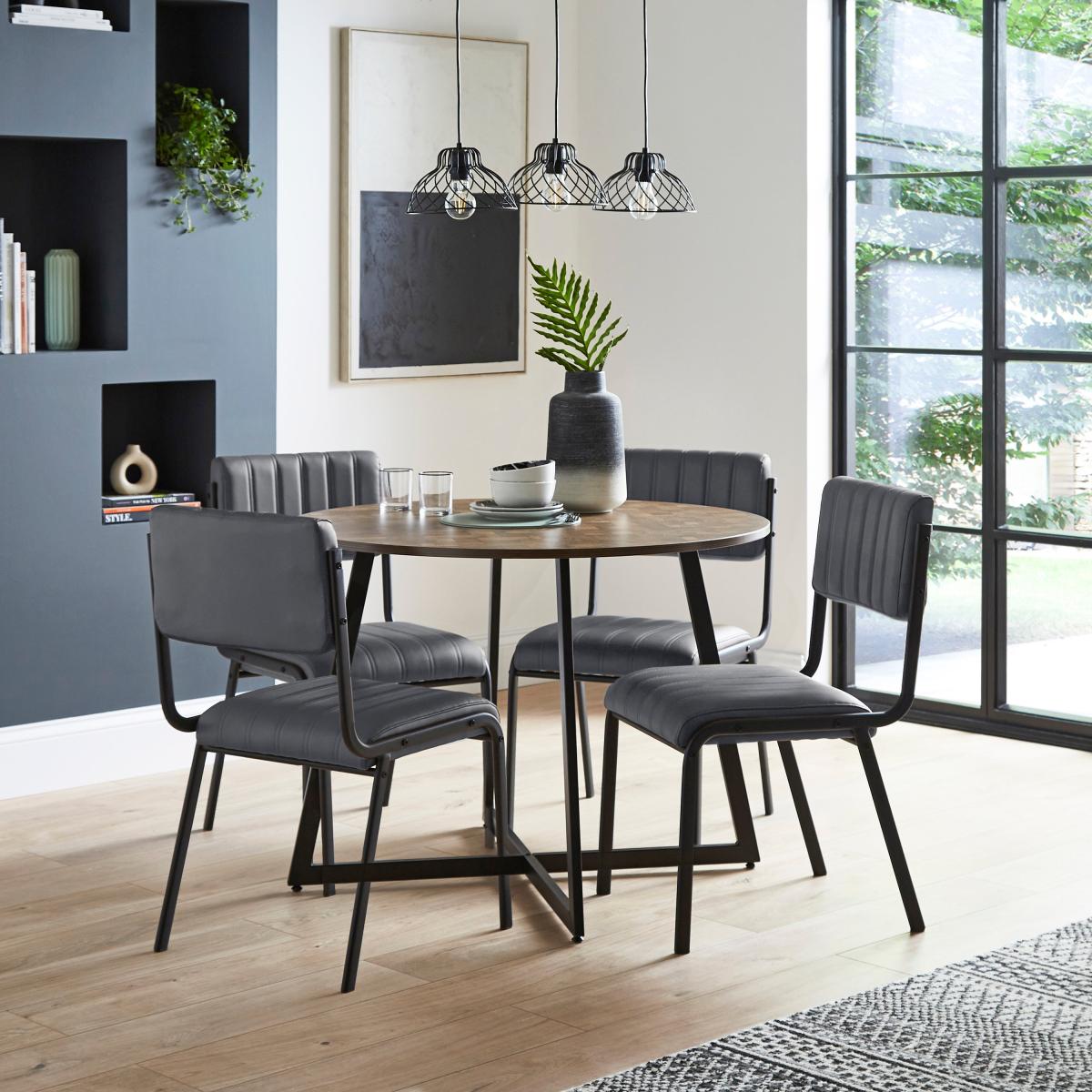 * Trendy faux leather upholstery* Black powder coated legs* Foam filled seats Featuring foam-filled seats upholstered in stylish faux leather, these chairs provide exceptional comfort for everyday meals and gatherings. The sturdy black powder-coated legs enhance durability and lend a modern, industrial vibe to your space. Designed in a KD (knock-down) style for easy assembly, the Rhys dining chairs are both practical and visually appealing, making them the perfect complement to a wide range of dining tables and interior styles.