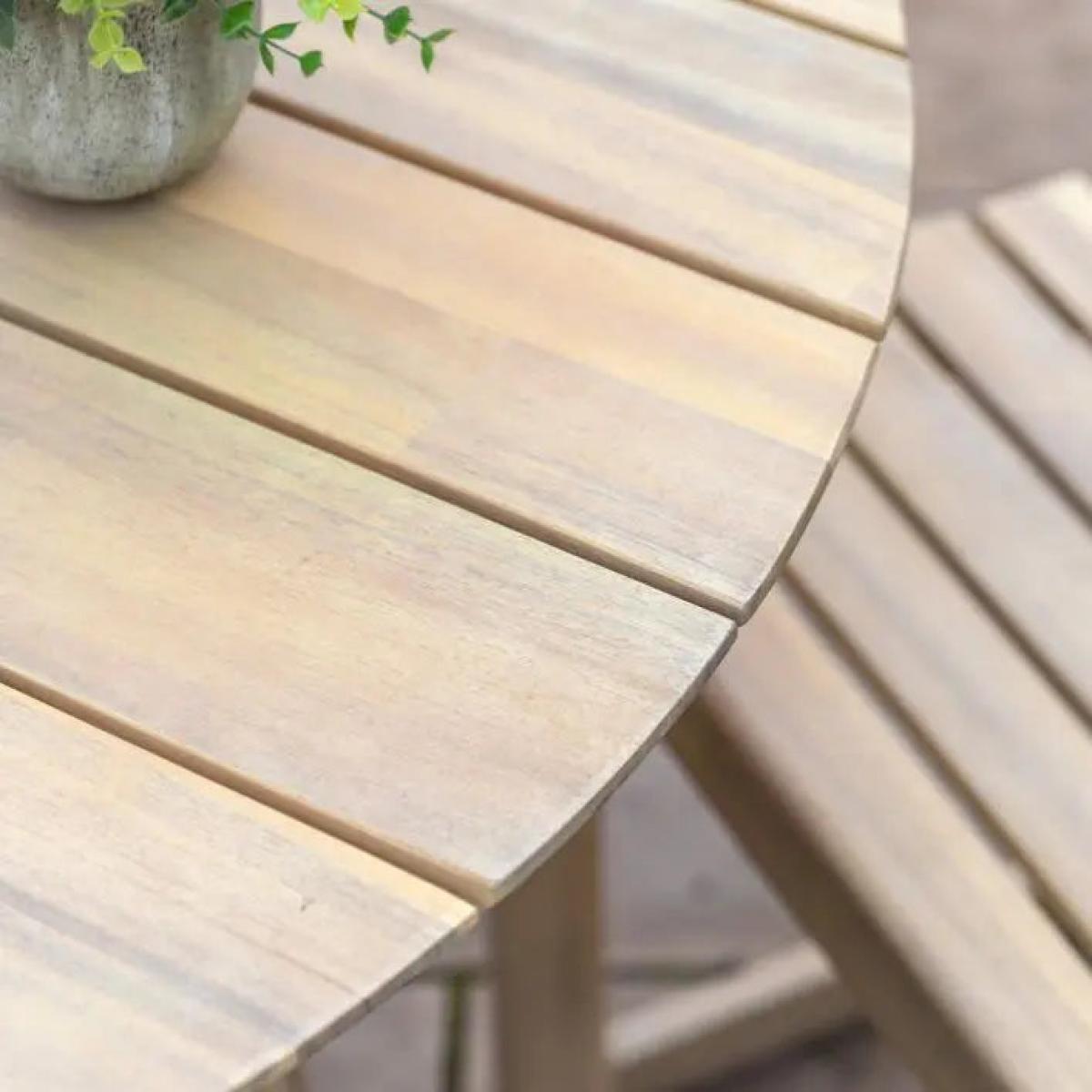 This elegant outdoor dining table features a circular top and a striking, slatted base. Crafted from durable acacia wood, it brings a touch of sophistication and warmth to any patio or garden setting. The slatted base adds visual interest and with ample space for dining, this table is perfect for hosting gatherings or enjoying meals al fresco. This elegant outdoor dining table features a circular top and a striking, slatted base. Crafted from durable acacia wood, it brings a touch of sophistication and warmth to any patio or garden setting. The slatted base adds visual interest and with ample space for dining, this table is perfect for hosting gatherings or enjoying meals al fresco.