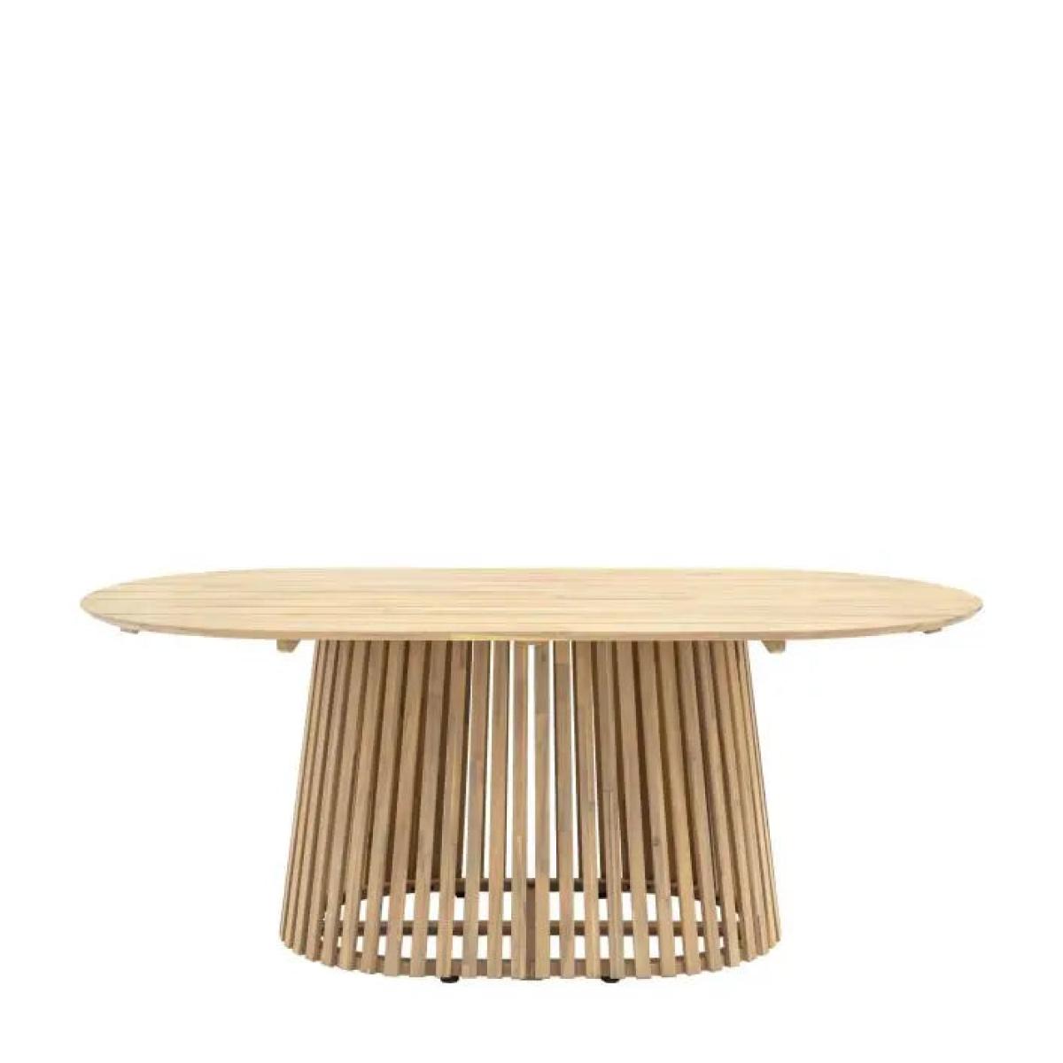 This elegant outdoor dining table features a sleek oval top and a unique, slatted base. Crafted from durable acacia wood, it adds a touch of sophistication and warmth to any patio or garden. With ample space for guests, this table is both stylish and functional, perfect for hosting gatherings or enjoying meals al fresco. This elegant outdoor dining table features a sleek oval top and a unique, slatted base. Crafted from durable acacia wood, it adds a touch of sophistication and warmth to any patio or garden. With ample space for guests, this table is both stylish and functional, perfect for hosting gatherings or enjoying meals al fresco.