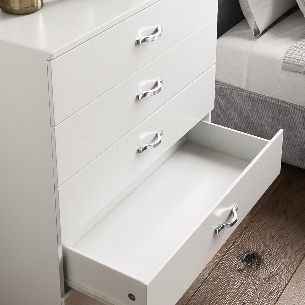 If you are looking to give your bedroom a contemporary style design with clean lines, then this Riano Chest of Drawers will make a perfect sense in your house. Completed with silverish handles it features satin finish all over, which allows to appreciate the room in whole, not only the furniture. Folded garments are bound to find a permanent home in this chests sliding drawers.