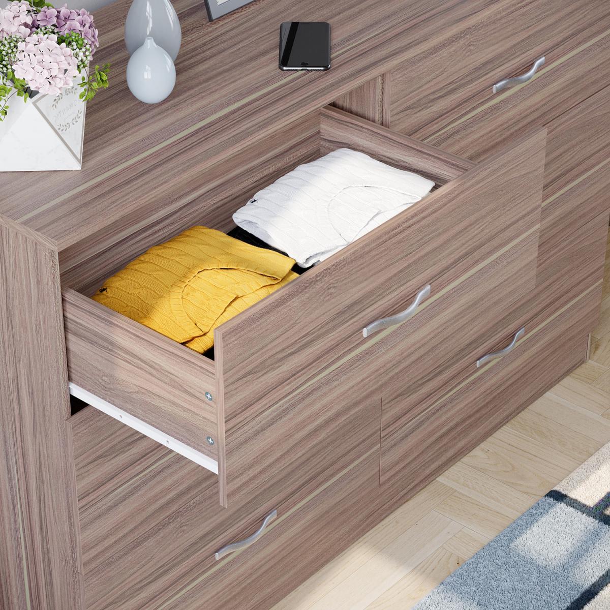 If you are looking to give your bedroom a contemporary style design with clean lines, then this Riano Chest of Drawers will make a perfect sense in your house. Completed with silverish handles it features satin finish all over, which allows to appreciate the room in whole, not only the furniture. Folded garments and other household items are bound to find a permanent home in this chests sliding drawers.