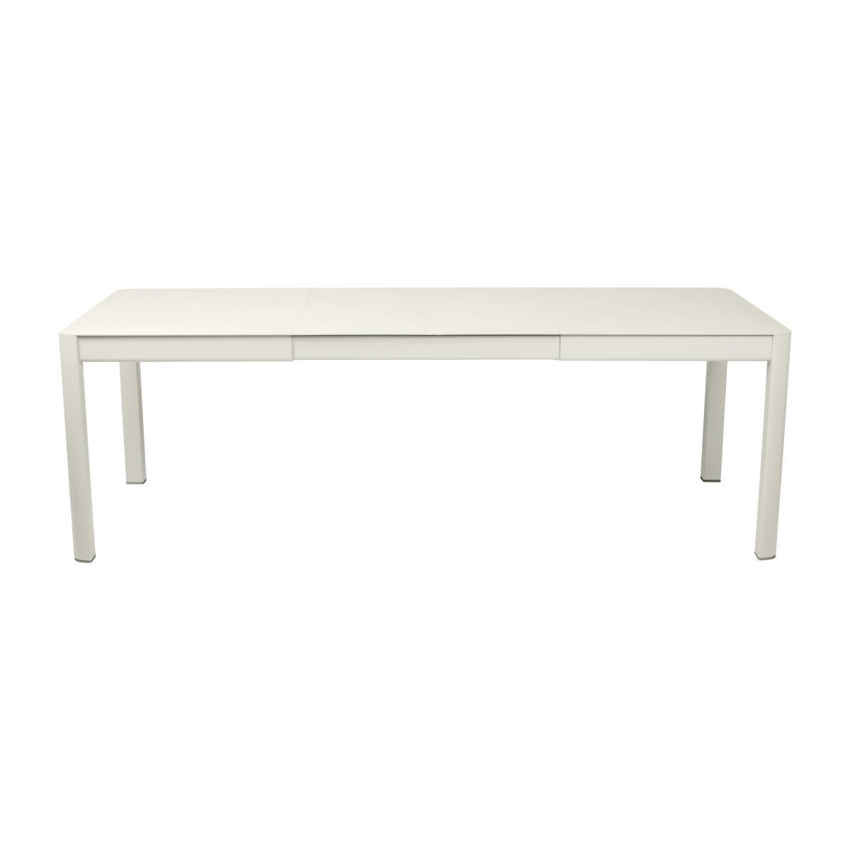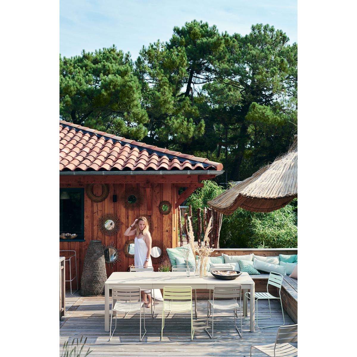 Ribambelle is a large, robust, practical and adjustable extending table. Made completely from aluminium, it is happy both outdoors and inside. Able to accommodate up to 10 people, it will be the ideal partner to enjoy moments together among friends or family. The 2 central extension leaves are completely built into the structure of the table for perfect aesthetics. Thanks to a telescopic system on bearings, extending becomes simple and fluid. When they’re not being used, the extension leaves disappear discretely, cleverly stored in a storage box located under the top. With its timeless, clean design, Ribambelle fits into all styles and combines with any Fermob chairs. Combine the shapes and colours to give it all a dynamic, unique appeal! Made using processes and a technology which meets the highest requirements in terms of quality, Fermob products are fully anchored in the Made in France logic, as shown by the location of the factory in Thoissey.