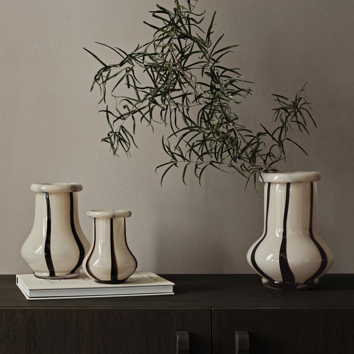 This Riban Vase is a versatile piece that adds subtle sophistication to various interiors. Its handmade, beige glass with black stripe detail makes it ideal for minimalist or Scandinavian-inspired spaces, where its understated elegance can shine. I love pairing it with simple, fresh blooms or even dried grasses for an easy, modern centrepiece. When styling, consider placing it on a neutral console or side table, where its shape and craftsmanship can be appreciated. For added visual interest, group it with other vases of different sizes and textures, or use it to bring height and warmth to a shelf setup. Its neutral tones ensure it complements a wide colour palette, making it a flexible choice for both contemporary and more traditional interiors.