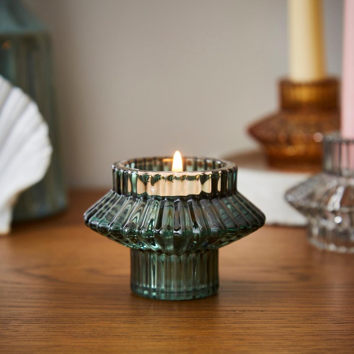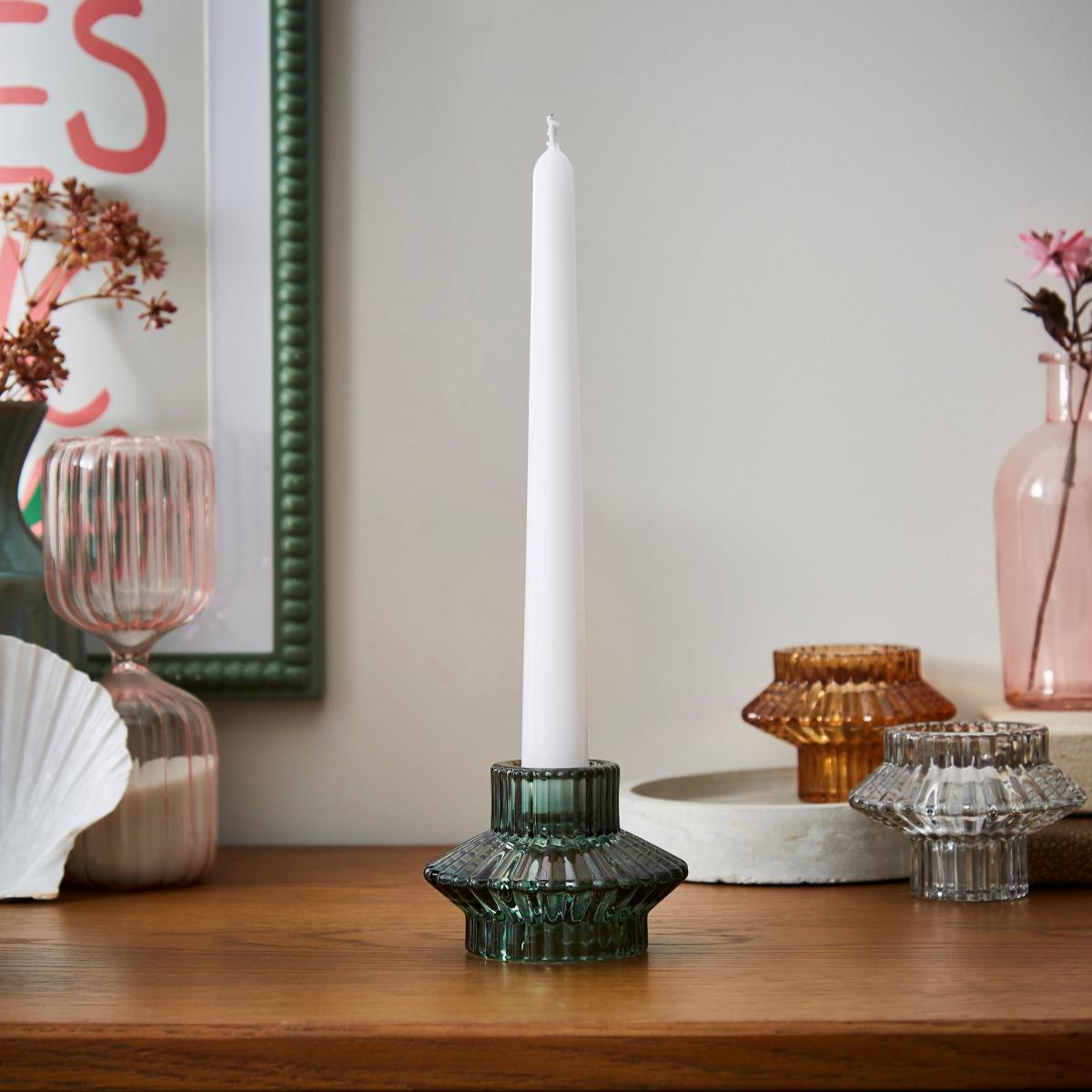 I love this green ribbed holder because it combines texture and colour, making it versatile for a range of interiors. It works particularly well in modern, minimal kitchens or dining rooms, where its sleek design can add a touch of colour without overwhelming the space. For styling tips, try pairing it with simple tapered candles for a clean look or layer it with other glassware and ceramics for a more eclectic display. It’s equally effective as a standalone piece on a sideboard or as part of a centrepiece in a well-lit room. The 2-in-1 aspect also means you can easily switch between holding a single candle or multiple, allowing flexibility to suit different occasions.