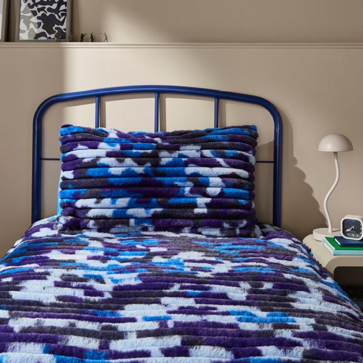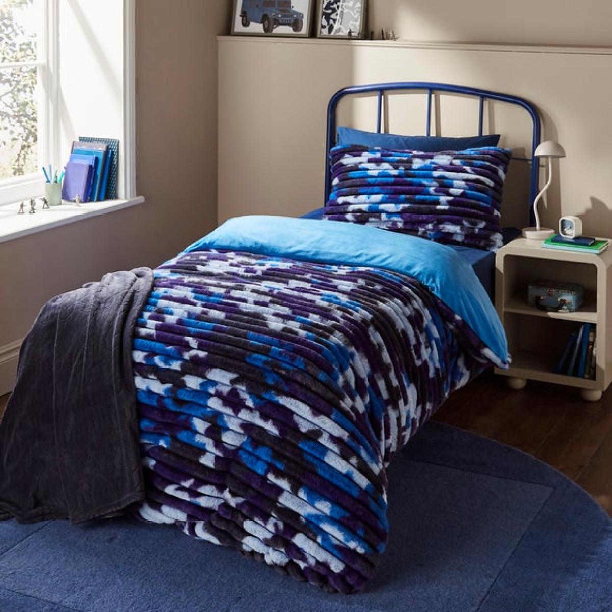 * Camo print design * Fleece material * Includes standard pillowcases * Machine washable Bring laid-back style and comfort to your bedroom with our Ribbed Camo Fleece Duvet Cover and Pillowcase Set. The ribbed texture adds a modern touch, while the classic camo print gives it a cool edge. Snuggle into its soft fleece feel for the ultimate in cosy nights and lazy mornings.