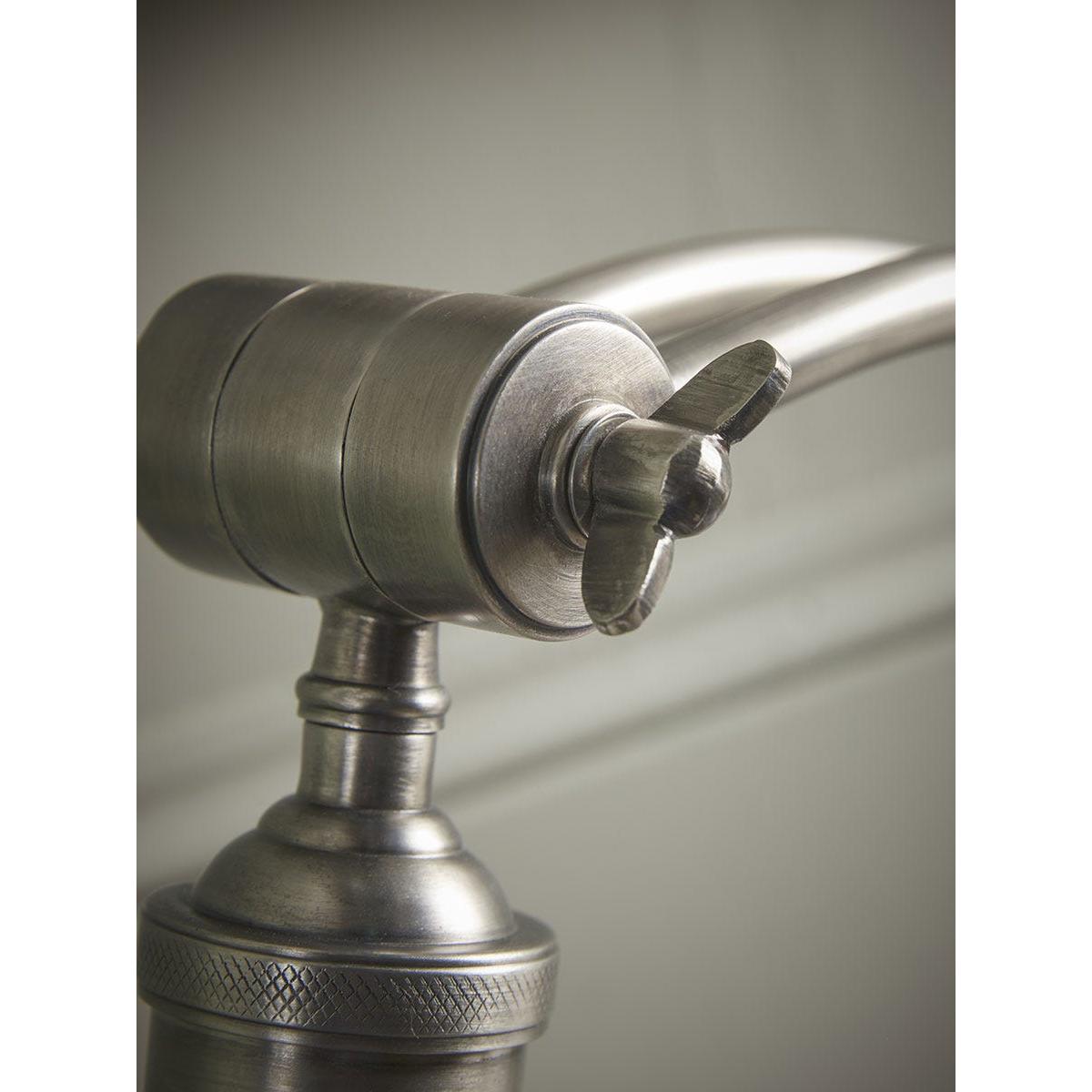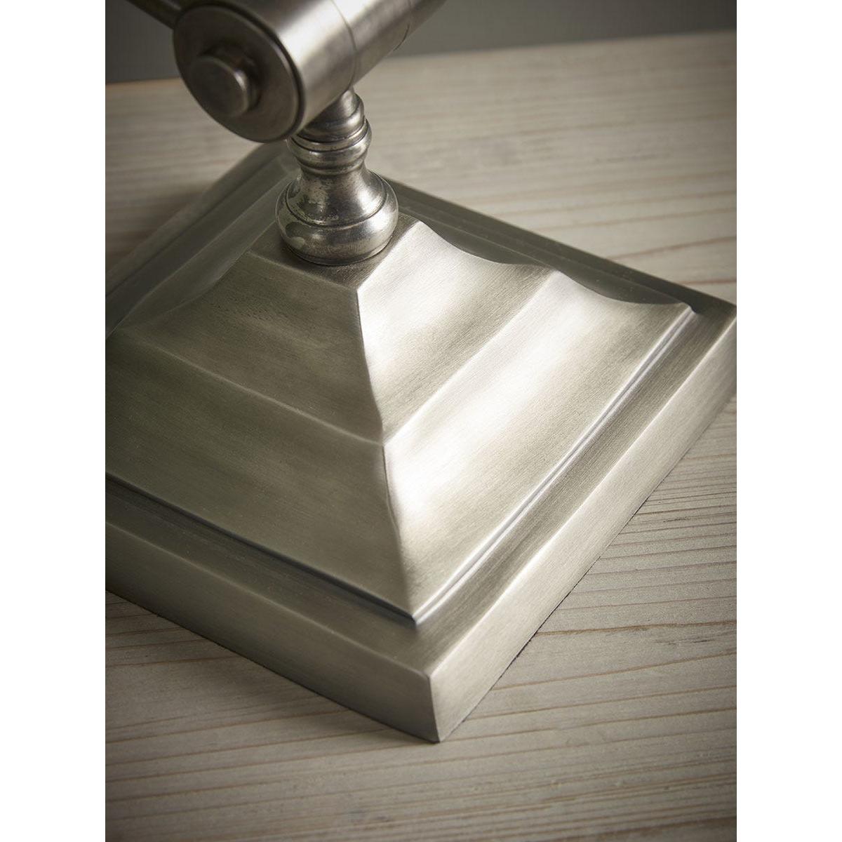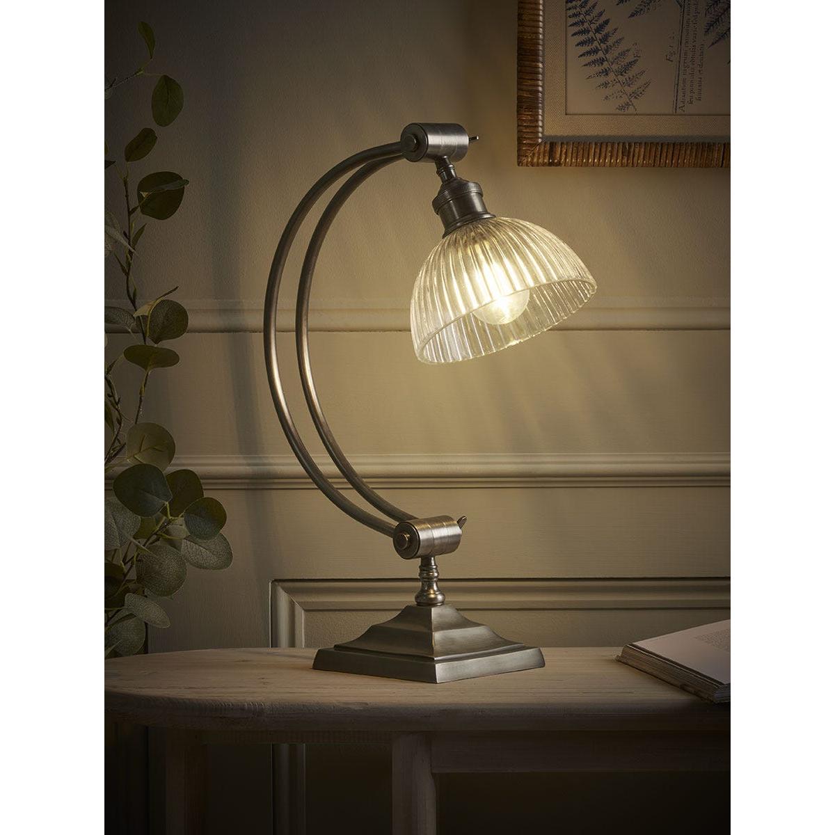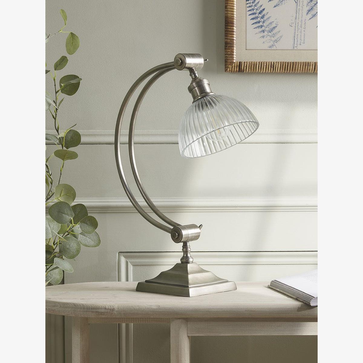 Redefine your home office or even your bedtime reading with this elegant desk light. With a swooping curved arm supported by a tiered plinth in a polished silver tone, your papers and books will be beautifully illuminated by the bowl shaped glass shade which is defined by a gentle ribbed design. Wingnut style fixings allow you to position the lamp to suit your needs, allowing you to carry out tasks in timeless style.