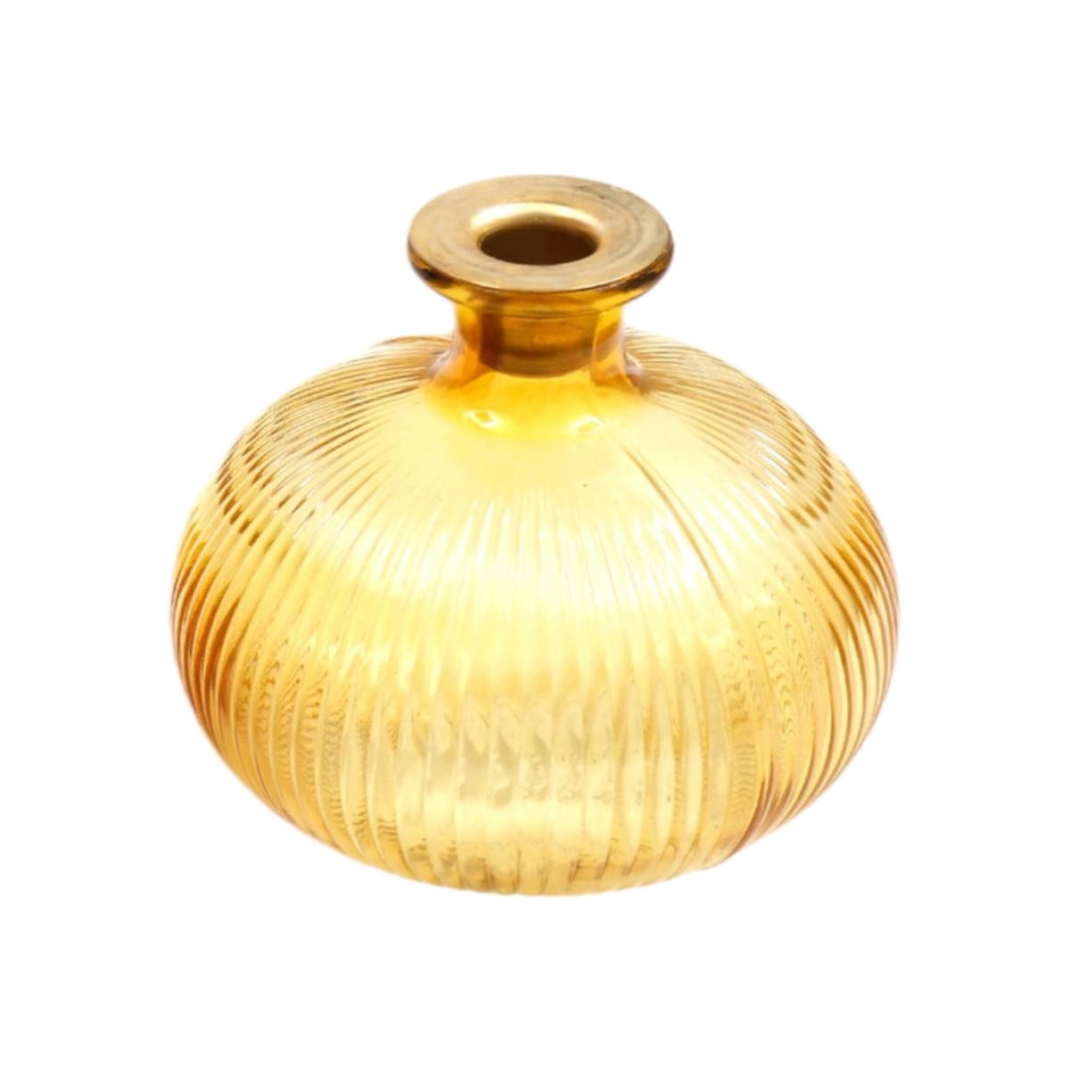 Yellow ribbed glass candle holder with an antique gold rim detailing. Add some elegance to your table-scape with this onion shaped candlestick holder, perfect gift idea. Ribbed glass for textured charm