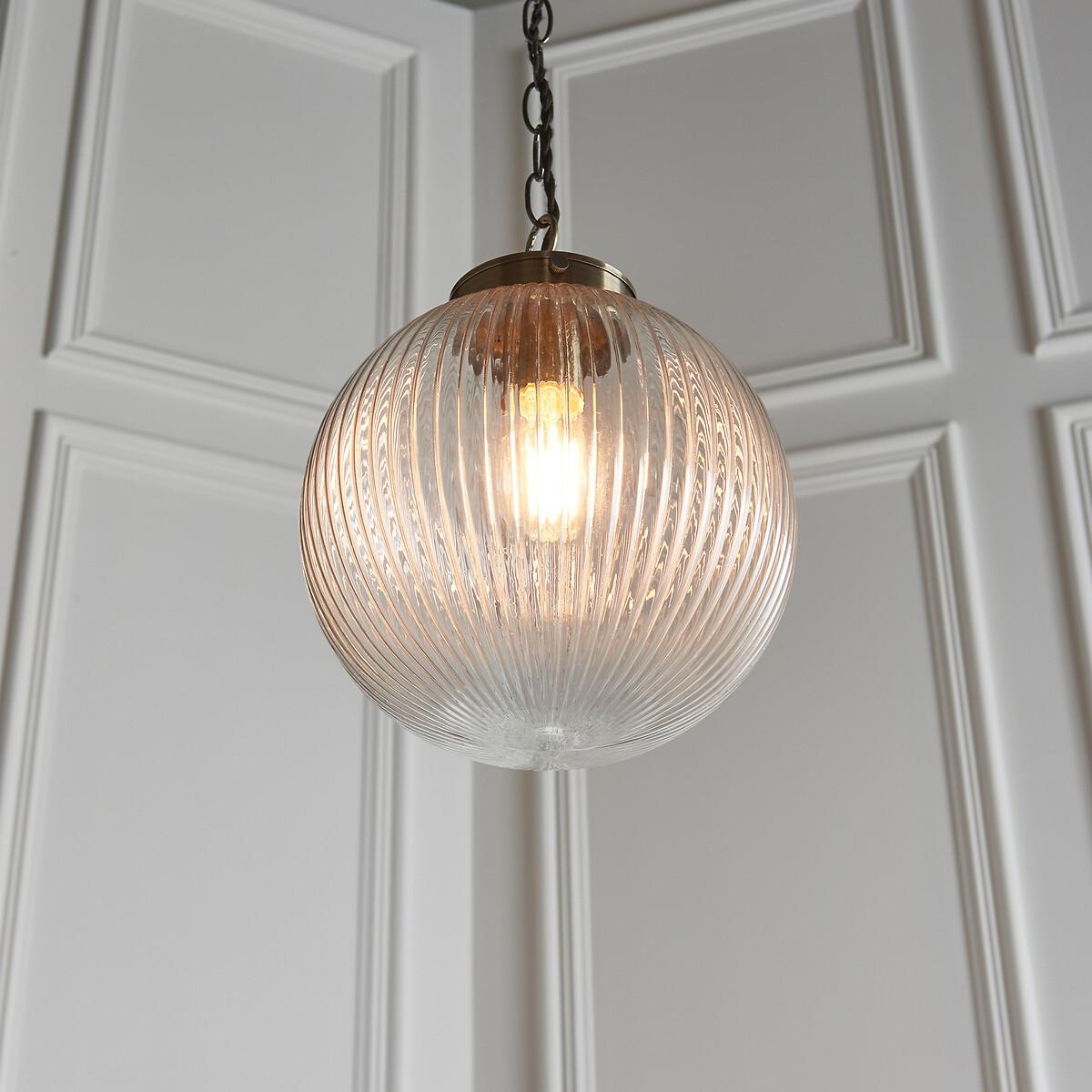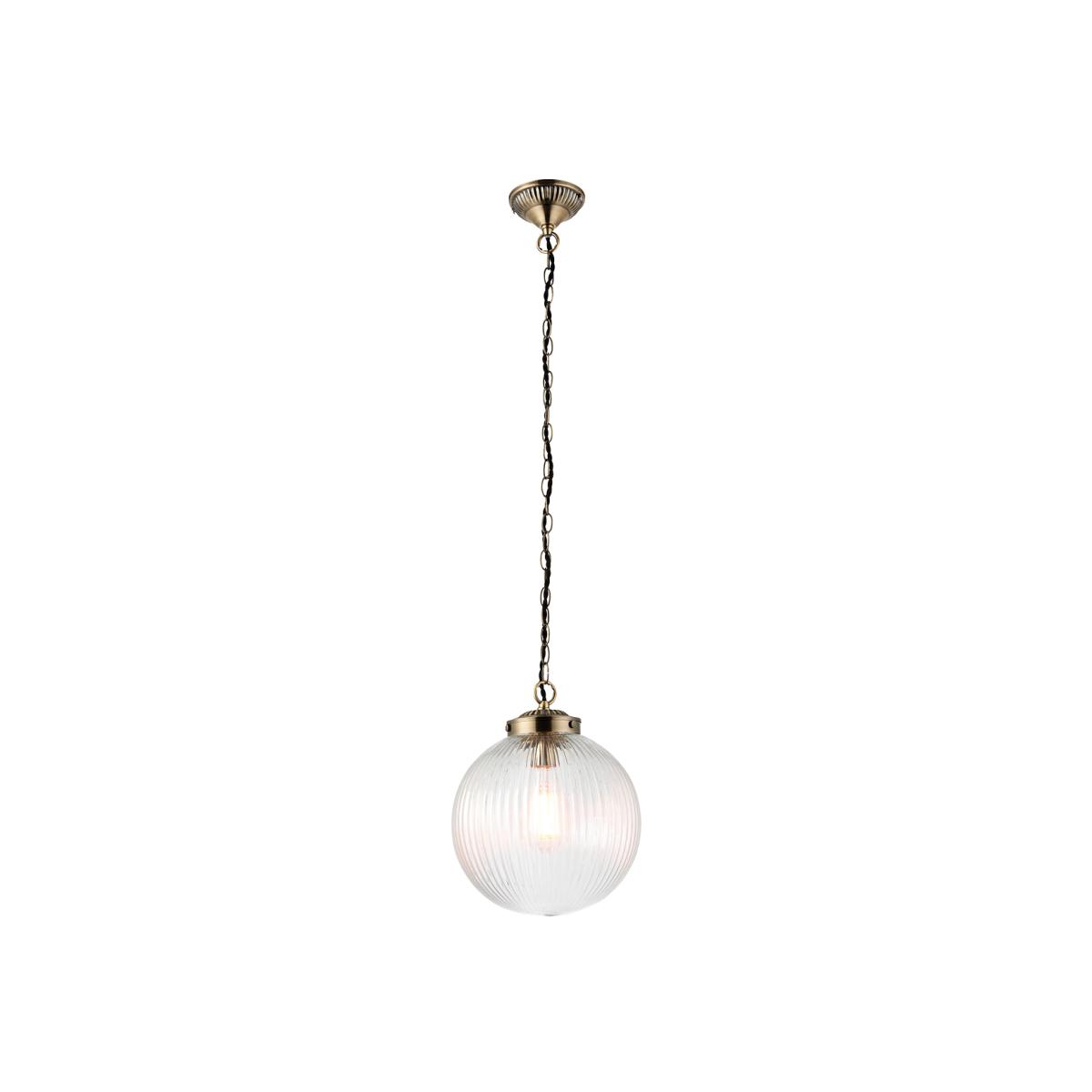 This ceiling pendant features a ribbed round glass shade hanging from a decorative chain finished in antique brass. Compatible with LED lamps, this fitting can also be dimmed. H40 X W25CM.. This product will be dispatched by one of our trusted suppliers. You’ll be contacted by their selected courier about your delivery.
