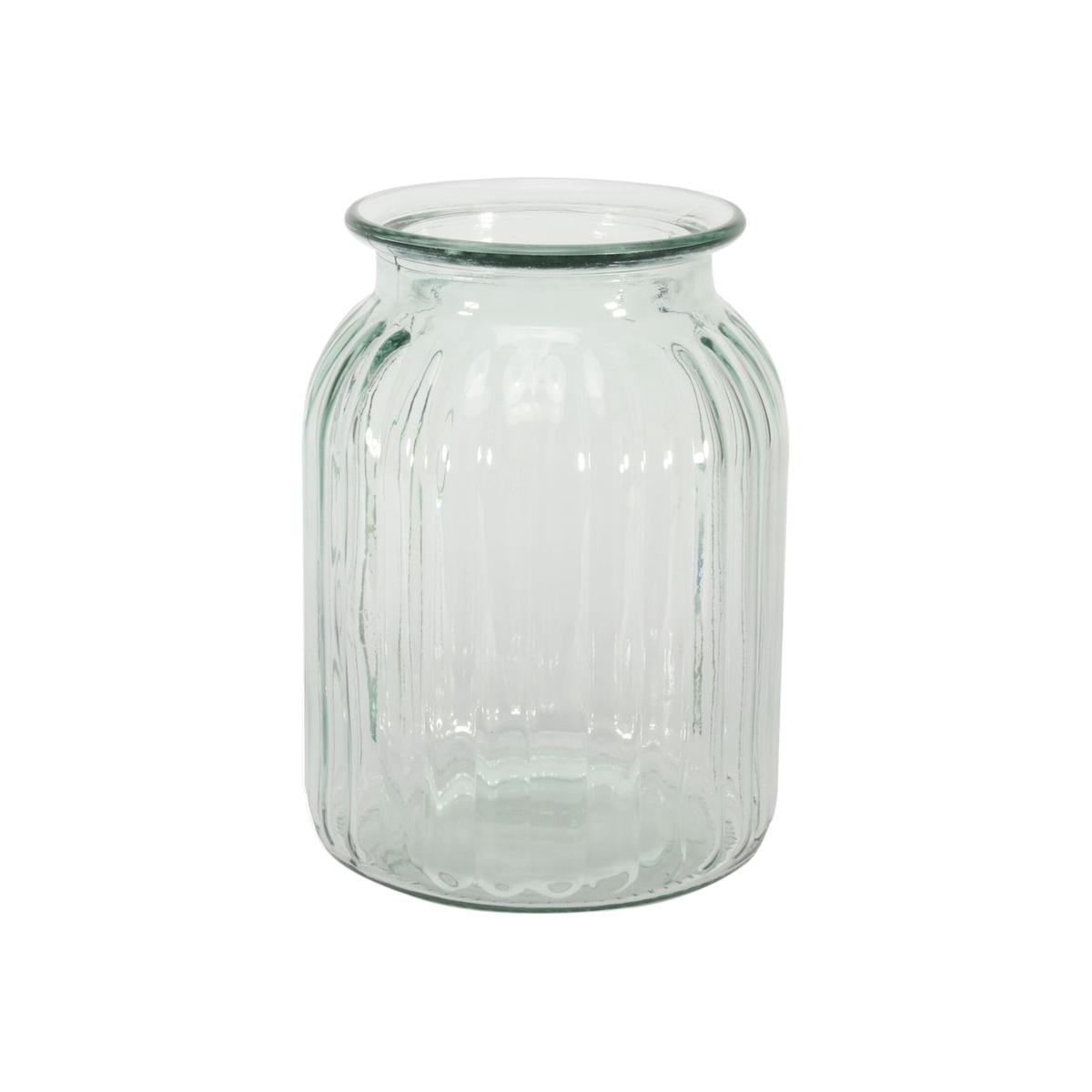 This glass ribbed jar vase is a beautiful addition to your home decor. Its unique ribbed design lends an elegant and sophisticated touch to any living space, making it the perfect accent piece. Perfect for flowers or other decorations.