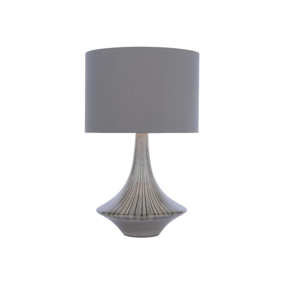 Contemporary table lamp boasting an elegant striped base complete with a grey lamp shade.. Height: 51cm. Width: 32cm. Maximum Wattage: 60w. Light Bulb: 1 x E27 Light Bulb (Not Included). Add a touch of sophistication with the Ribbed Grey Table Lamp. This contemporary styled lamp has a modern striped base and sleek grey shade, making it perfect for living rooms, bedrooms and hallways.