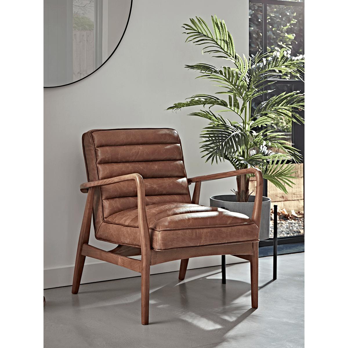 I’m a big fan of this tan ribbed leather chair for its clean lines and warm, lived-in finish. Its slim wooden frame and simple channelled upholstery make it a versatile piece that sits comfortably in mid-century, Scandi or industrial schemes without overwhelming the room. For practical styling, pull it up beside a low wooden side table topped with a ceramic lamp, or place it under a tall houseplant to balance its angular silhouette. A soft woollen throw or a textured linen cushion will soften the leather and create a cosy reading nook.