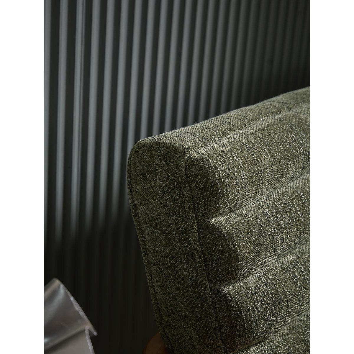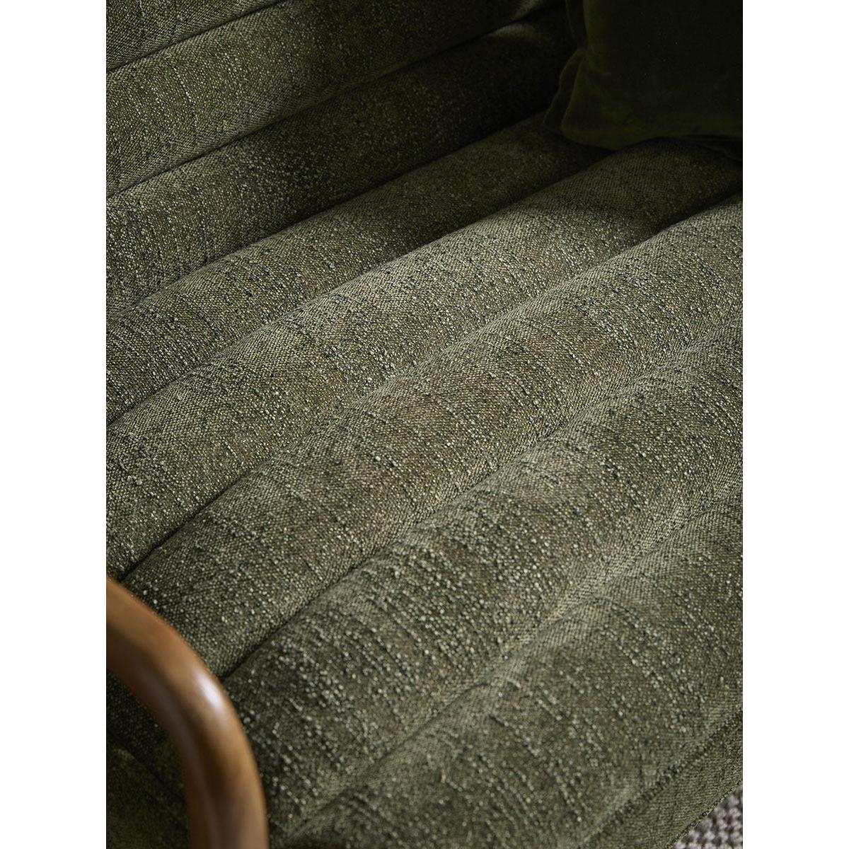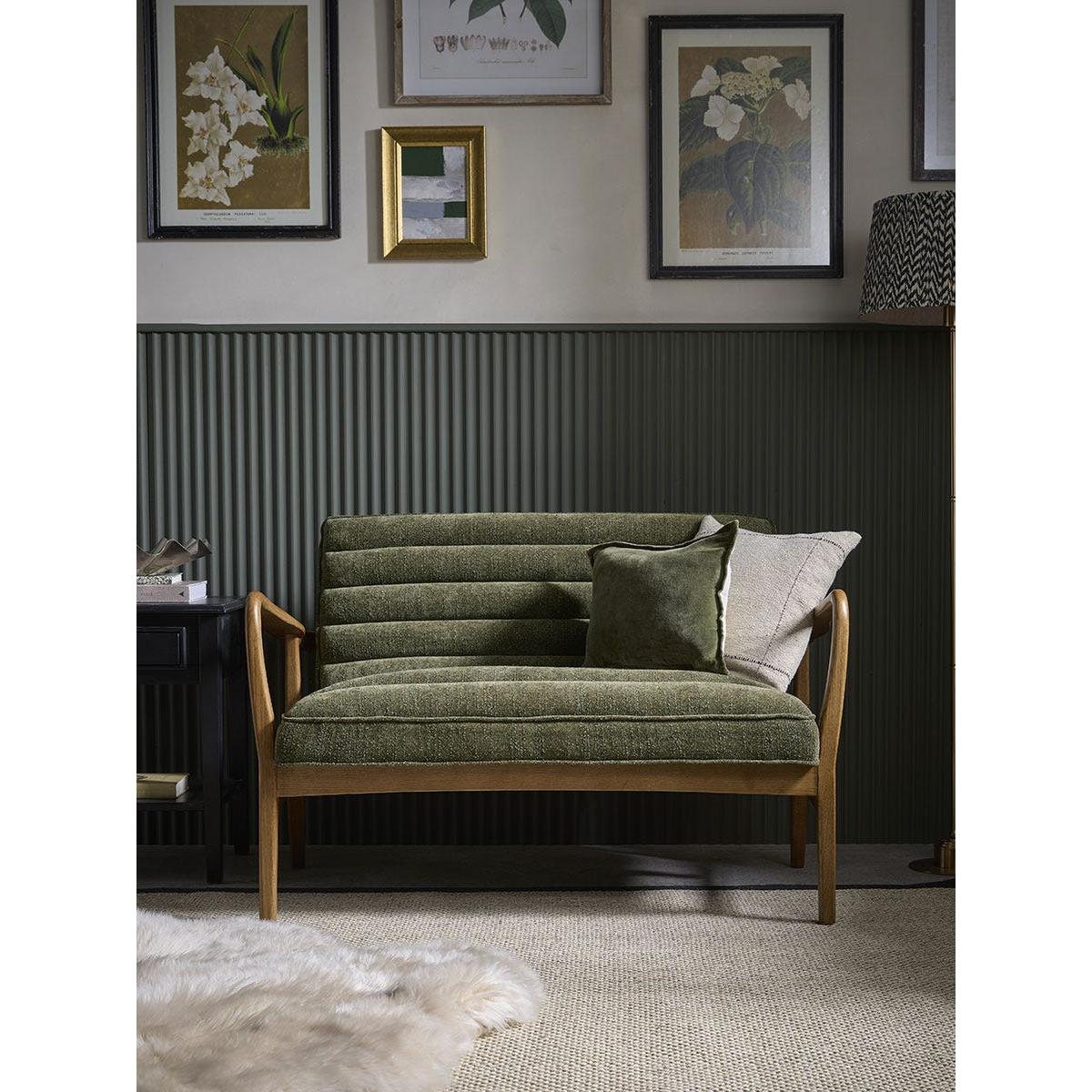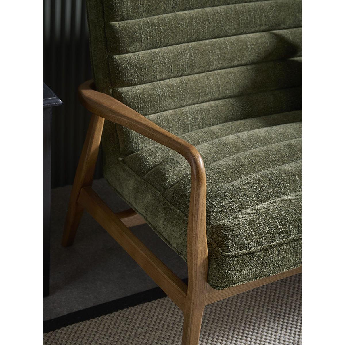 Soft, curvaceous lines work with the warming oak to create a modern silhouette in this mid-century sofa. With a foam-filled seat pad that is covered in a ribbed, deep green polyester, it provides plenty of comfort and style to a living space that embraces contemporary living.