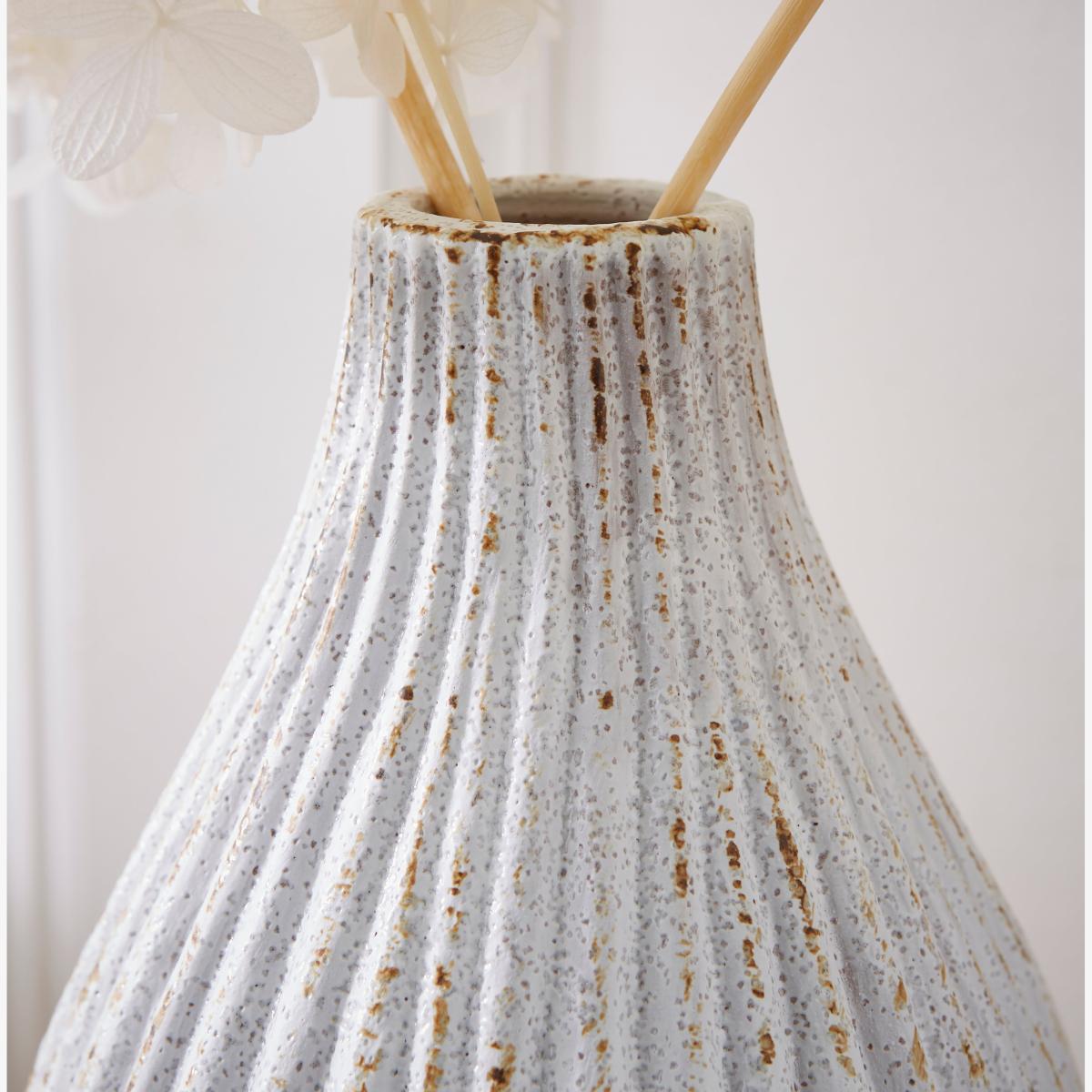 I love this ribbed stone bottle in its concrete-effect finish-it's a great combination of texture and understated colour that adds visual interest without overwhelming a space. It works particularly well in minimalist or industrial interiors, where its raw finish complements other natural materials like wood or metal. For practical styling, try pairing it with a few simple, fresh florals or dried stems to keep the look modern and fresh. This vase's size and shape make it versatile for both table centrepieces and shelf displays. Keep accessories minimal around it to let its sculptural form stand out or group it with other neutral-toned decor for a cohesive, relaxed look.