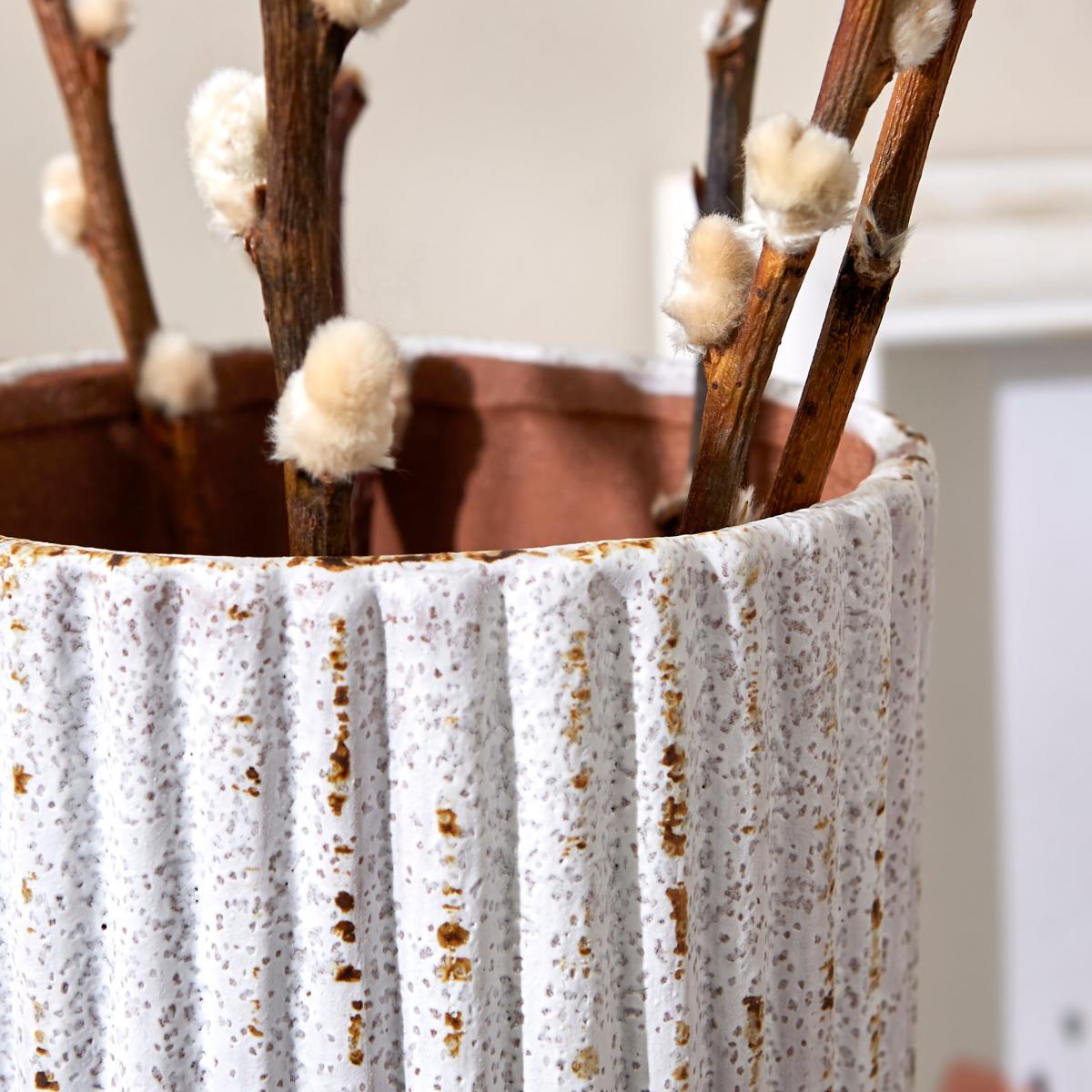 I love this ribbed stone vase for its contemporary take on a rustic aesthetic, thanks to its concrete effect and textured design. It works particularly well in modern, industrial, or minimalist interiors, where the rough finish adds a layer of visual interest without overwhelming the space. For practical styling, I suggest pairing it with a mix of natural branches or dried flowers for an effortless look, or place a few statement blooms inside to add colour and vibrancy. Its sturdy build makes it ideal for creating a focal point on sideboards, mantels, or dining tables, and it can seamlessly blend with both neutral and earth-toned palettes. Overall, it's a versatile piece that adds tactile charm while maintaining a sleek, modern edge.