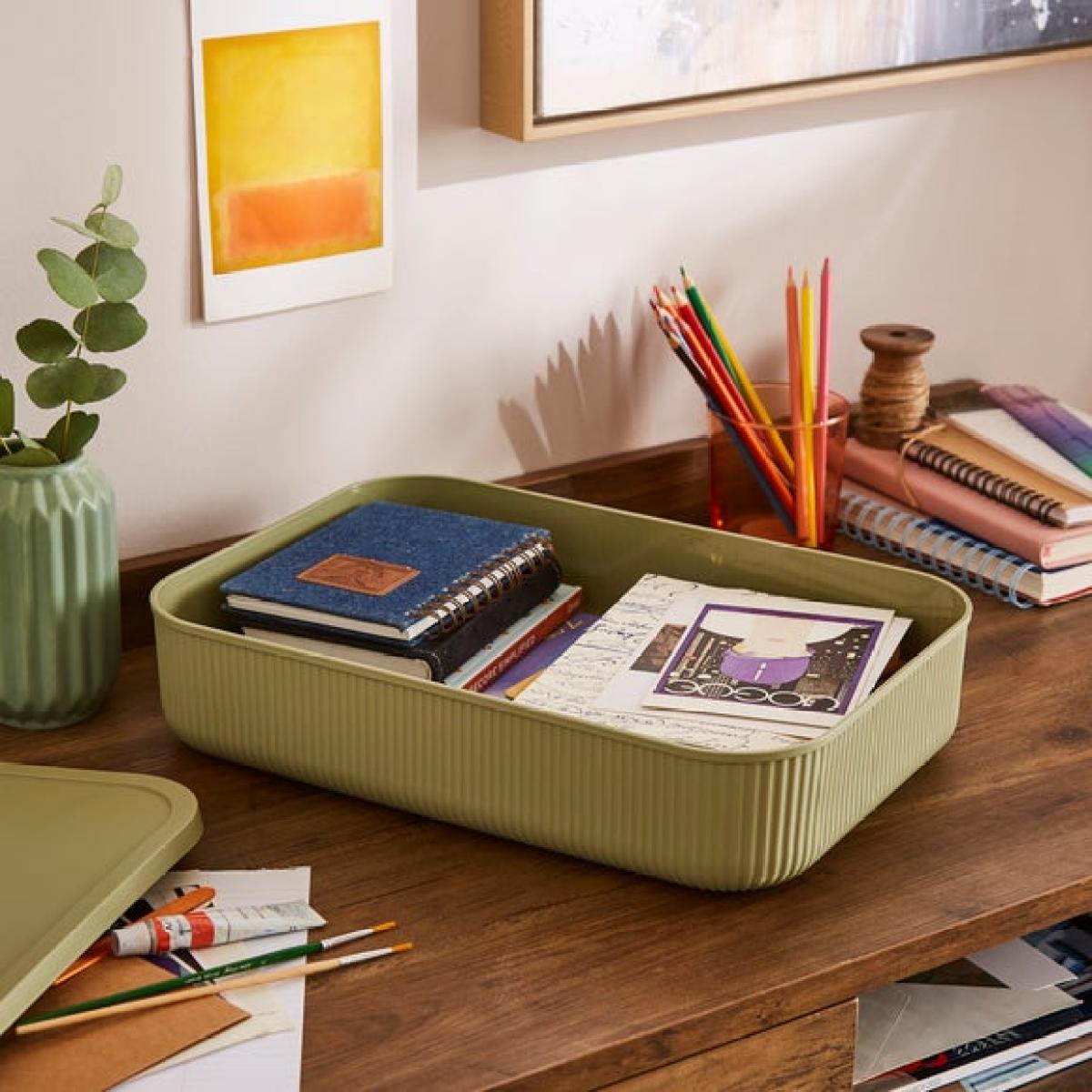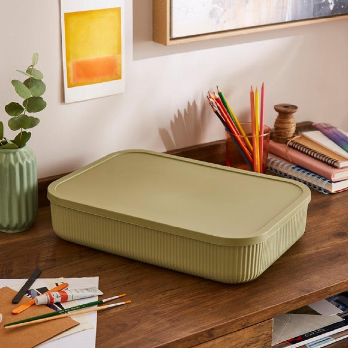 * Ribbed texture * Handles on either side * Available in a range of colours and sizes Keep your home neat and stylish with our Ribbed Storage Box with Lid. Designed with a chic ribbed texture and handy side handles, it’s as easy to move as it is to love. Available in a range of colours and sizes, it’s perfect for organising everything from stationery, to toys to towels while adding a touch of modern charm to any room.