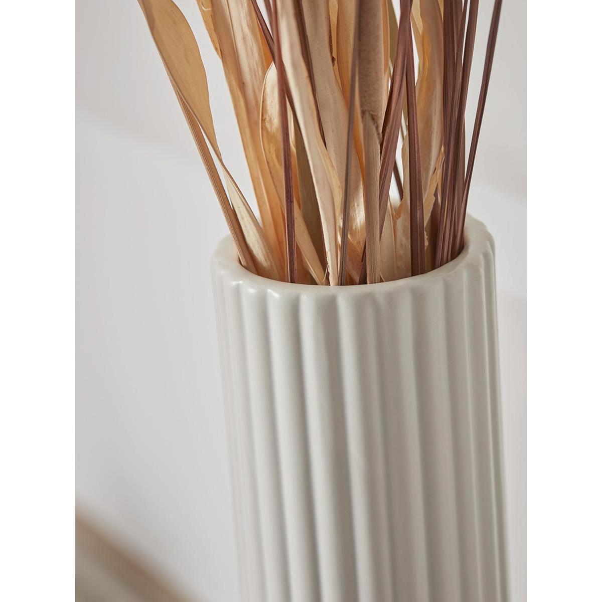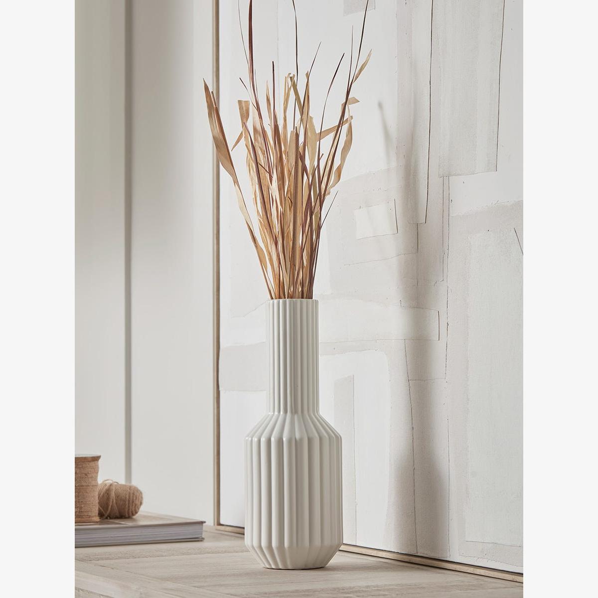 I love this tall ribbed vase for its clean, sculptural profile and subtle textural detail, making it a versatile piece in contemporary and minimal interiors. It works well as a standalone statement on a console or side table, or as part of a larger arrangement of dried stems or seasonal florals. To maximise its impact, keep the colour palette neutral or earthy to preserve its calm and understated elegance. Practical styling tips include pairing it with similar textured accessories for a cohesive look, or using it to highlight architecture within a room by placing it against a neutral wall. Its height and design make it ideal for creating visual interest without overpowering smaller spaces.