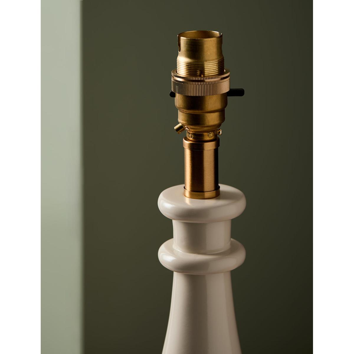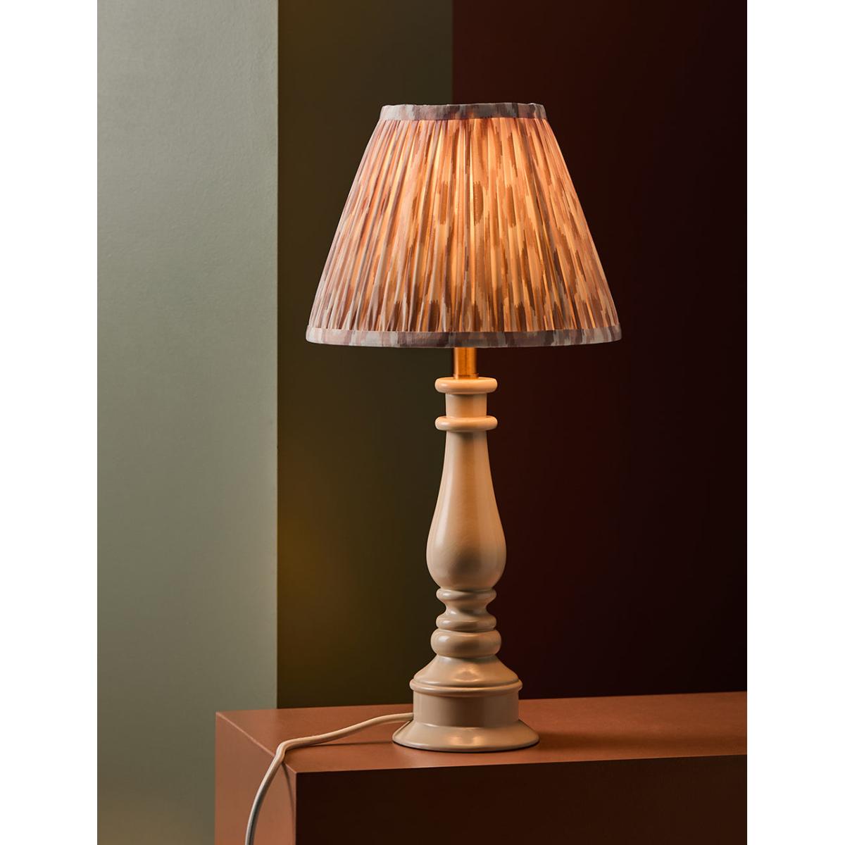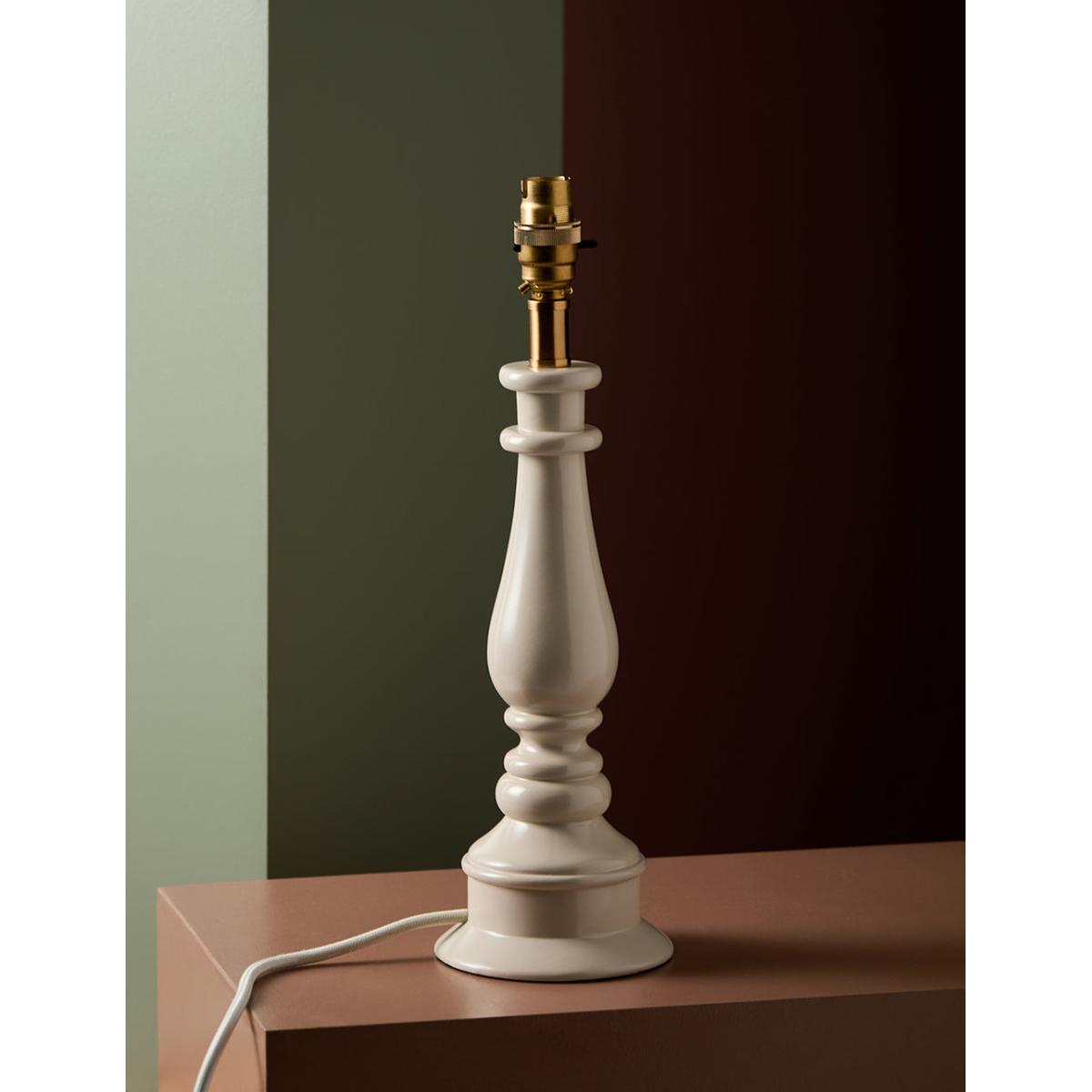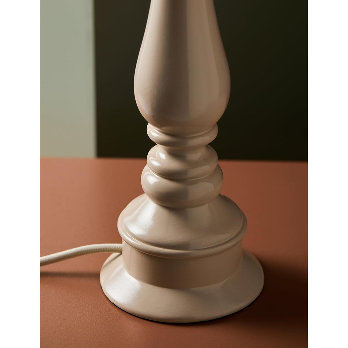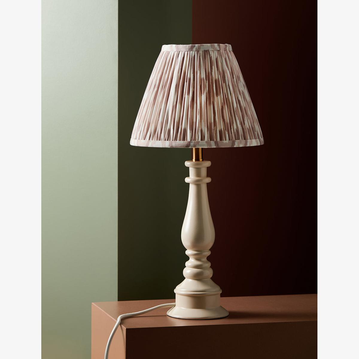A painted turned lamp in a soft chalky white. It's coordinating cable and glossy finish makes this a really charming piece. Lovely with a matching OR contrast shade and would make a superb bedside lamp. Styled here with our Ida Ikat Print Shade in Natural Medium A painted lamp base in a chalky white colour.