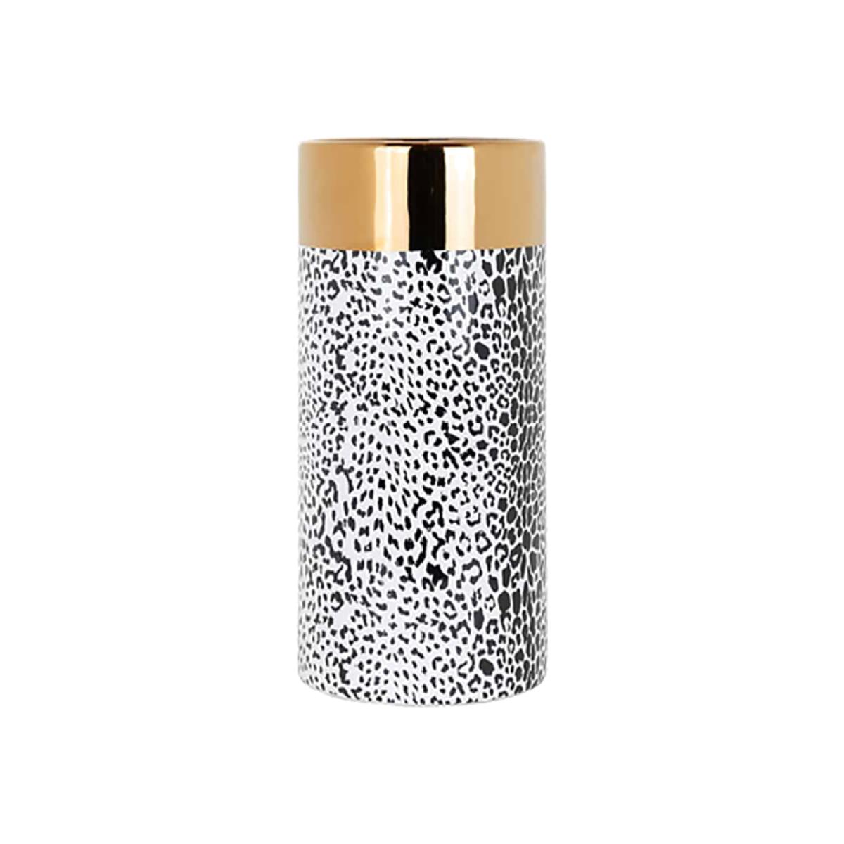 The dazzling Richmond Alesha gold vase is 30cm high and 14cm in diameter. With a black and white leopard print pattern and a gold rim at the top, this exquisite piece will look just as fantastic wi. View More. The dazzling Richmond Alesha gold vase is 30cm high and 14cm in diameter. With a black and white leopard print pattern and a gold rim at the top, this exquisite piece will look just as fantastic without a floral arrangement as it will when holding beautiful blooms. Black and white, even with a pattern, will complement any existing décor without the need to make changes to accommodate it in your chosen room. The pattern simply makes the piece much more interesting and capable of adding interest at times when it is not required to serve its function and hold a floral arrangement.