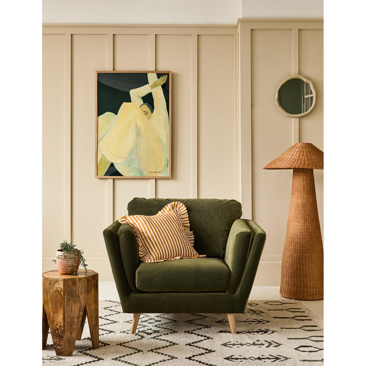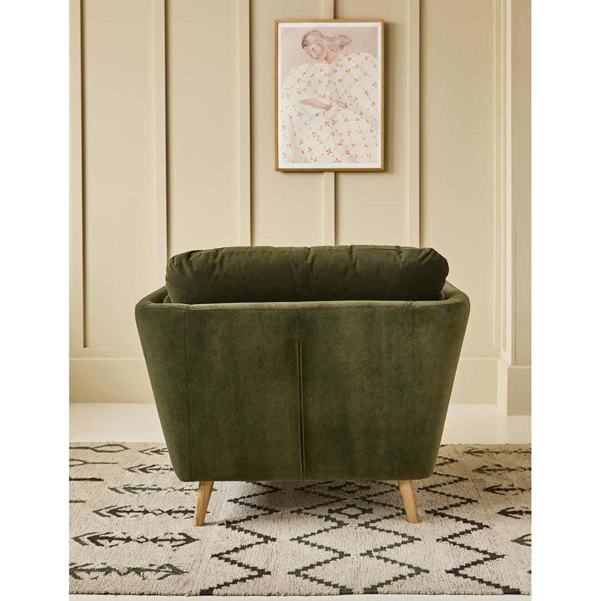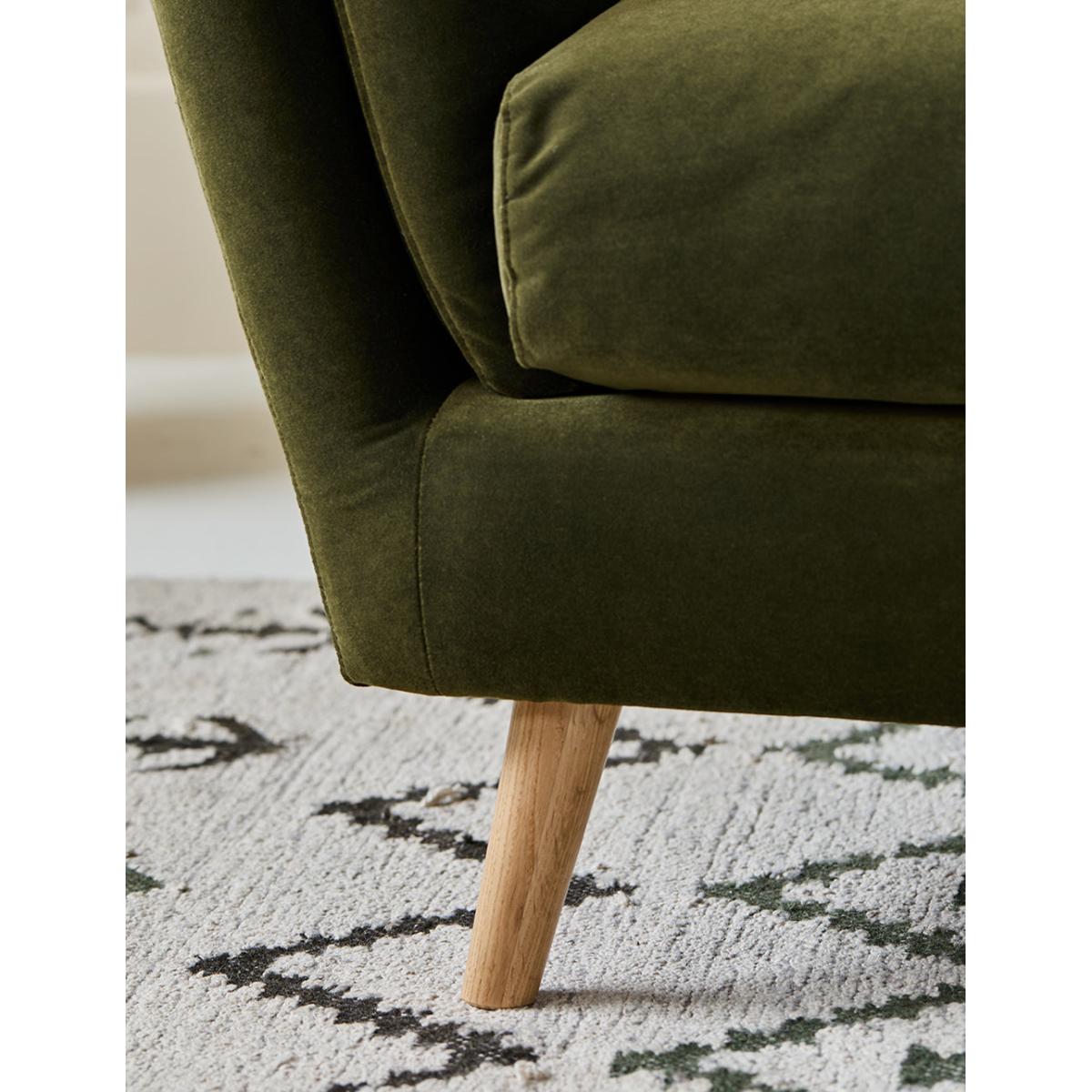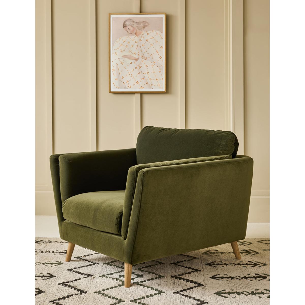The perfect accompaniment to the matching sofa, footstool and corner sofa, the Richmond armchair is available in two sizes. The snuggler (photographed here) is perfect for a cosy love seat or if you fancy a little extra space to lounge. Alternatively, we also offer the armchair in a smaller size that is perfect for small corners. The armchair features the same comfy cushions and streamlined silhouette as the matching sofa, with a distinct nod to 1970’s designs. Photographed here in the Love Seat Size in Classic Velvet Pine Green. The leg colour in the photograph is Bleached Oak. We have 1 Richmond Armchair in classic velvet pine green with legs in shade bleached oak- please get in touch for pictures and more information.