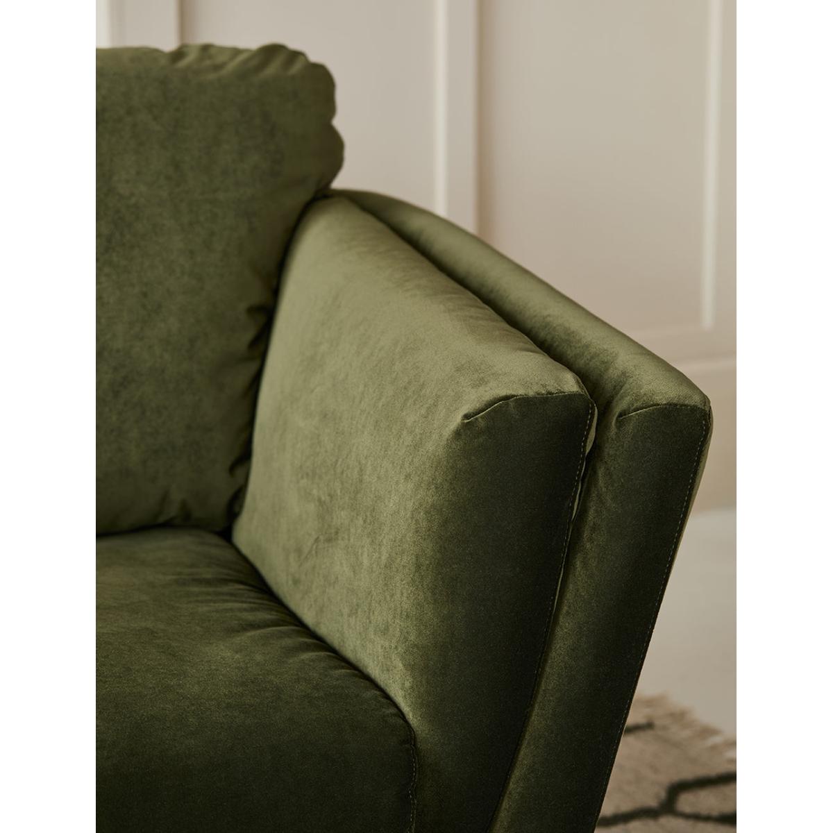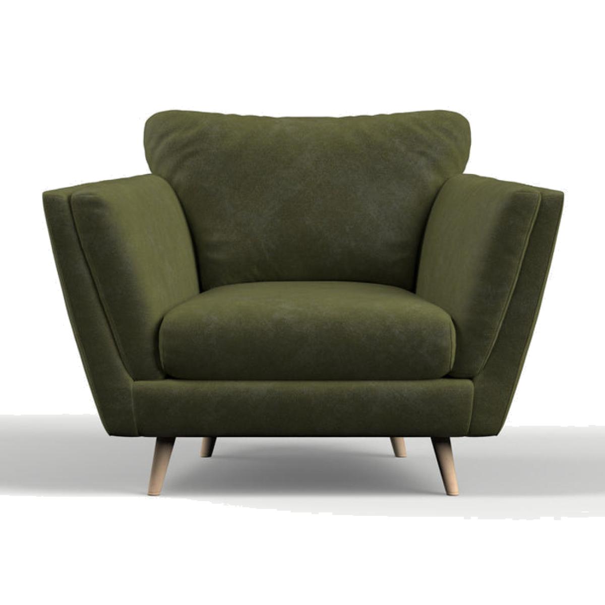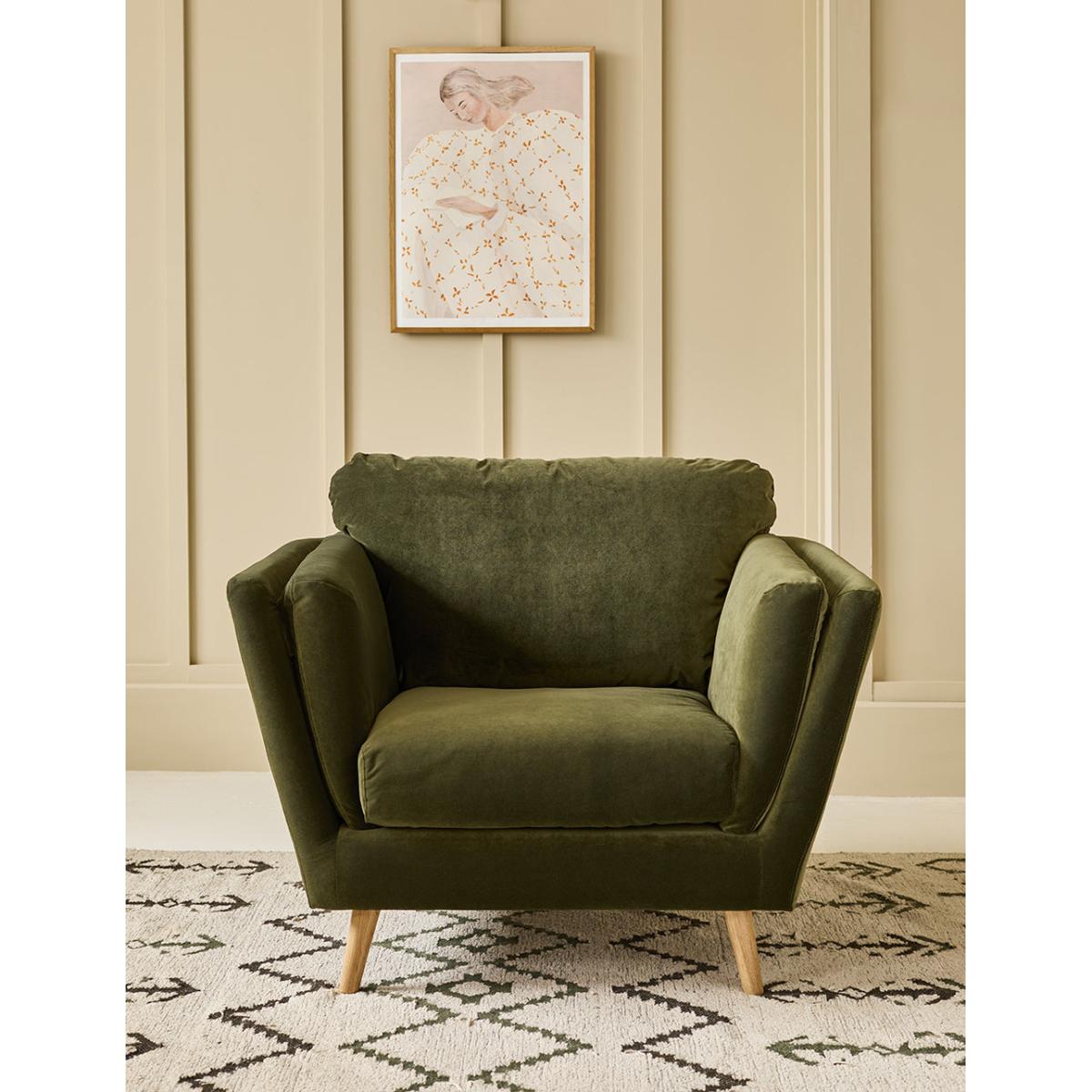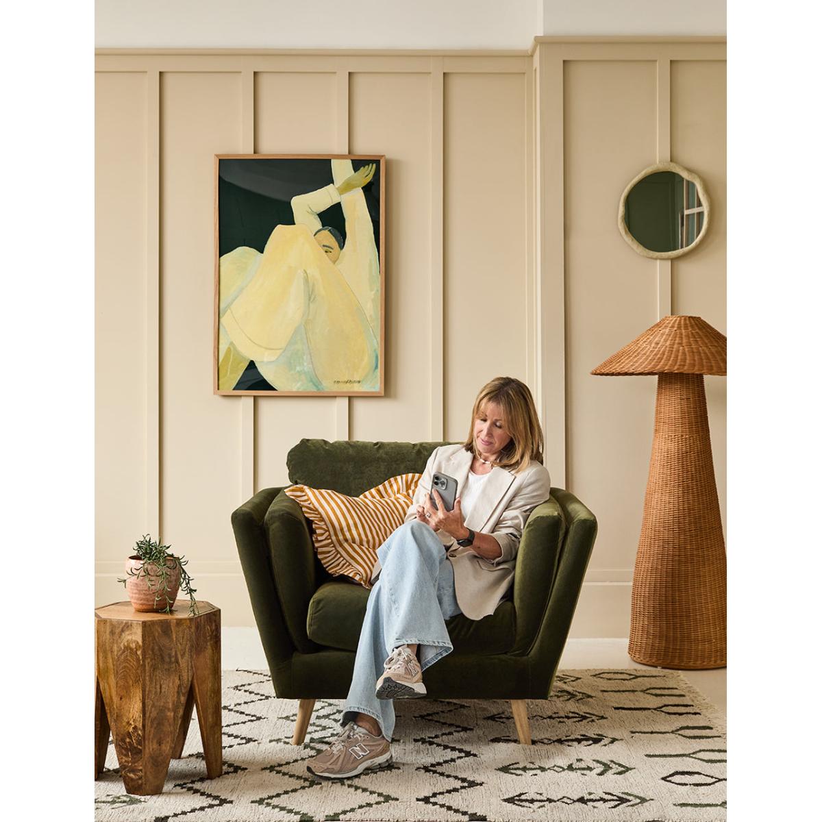 The perfect accompaniment to the matching sofa, footstool and corner sofa, the Richmond armchair is available in two sizes. The snuggler (photographed here) is perfect for a cosy love seat or if you fancy a little extra space to lounge. Alternatively, we also offer the armchair in a smaller size that is perfect for small corners. The armchair features the same comfy cushions and streamlined silhouette as the matching sofa, with a distinct nod to 1970’s designs. Photographed here in the Love Seat Size in Classic Velvet Pine Green. The leg colour in the photograph is Bleached Oak. We have 1 Richmond Armchair in classic velvet pine green with legs in shade bleached oak- please get in touch for pictures and more information.