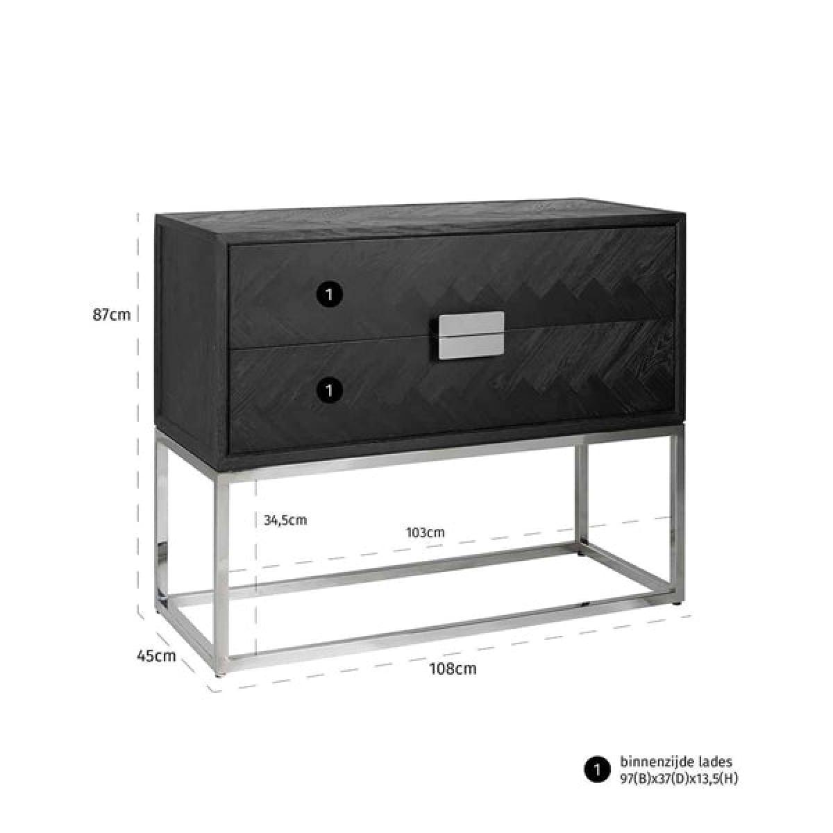 Enjoy the practicality of versatile storage without sacrificing your style credentials with the Richmond Blackbone two-drawer silver chest of drawers. This handsome piece combines classic oak with a contemporary blackened finish and is set in a gleaming steel frame for a look that is at once bold and elegant. The natural beauty of the wood is allowed to shine through, making this Blackbone silver chest a sophisticated choice for a dining room, living space, bedroom or hallway. It can be put to use in a range of ways, from storing clothing or papers to being part of your media suite. *Moot Trading Ltd is not a lender and acts only as an introducer. The credit product is provided by Klarna Bank AB (publ). Credit is only available to permanent UK residents aged 18 and over, subject to status. Terms and conditions apply. Please note that the following products are not regulated by the FCA: Pay in 30 days and Pay in 3 instalments. Read More.